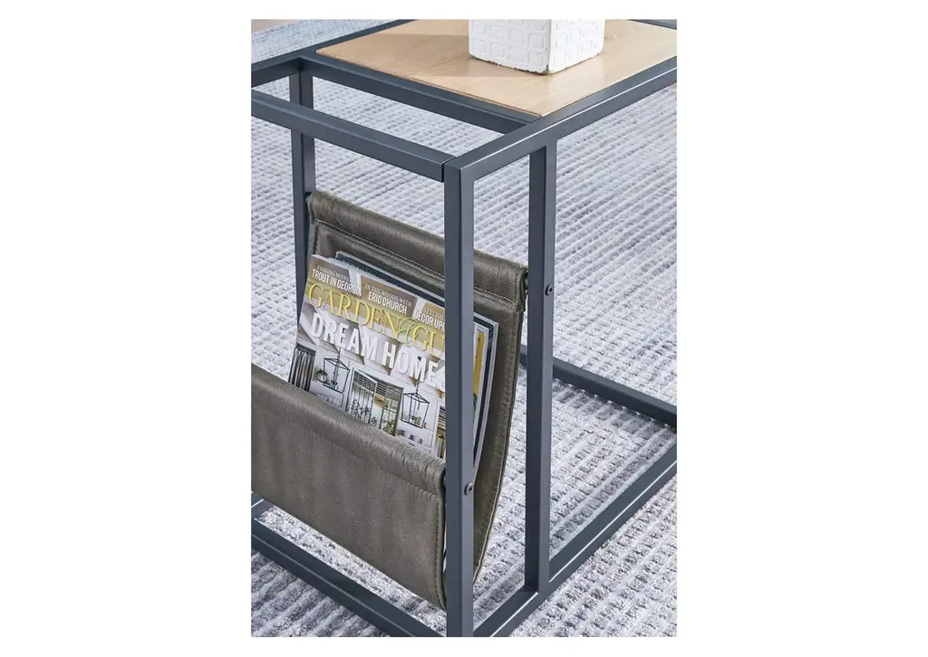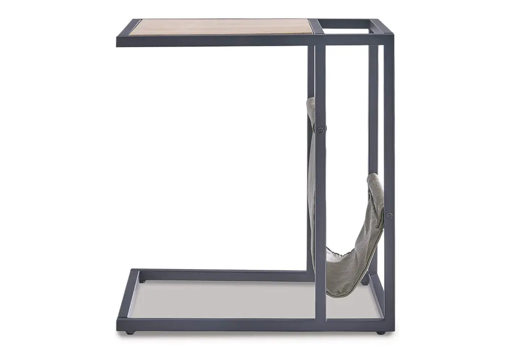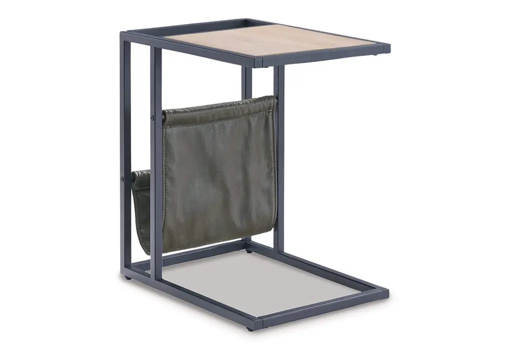Casual contemporary design with a clean silhouette. That's the beauty of the Freslowe chairside end table. Quality crafted with elm veneer, its tabletop is finished in a light natural wood tone that lends a fresh, organic look. Cool metal C-frame in a matte black finish and a hanging magazine basket made with a durable brown faux leather coordinate beautifully with the less-is-more profile. Weight 16.000 lbs. (7.2kgs.)