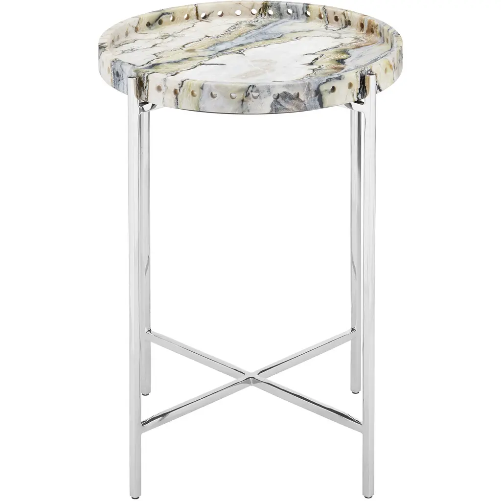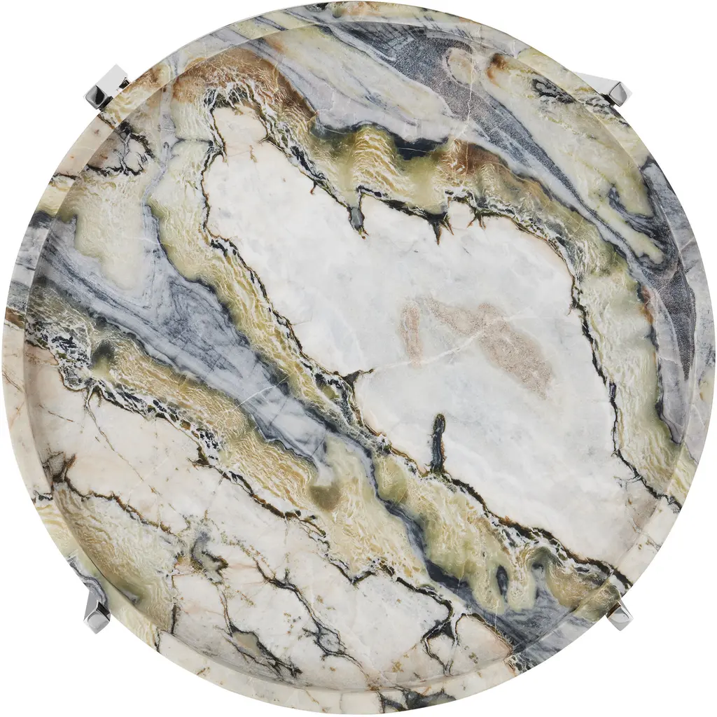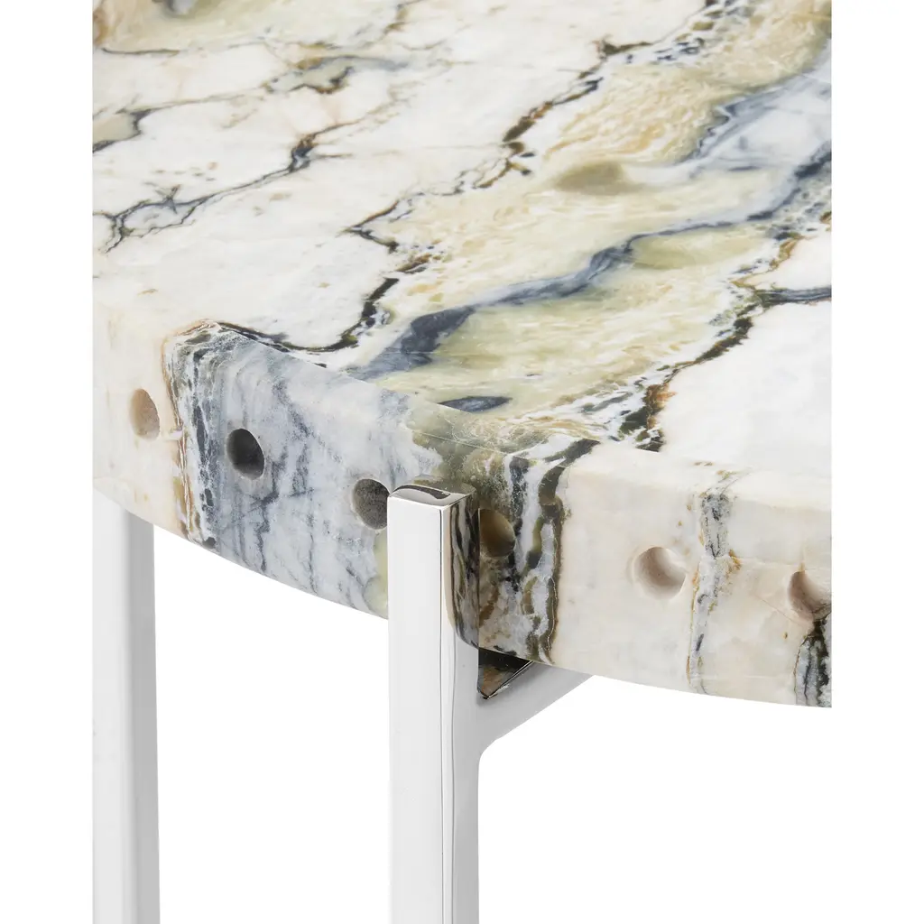 The Freya Floral Marble Accent Table is a striking decorative piece that highlights the natural beauty of flower jade marble with its wildly bold markings and flowing waves of color. The meticulously drilled outer rim is showcased when the top is slid into the minimal metal base in a polished nickel finish. There will be significant variations from piece to piece given the material from which it is made.