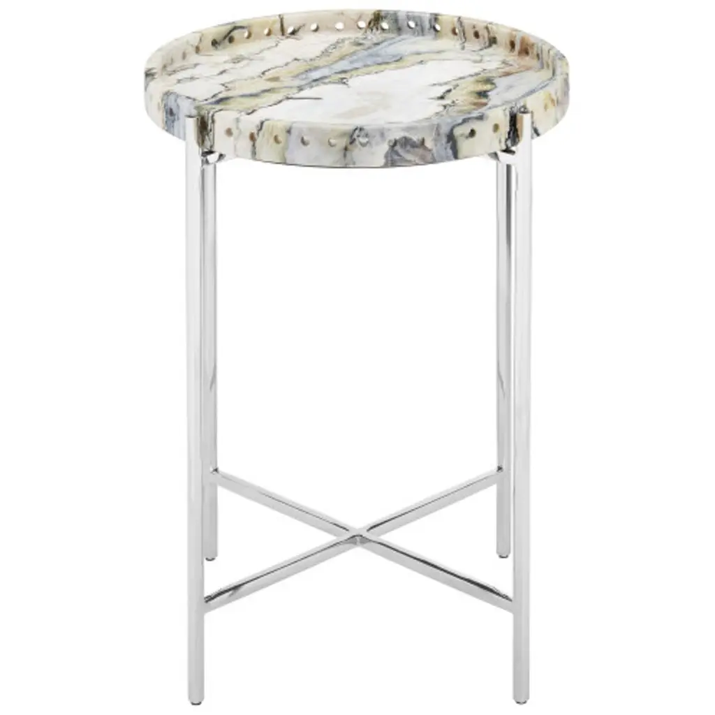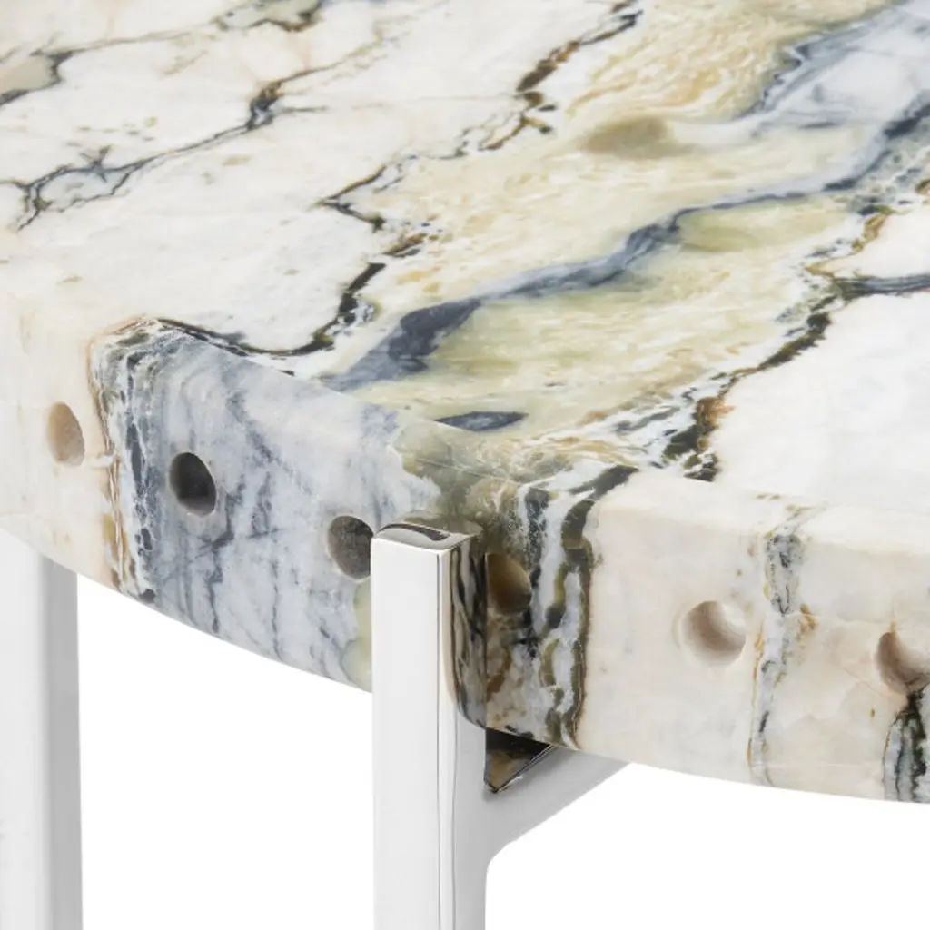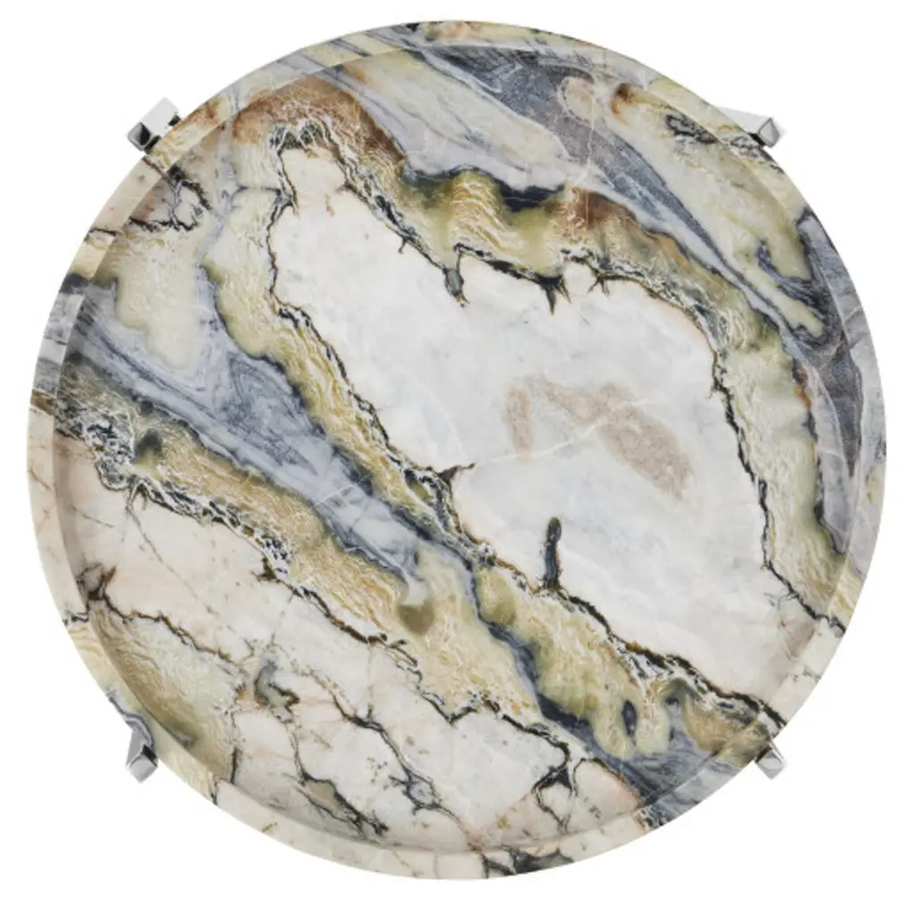 The Freya Floral Marble Accent Table is a striking decorative piece that highlights the natural beauty of flower jade marble with its wildly bold markings and flowing waves of color. The meticulously drilled outer rim is showcased when the top is slid into the minimal metal base. There will be significant variations from piece to piece given the material from which it is made.