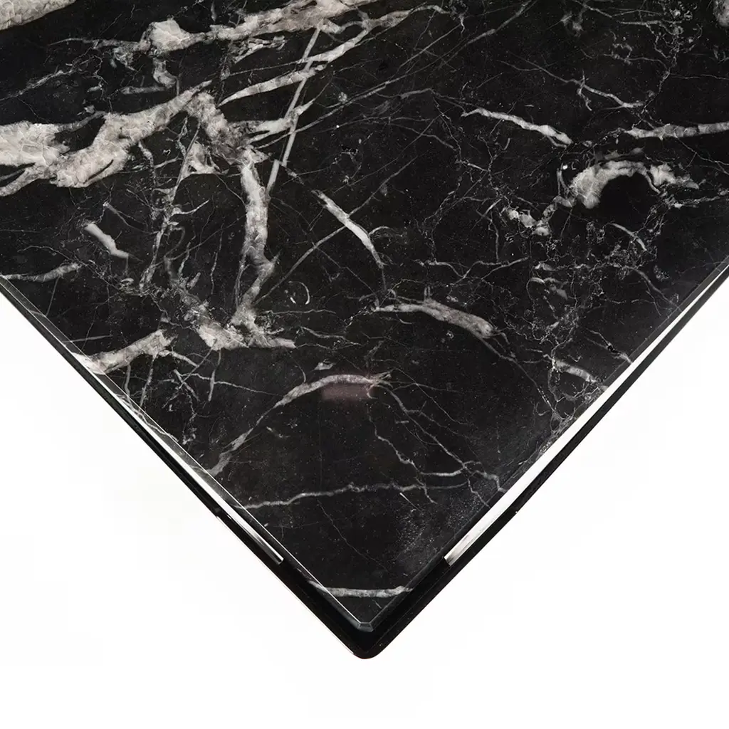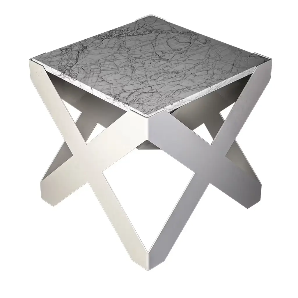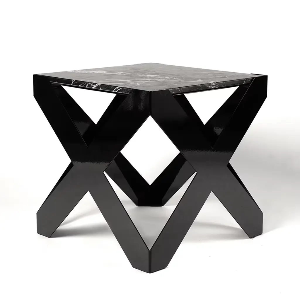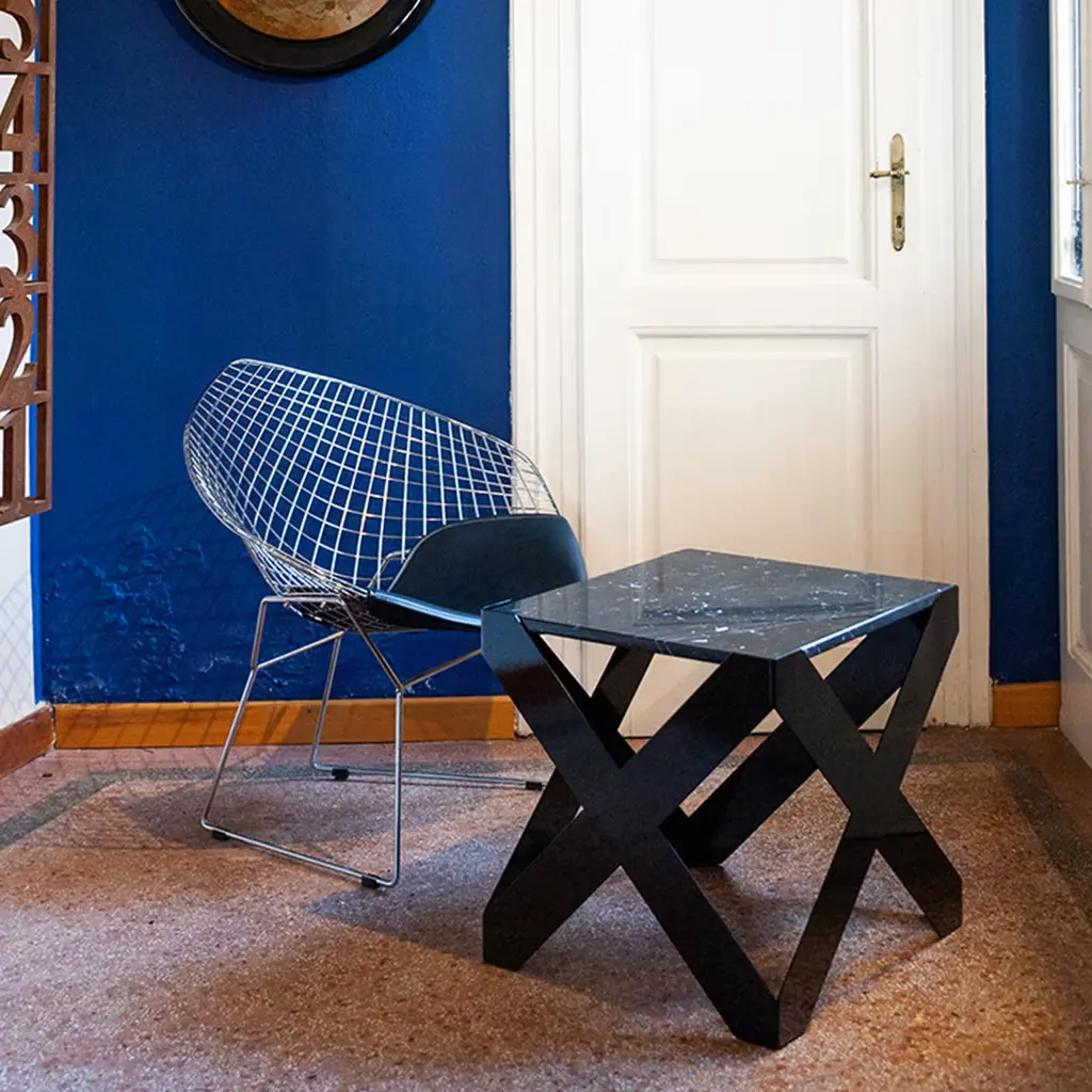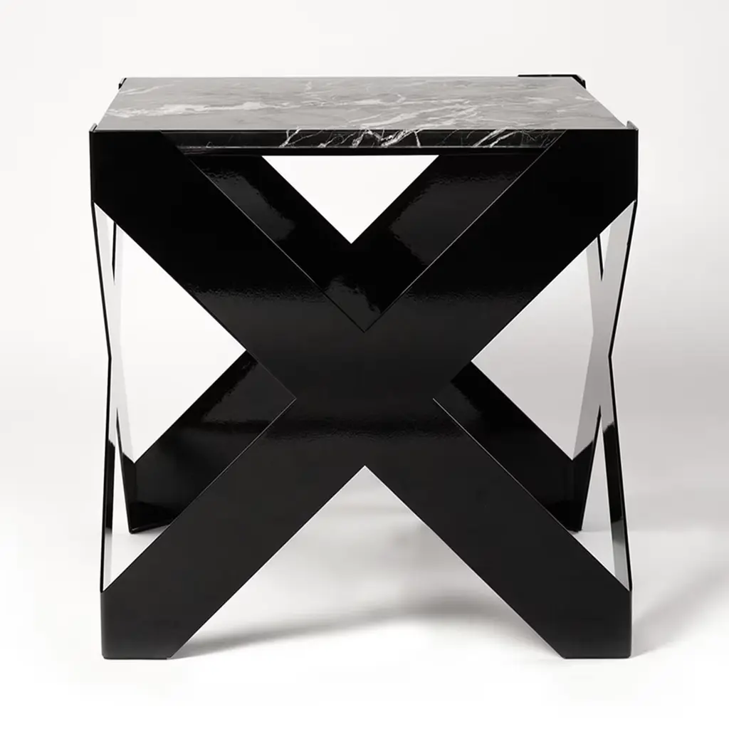 Defined by four X-shaped sides in black-lacquered bent iron brilliantly weaving into one another to symbolize both the starting point of four infinite lines, this side table will make a glorious and stately accent in a contemporary interior. The striking black Marquinia marble top completes the veritable work of art, highlighting the legs' black lacquer and contrasting their angularity with its sublime golden inclusions.