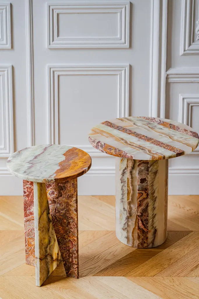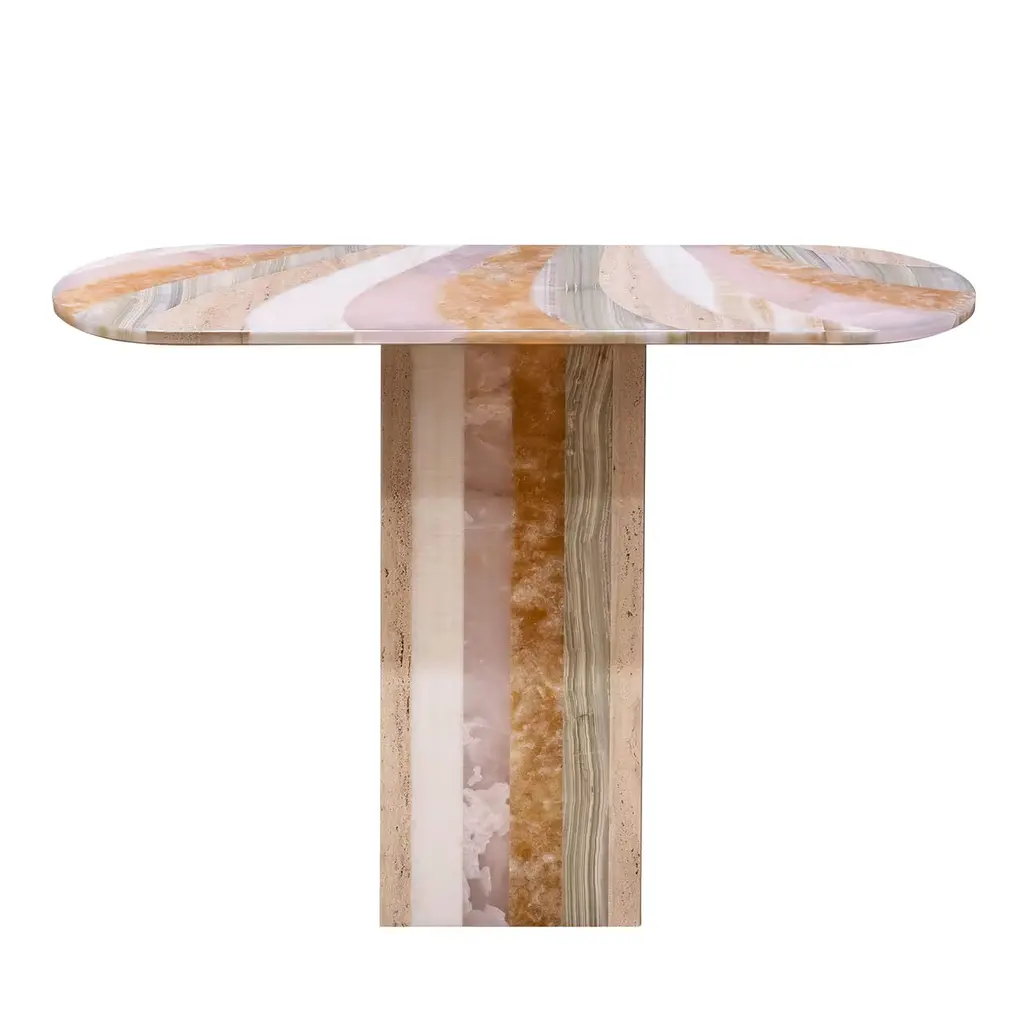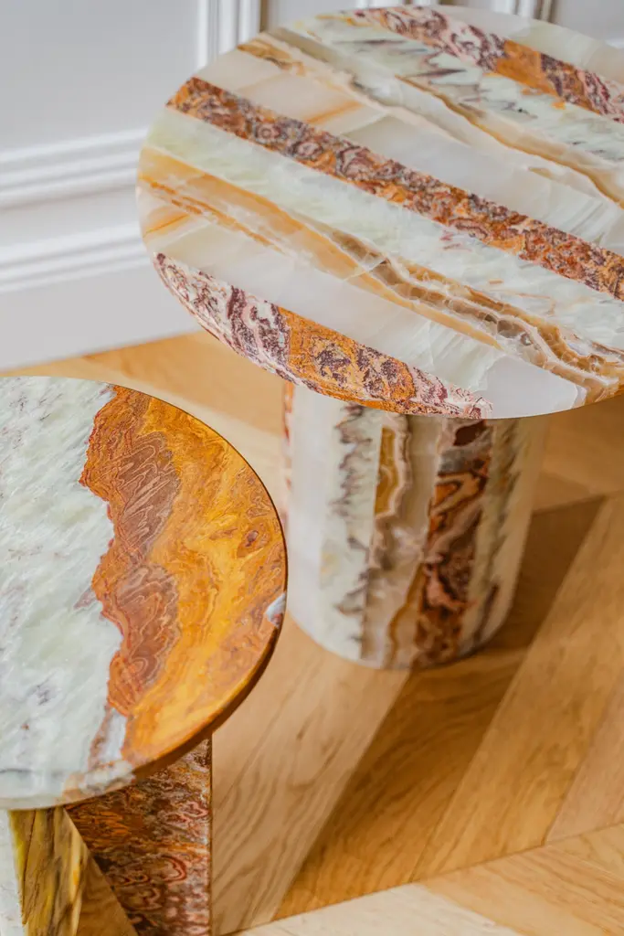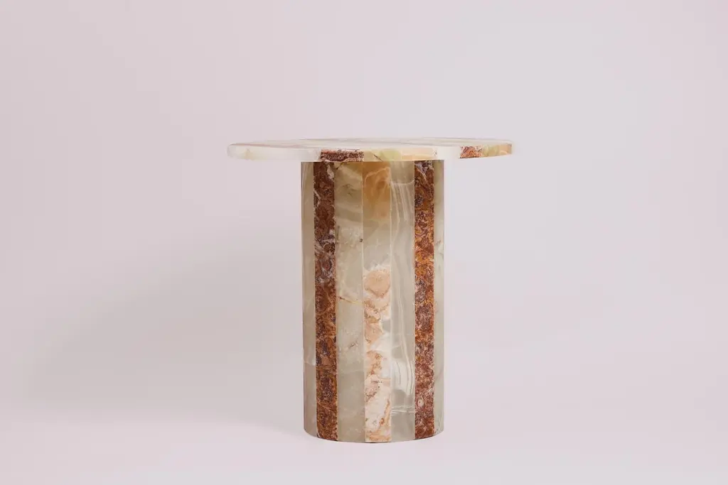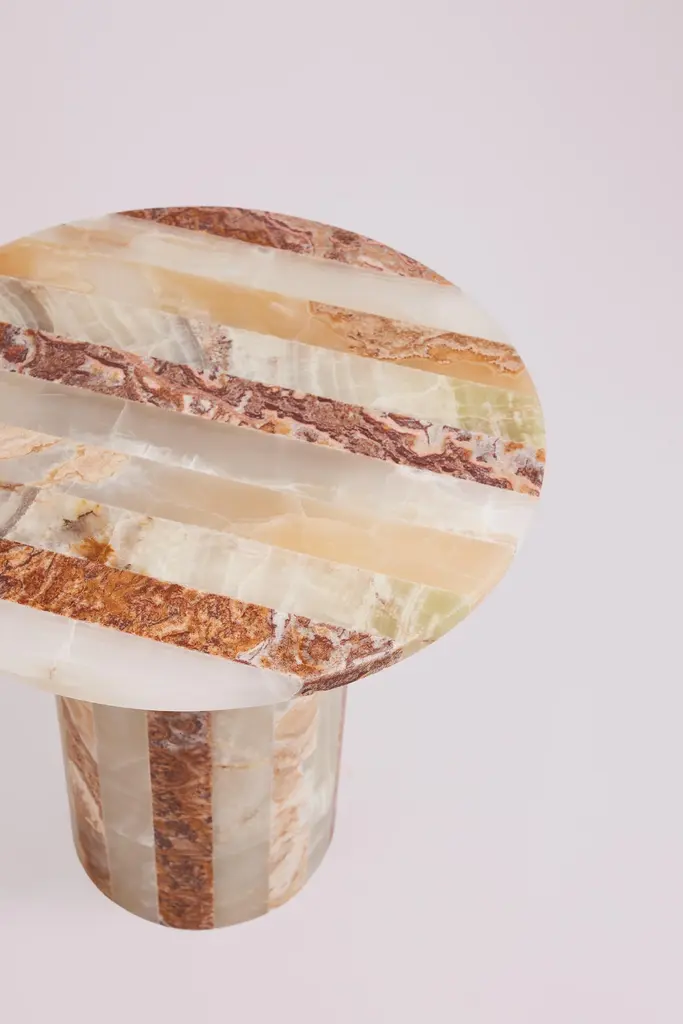 Frida Side Table by Studio Gaia ParisDimensions: ⌀ 50 x H 50 cmMaterials: White, Red, Green and Amber Onyx.The Frida Striped Onyx Side Table is a refined and elegant piece of furniture that will bring a touch of luxury to any interior. Made from high-quality natural onyx, this side table is both functional and aesthetically sharp, making it an exceptional decorative item.