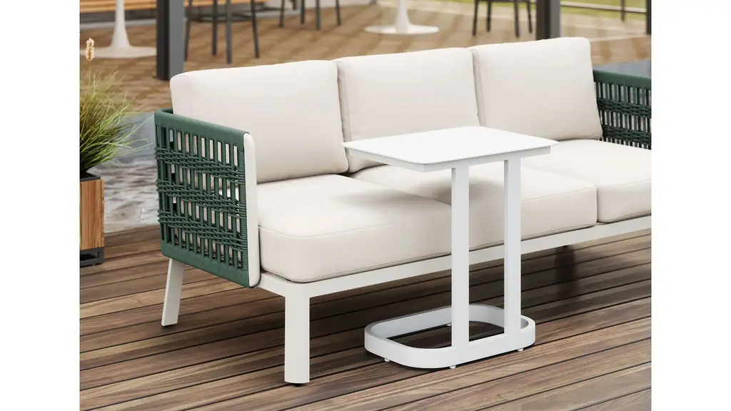 The Friss Outdoor End Table in White is a stylish and functional piece for any modern space. Constructed from aluminum, this table is perfect for both hospitality and residential use. Its sleek design and urban aesthetic make it a versatile addition to living rooms, lounges, and bedrooms.