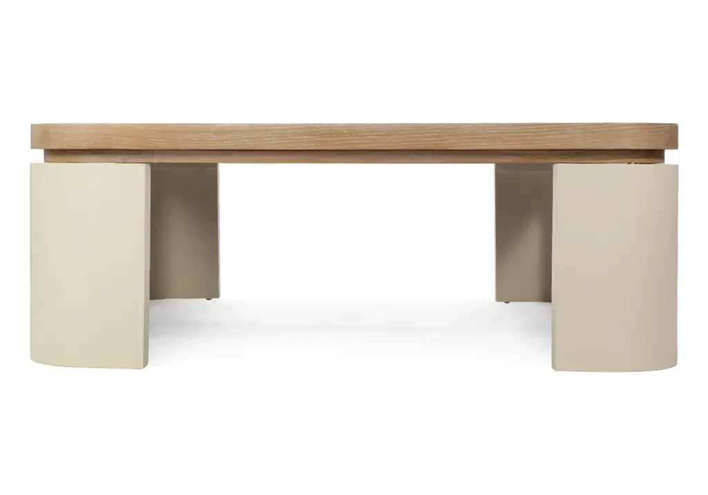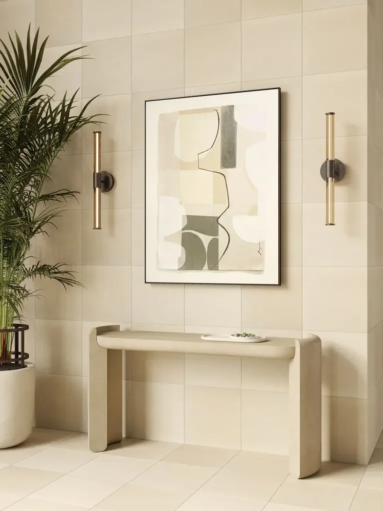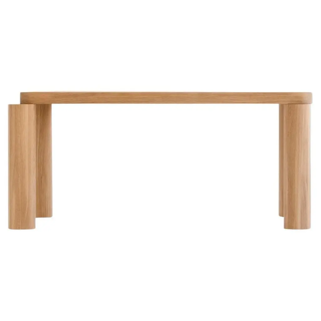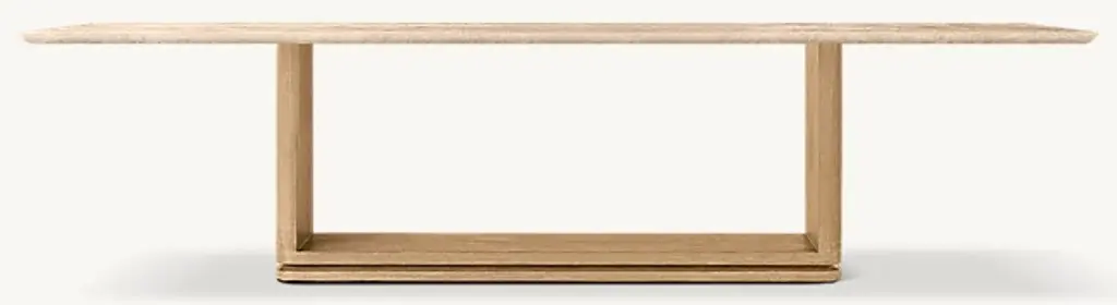 Fuente Consolle is an elliptical table made of beige, white and gray Pimar naturalstone.The top is supported by two semicircular blocks, which act as a load-bearingstructure of the coffee table.Fuente is a collection made up of low tables, side tables, and a console, designed by Studio Aretai to create islands of conviviality in home environments or contract spaces. With their monomaterial construction in Pimar Lecce stone and an elegant form evoking the trilithon archetype, these pieces embody a perfect blend of monumentality and contemporary design, fully resonating with the company’s DNA.