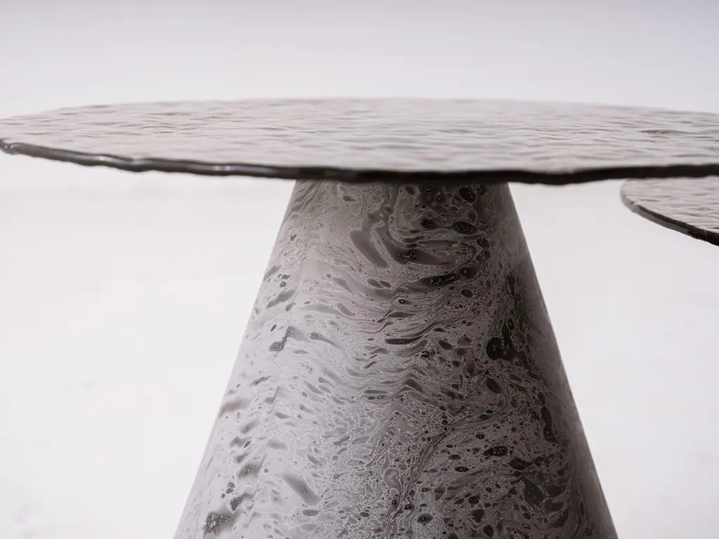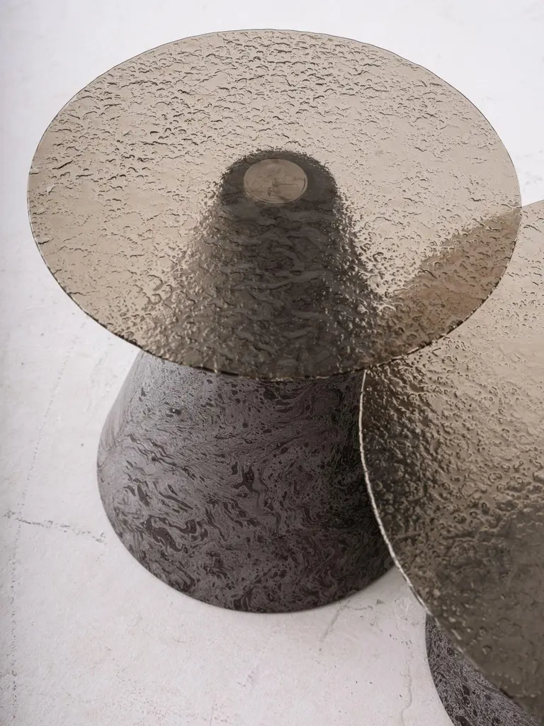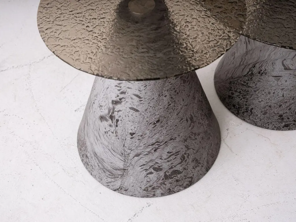 A refined blend of artistry and function — this Fusion Glass Side Table features a beautifully textured smoked glass top, bringing a sense of depth and elegance to your interior.The conical base is crafted with a dynamic marble-effect surface, offering a modern sculptural look with natural stone aesthetics. The rich textures and sophisticated color tones make this piece an eye-catching accent in any room, from contemporary living areas to upscale bedrooms.Perfectly proportioned for use as a side table, nightstand, or decorative display table.Dimensions:•Diameter: 45cm (custom sizes available)•Height: 45 cm (custom sizes available)Materials:•Top: Fusion textured glass, smoked finish•Base: Solid composite with marbled finishCondition:Brand new. Each piece is individually handmade, resulting in unique surface patterns and tonal variations.Custom orders welcomed.