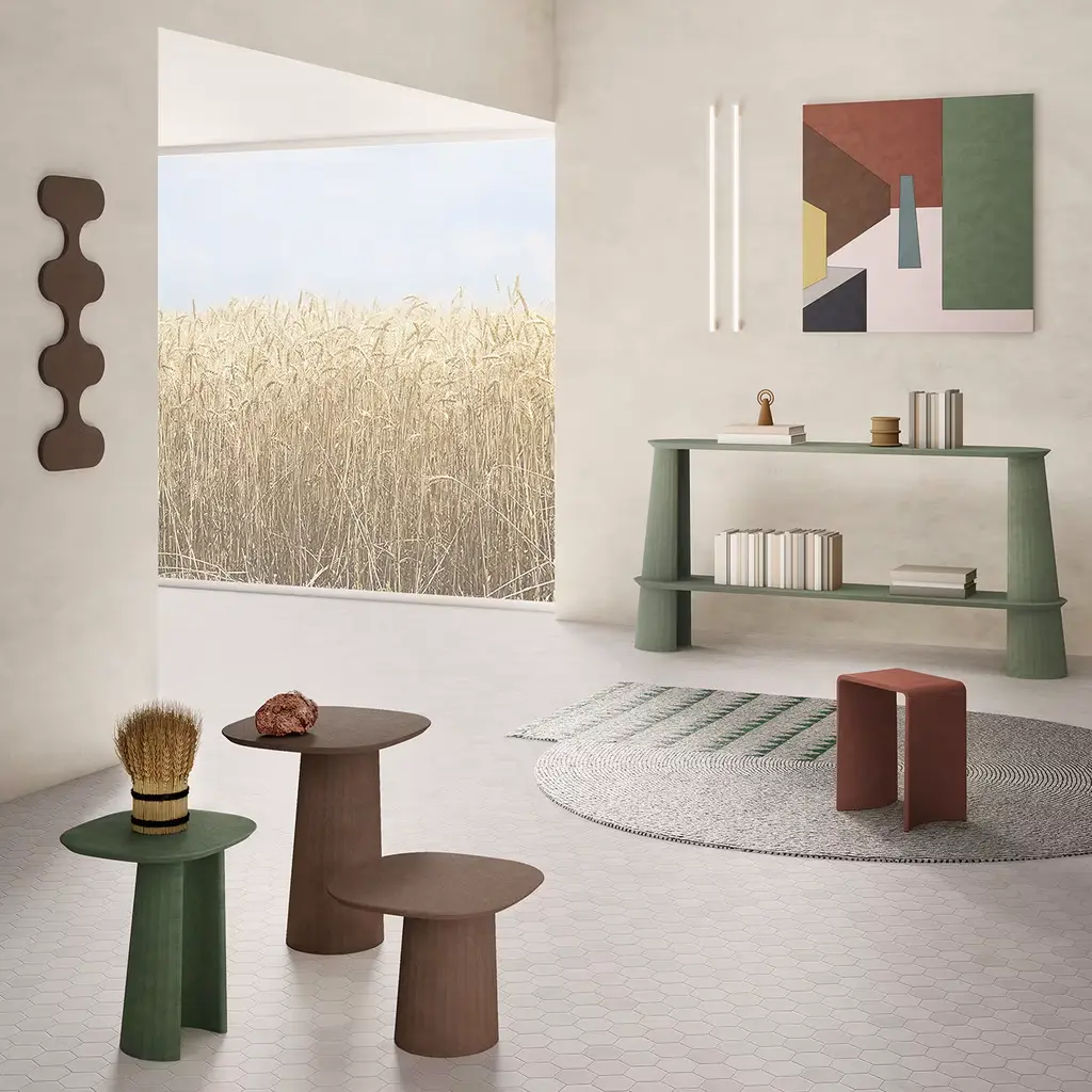 Part of an exquisite series of modular tables and bookshelves, this side table is entirely crafted of hand-treated and sandblasted ultra-high-performance concrete. The hardness of the concrete elegantly contrasts with the lightweight design, notably the column-shaped, grooved leg of classical inspiration supporting a thin yet sturdy top. Enhanced with a dark chocolate color, it is available in eight different shades.