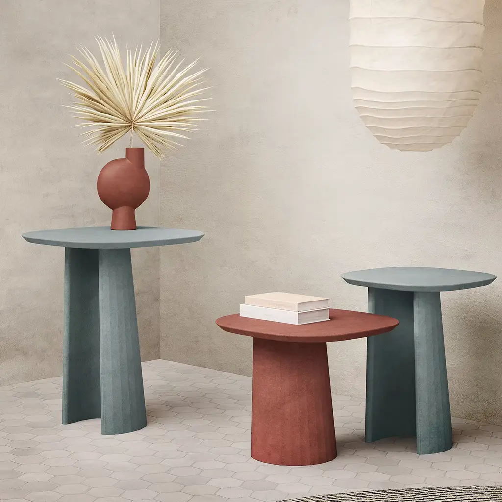 Distinguished by a captivating ultra-marine hue, this splendid side table will make a singular addition to any contemporary home. A modern interpretation of classical architecture, it features a concave, grooved and slightly oblique column-shaped leg supporting the top, entirely fashioned of ultra-high-performance concrete sandblasted and hand-treated with water repellent products. This superb piece is available in eight different colors upon request.
