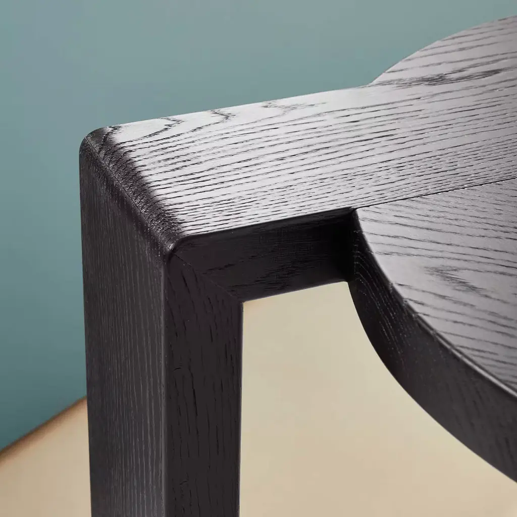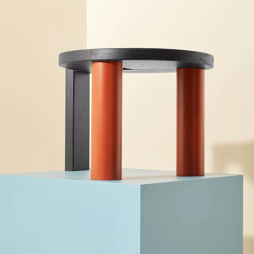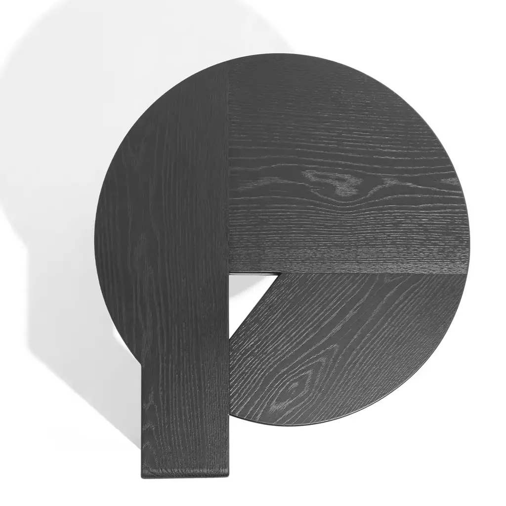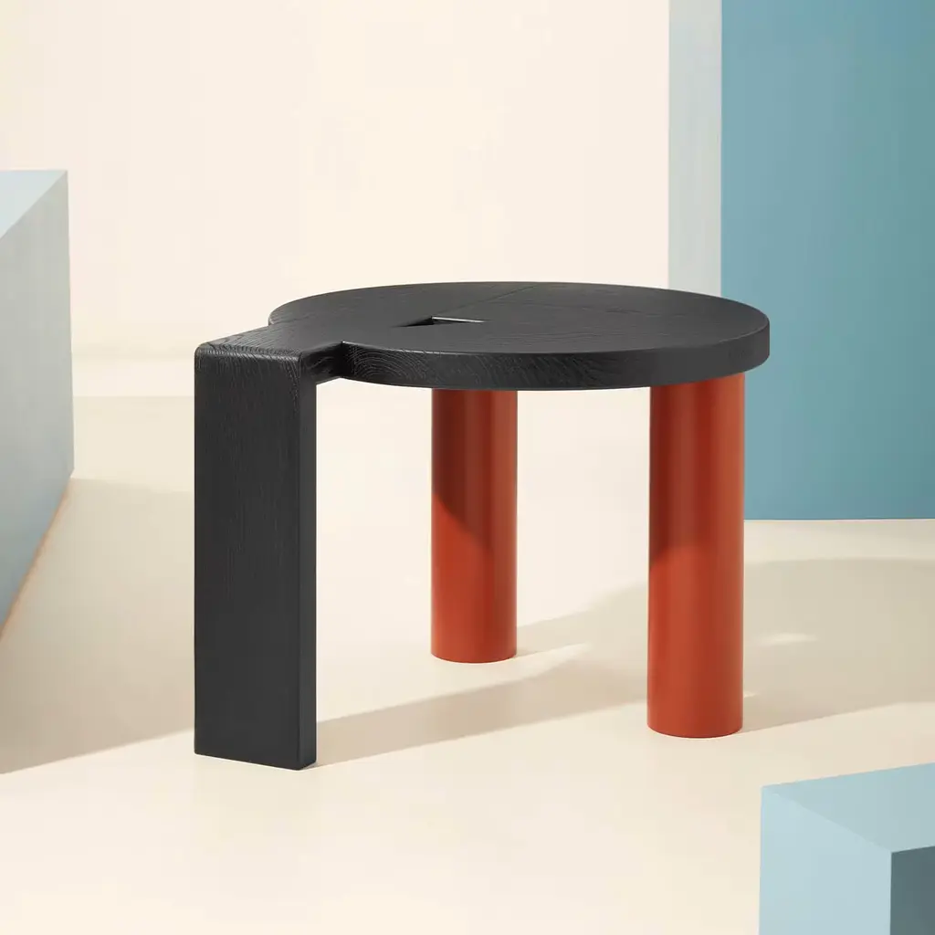 This G-shaped side table is an innovative, stylish design that will create an outstanding corner in a modern interior. Resting on two cylindrical legs in red-lacquered solid wood, it features a solid and brushed, black-lacquered durmast wood top that extends downwards to shape an angular, sleek third leg.
