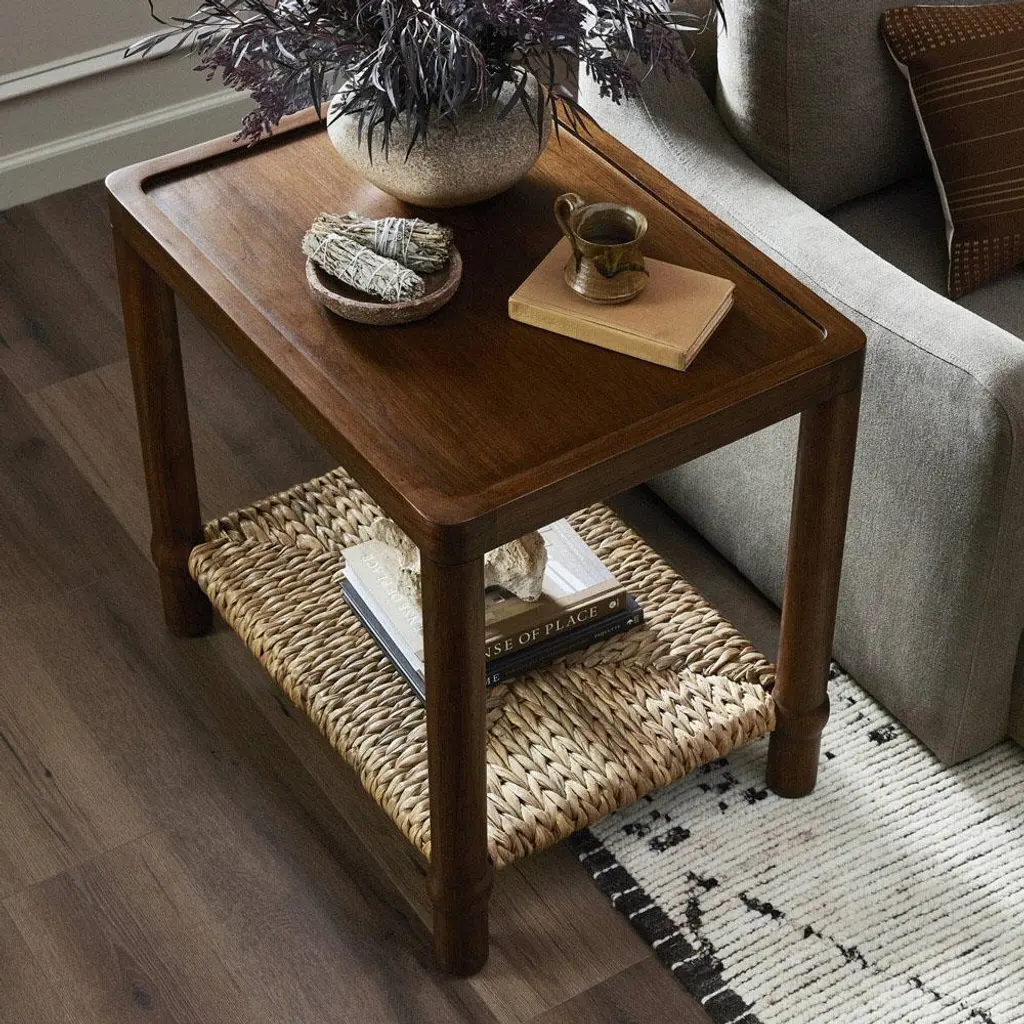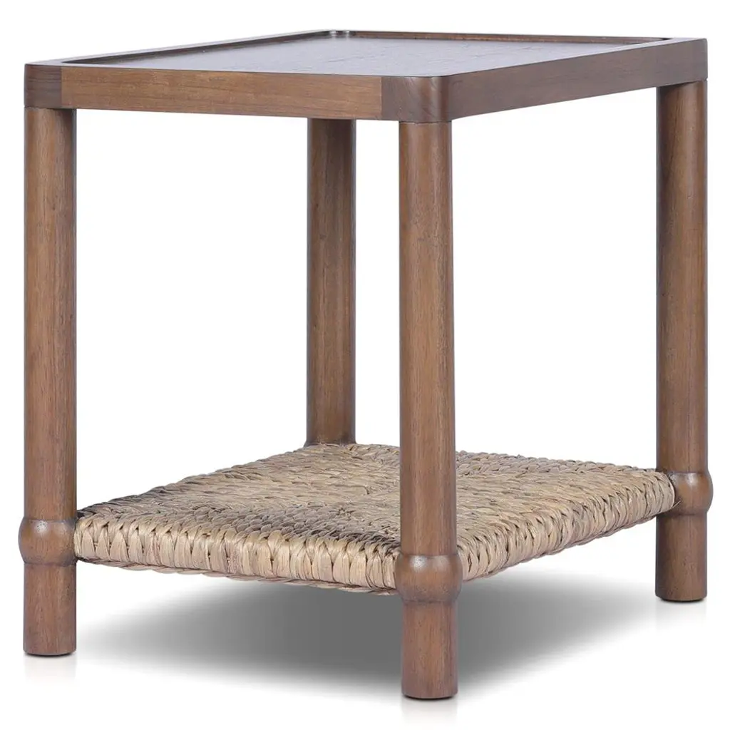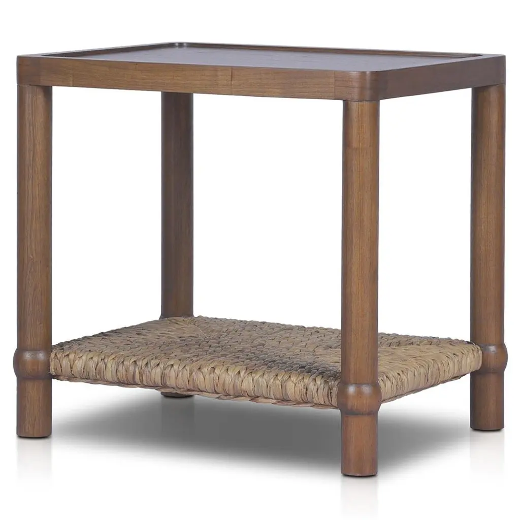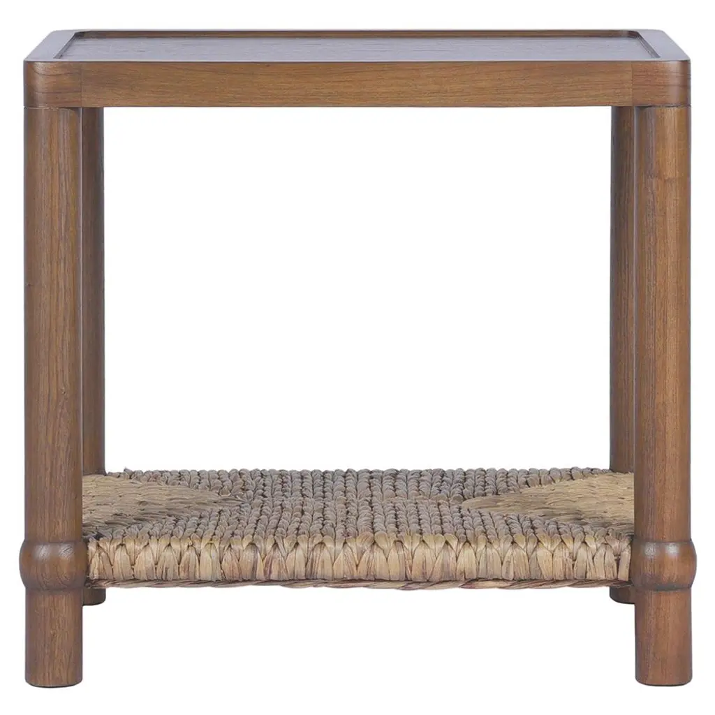 A design collaboration by Amber Lewis and Four Hands.Meeting heritage inspiration with new practicality, our Gabriella Brown Mindi End Table features a woven hyacinth shelf that appears to veil the wooden frame. Ball details at each leg connection and a warm mindi finish add to its natural appeal.