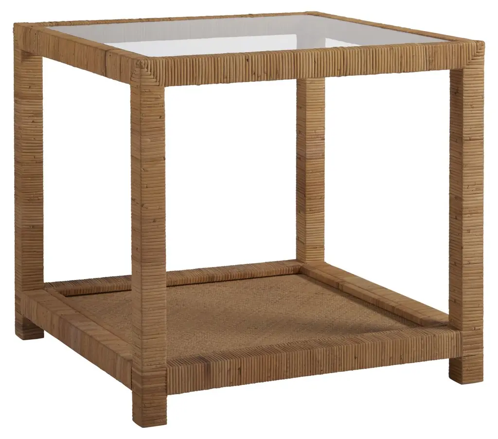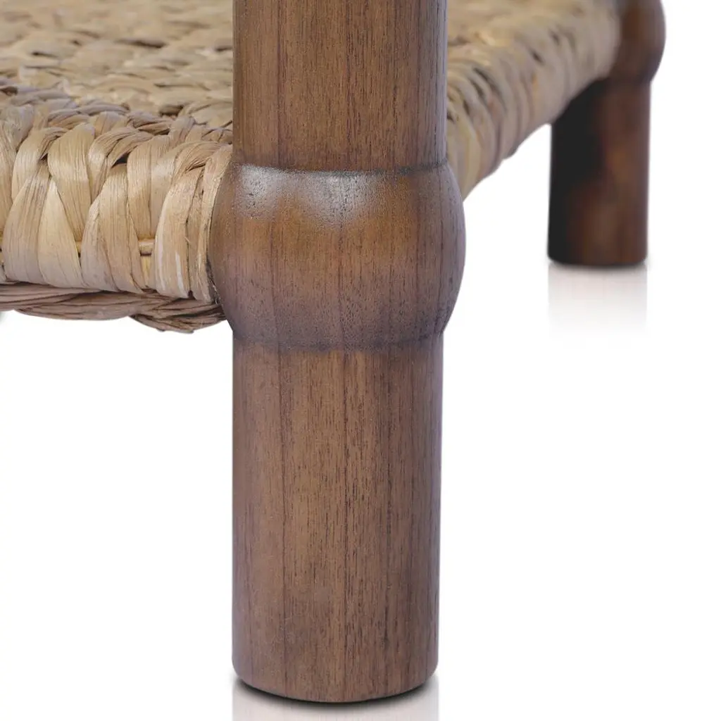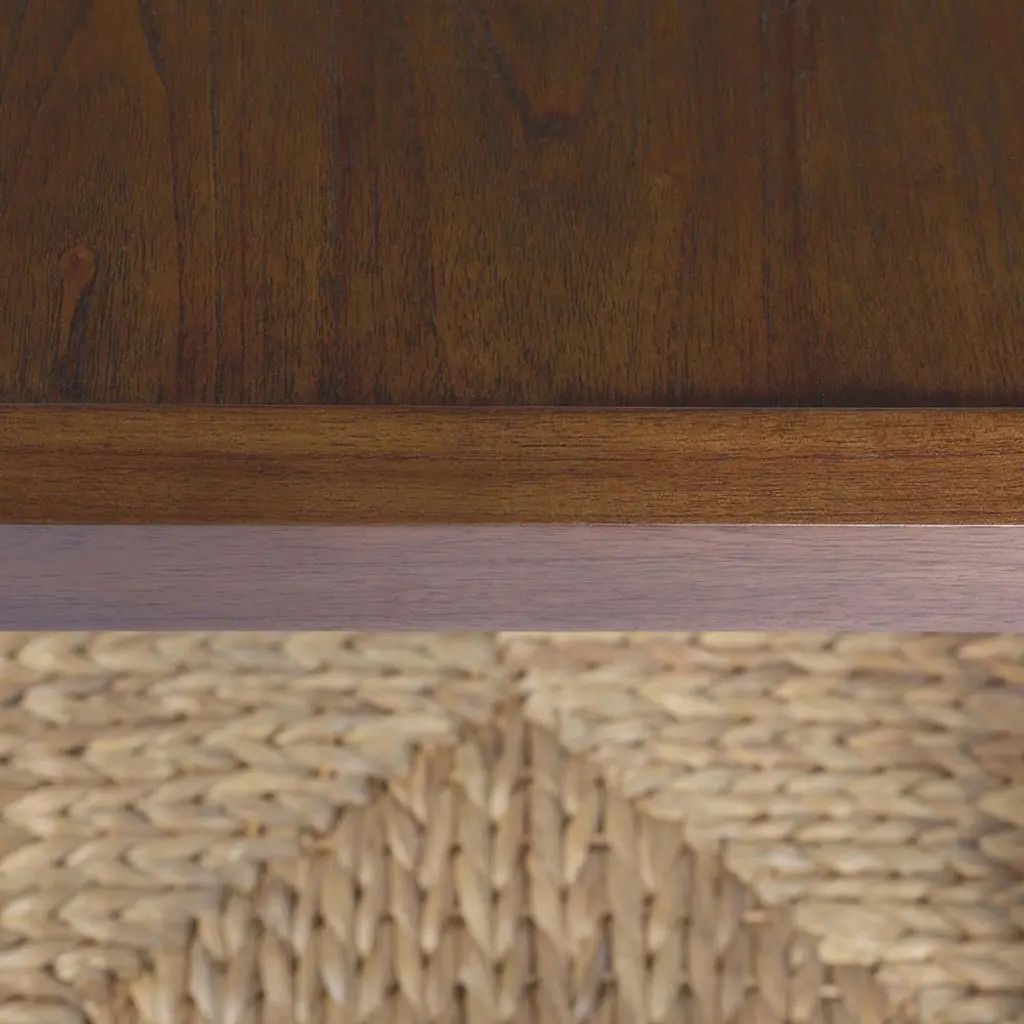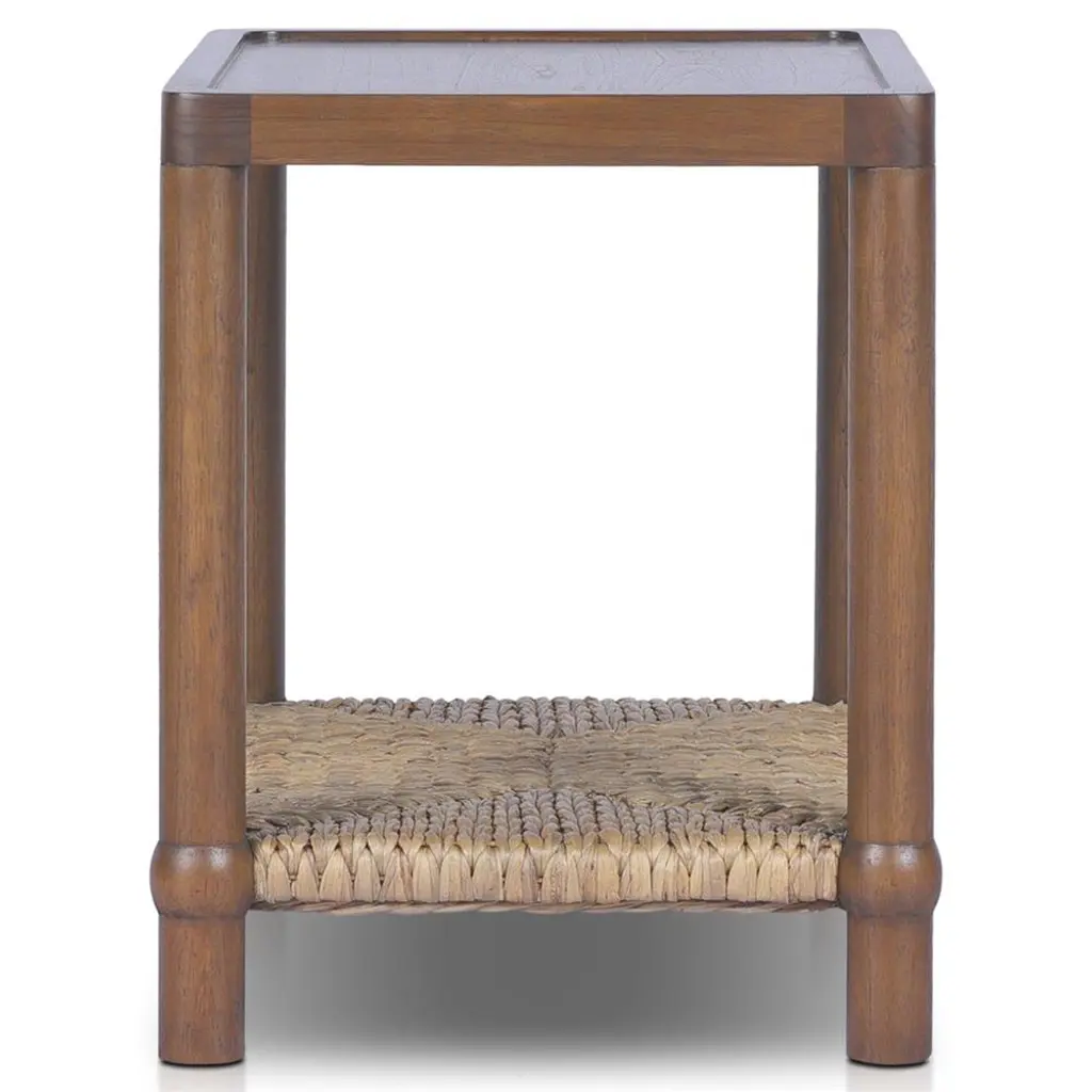 A design collaboration by Amber Lewis and Four Hands.Meeting heritage inspiration with new practicality, our Gabriella Brown Mindi End Table features a woven hyacinth shelf that appears to veil the wooden frame. Ball details at each leg connection and a warm mindi finish add to its natural appeal.