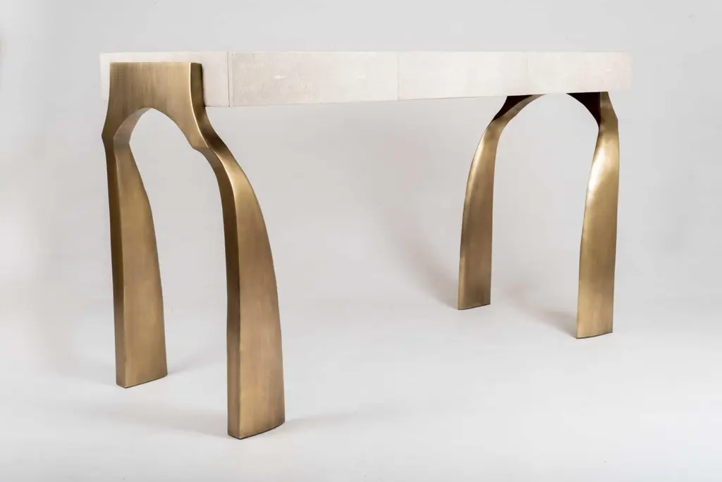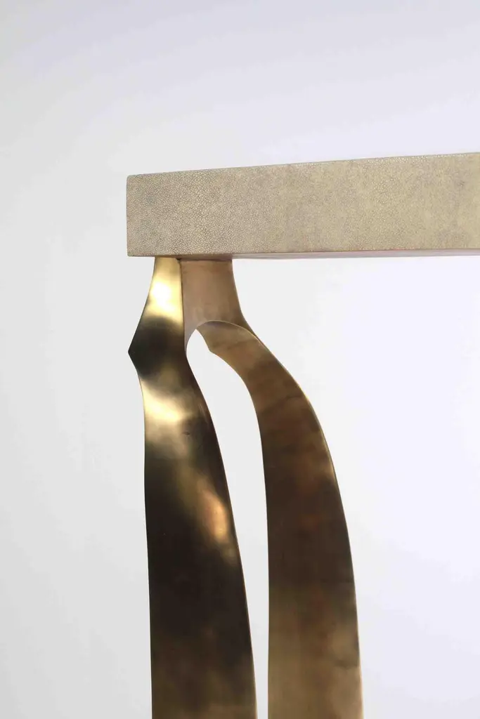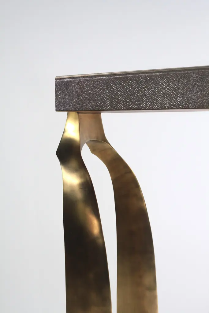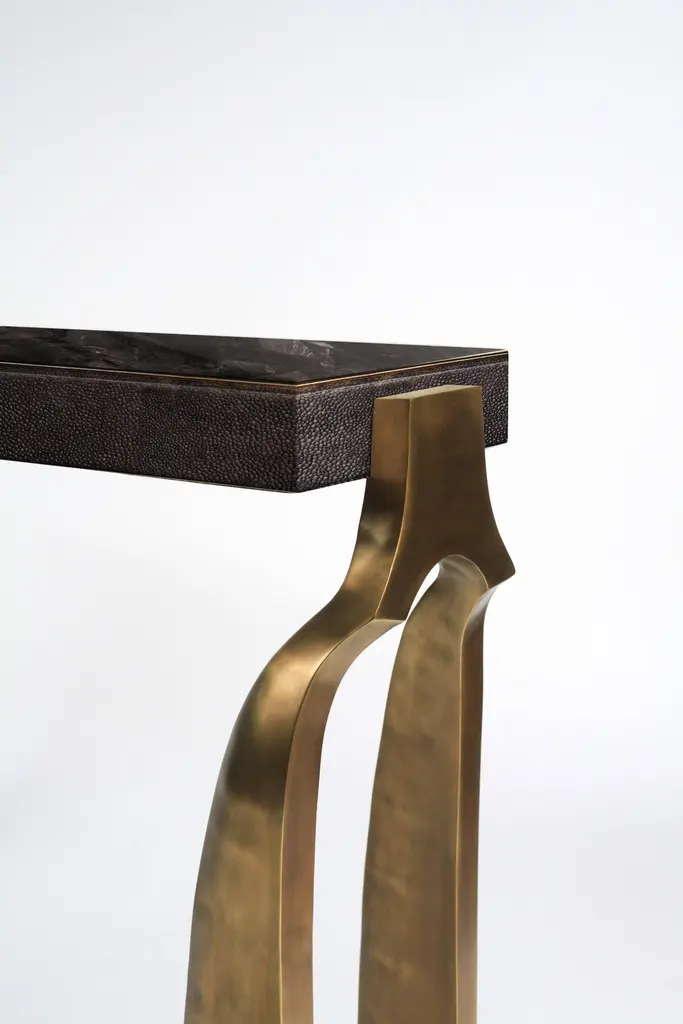 The Paris based label has distinguished themselves since their launch, with their iconic use of shagreen mixed with brass and other exotic materials. All furniture is handcrafted by skilled artisans, ultimately making each piece unique, designed in Paris and produced in the Philippines.The Galaxy console table is both dramatic and organic it’s unique design. The black quartz top, with coal black shagreen inlaid borders, sits on a pair of ethereal and sculptural bronze-patina brass legs. This console table comes in different finishes and also comes in a writing desk version, see image at end of slide. The legs of this console were inspired by the original KIFU Paris Galaxy side table, see image at end of slide. This piece is designed by Kifu Augousti the daughter of Ria and Yiouri Augousti. The dimensions of this piece are 160 x 30 x 90 cm / 63 x 11.75 x 35.5''All Kifu Paris pieces are handmade by artisans, ultimately making each piece unique. Custom color/sizing available on request. Wipe clean with soft dry cloth.Although inspired by her parents, her collection of Home Accessories and Furniture is a distinct identity of its own. Kifu uses handmade techniques of elaborate inlay patterns of shagreen, shells, semi-precious stones, materials she experienced as a child growing up in her parent’s studio, but interpreted in a younger quirkier way reflecting her youth. From her "jewelry inspired knobs" on decorative boxes, gold bar boxes and an extravagant inlay pattern mix of shagreen and shell inspired by galactic constellations, as seen on her enormous round mirror, is refreshing to see. Kifu embodies whimsical elements throughout her collection and is not afraid to be daring and unexpected in her approach to design. All shagreen-covered items should be kept out of direct sunlight, color variants may occur on the stingray and other exotic finishes, but this showcases the Parisian label's commitment to creating authentic luxurious products using natural components.