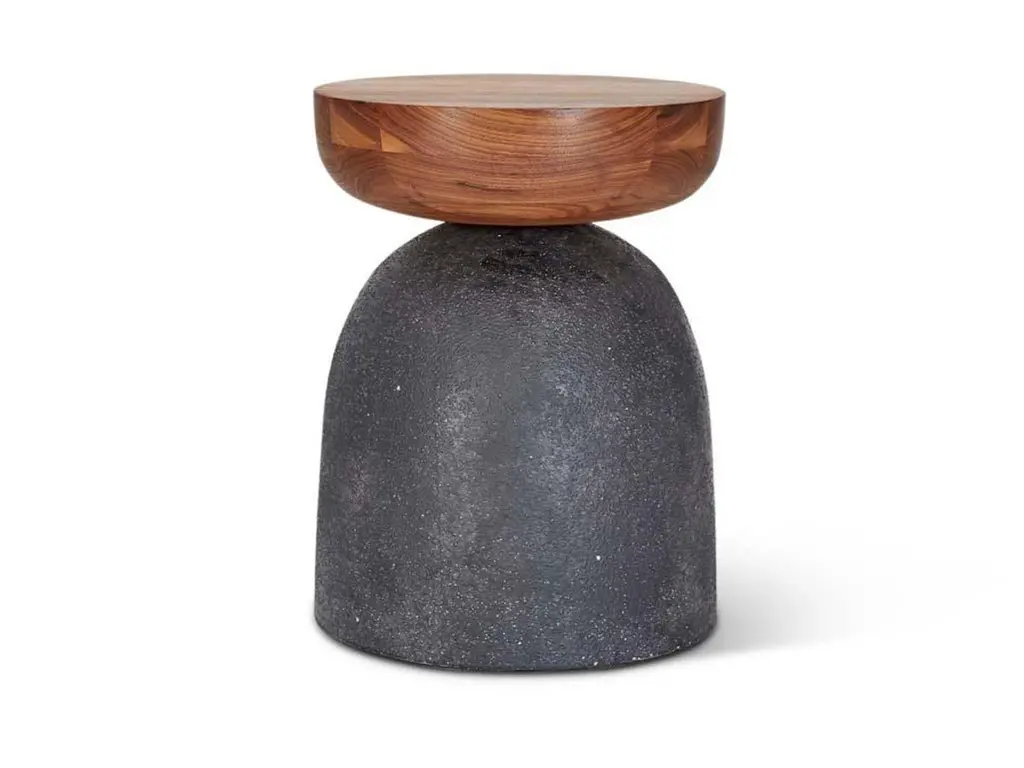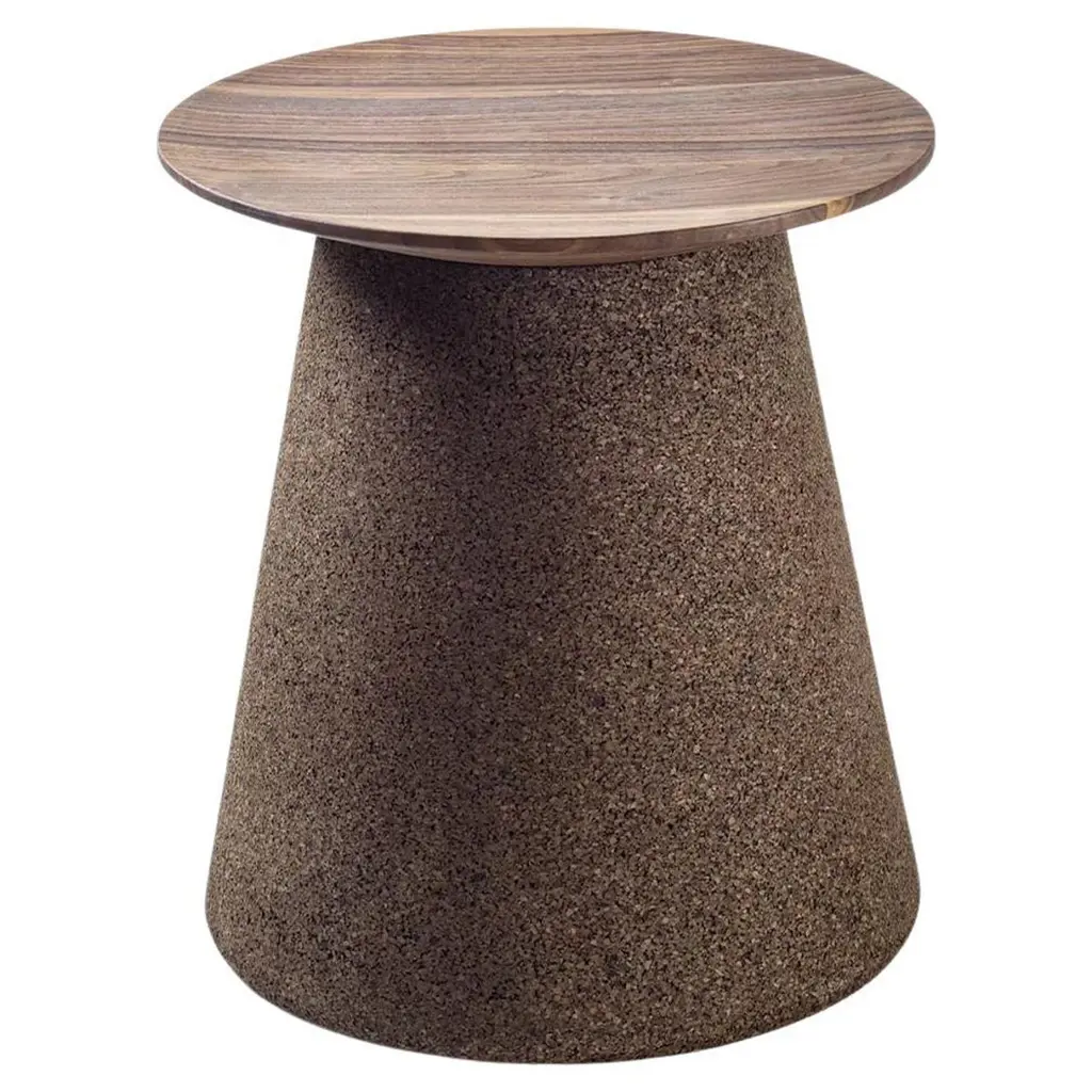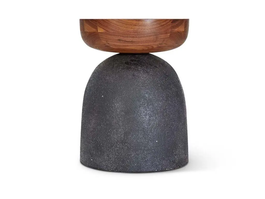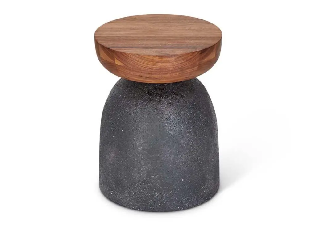 The Galaxy Glaze Side Table features a walnut top and handmade ceramic base by artist Natan Moss.