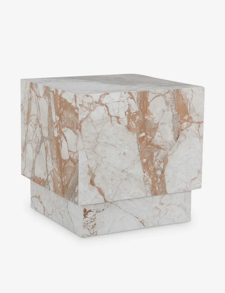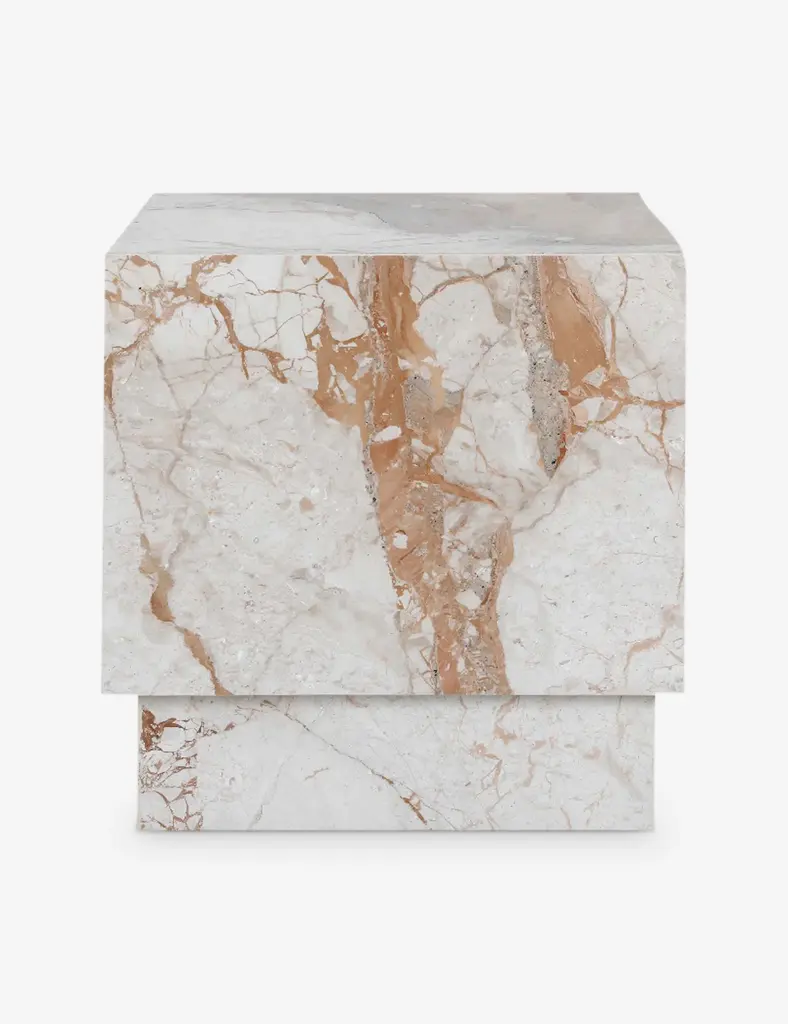 With its crisp lines and grounded profile, the Galdeano side table adds a quiet touch of luxury. Made from Breccia marble, each surface showcases the natural drama of the stone with its unique veining and mineral tones. The simple silhouette lets the material shine, making this an elegant end table or pedestal for any space.