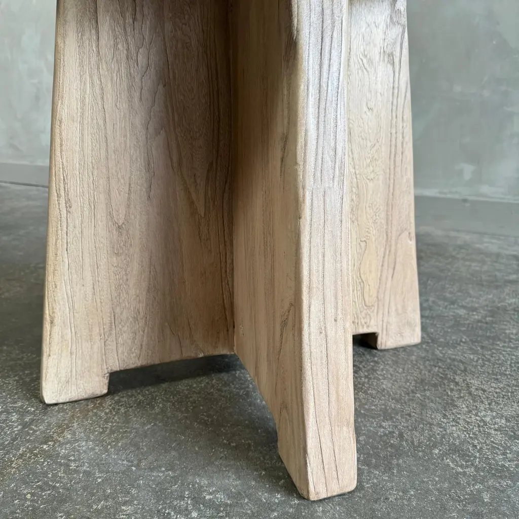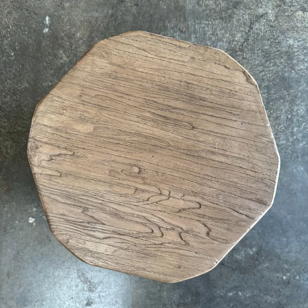 The artisanal construction methods highlight the elm woods beautiful grain pattern & knots and fissures from its past life.The most authentic materials are hand selected, and hours of hand-craftsmanship go into each piece, creating each and every beautiful table, no one is exactly alike. A beautiful distinctive weathered finish, this table adds a unique touch to any space.Dimensions: 18"w x 17"d x 20"h