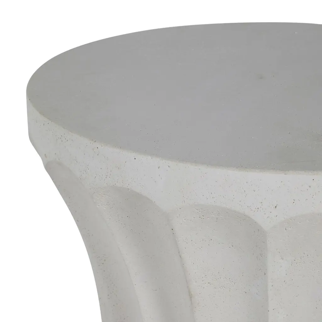 A sculpted design reveals deep concave fluting surrounding the graceful hourglass base of the Gannet Side Table. Crafted from faux stone, this multifunctional side table is lightweight enough to move easily but gives the impression of a solid cast stone piece. The 18” smooth, circular top offers plenty of space, and the Natural Stone color complements any setting. Works well alongside a sofa, between two chairs, or used in pairs as a coffee table—indoors or out.