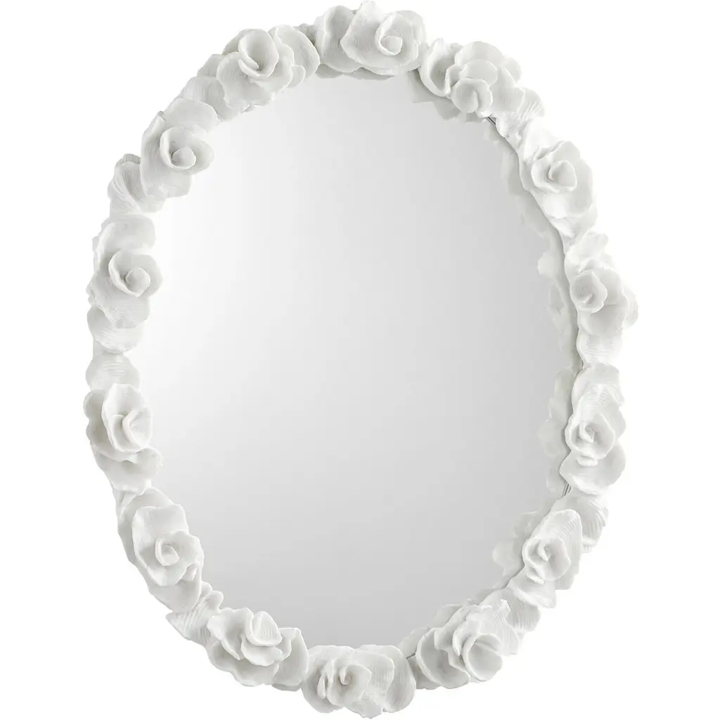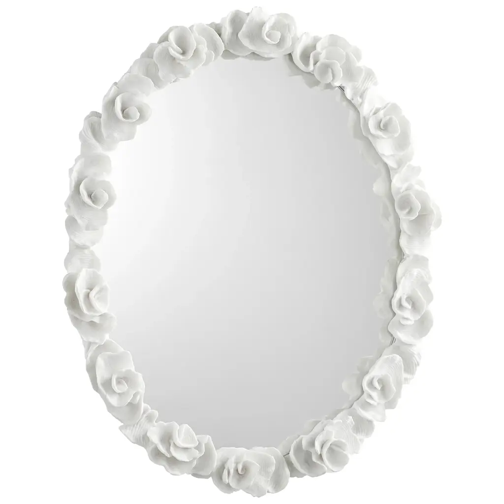 The Gardenia mirror features a clean, floral inspired look. Boasting a resin, white finish on a layered design, this wall hanging decor features generous proportions, with added depth, making it perfect for installing as an anchor in any hallway, or living room space, with a traditional or rustic appeal. Create an artful installation with multiples on a vast-stretching wall space, or hang a single piece over a small accent table for an added touch of bucolic charm.