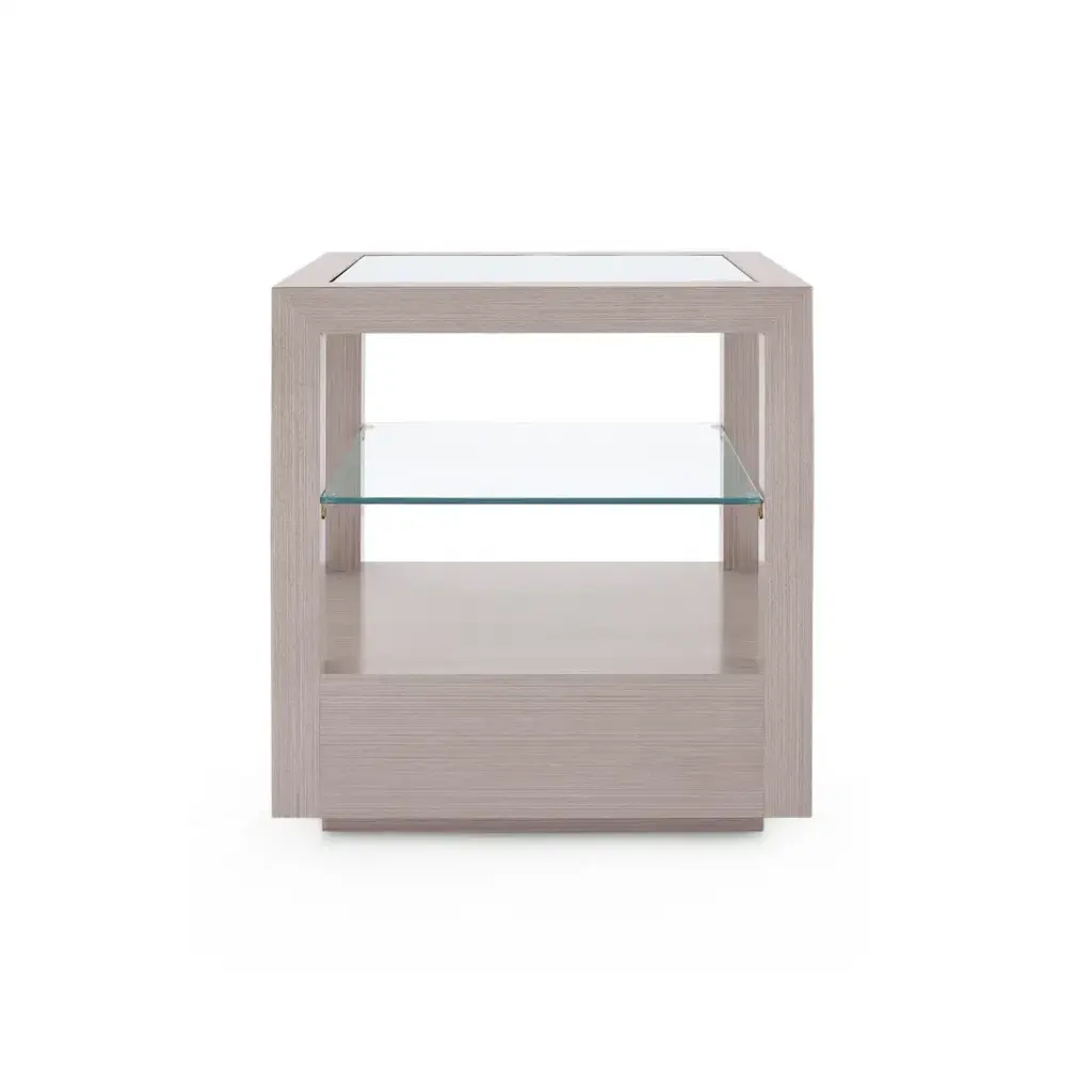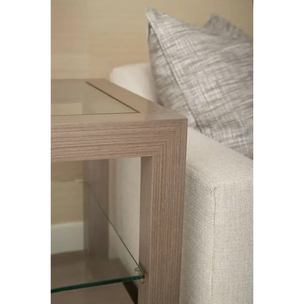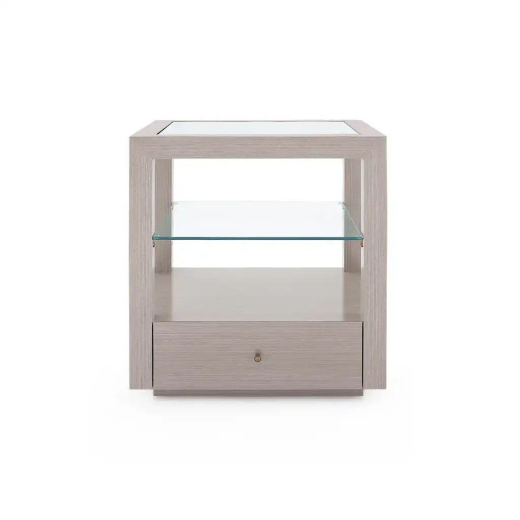 With champagne-colored finishes, subtle bronze pull, veneer drawer interiors, and soft-closing glides, the Gavin 1-Drawer Side Table is our designers’ answer to the need for a collection that compliments the perennially popular Morris and Blake Collections. Because our innovative blanched oak finish and taupe gray colorways have been so popular, the design team wanted to expand that design idea into coffee and side tables with the same tailored appeal. The result is tailored and masculine, but not rustic, with an innate refinement and modern structure. If you’re looking for that perfect piece that is slightly dressy but not over the top or frilly, the Gavin Collection is for you. Accented with glass and a recessed base, the Gavin Side Table is a standout for your next bedroom, living room, study, or formal entry design.