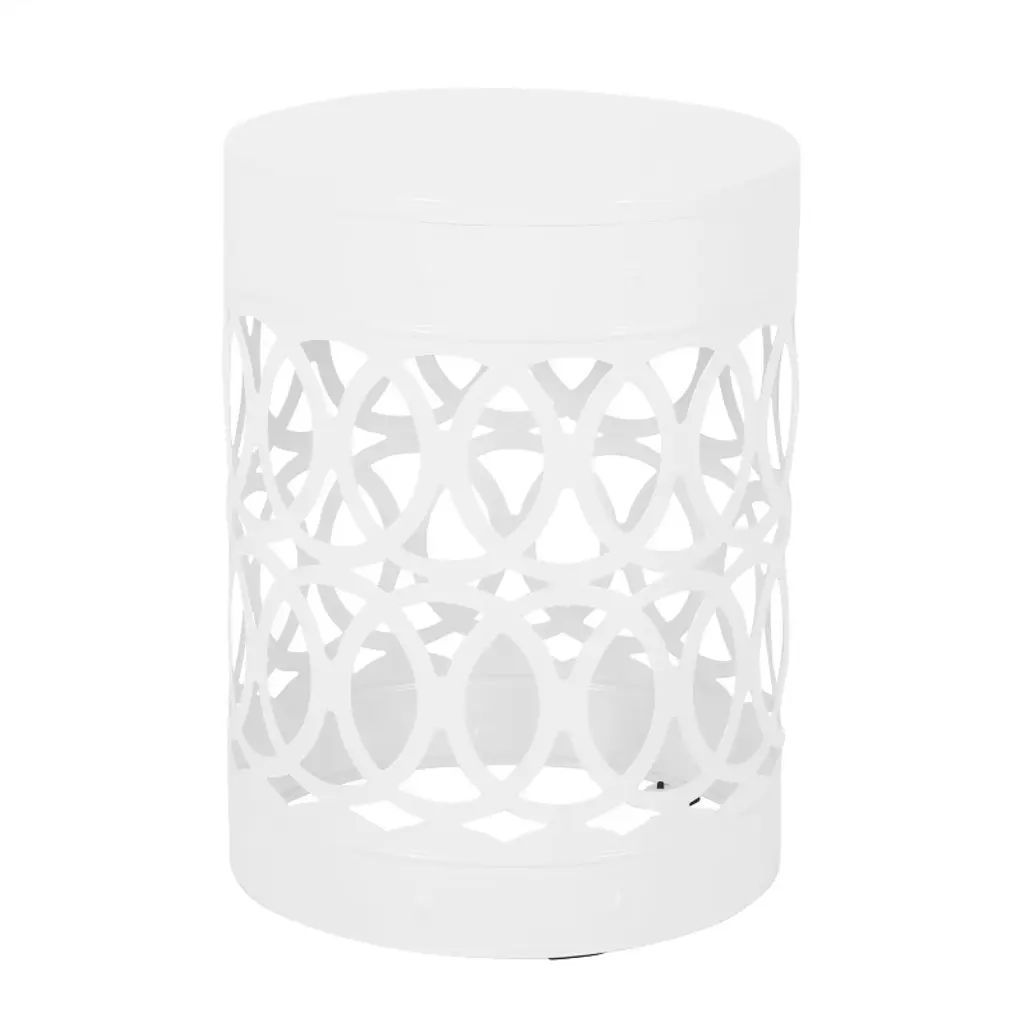 Add a bold style accent to your outdoor space with this compact yet eye-catching metal end table. Featuring a modern cylindrical silhouette and an openwork iron-cut design with elegant overlapping circles, it brings both charm and structure to patios, balconies, or garden nooks. The powder-coated iron frame offers durability against the elements, while the hollow design keeps it visually light and versatile. Whether holding drinks, books, or decor, this no-assembly table is a stylish, ready-to-use companion for any outdoor setup—available in multiple vibrant colors to suit your style. Material: Iron Multiple Finish Options No Assembly Required Dimensions: 13.75 inches deep x 13.75 inches wide x 18.00 inches high Weight Capacity: 10 lbs