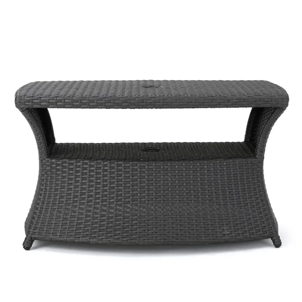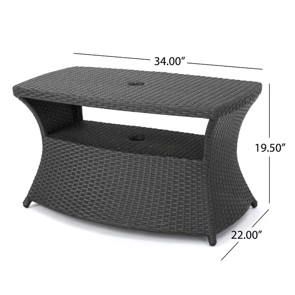 This stylish outdoor table is the ultimate patio upgrade, blending sleek modern design with exceptional functionality. It features a built-in umbrella hole to provide convenient shade on sunny days, ensuring comfort during outdoor gatherings. The spacious tabletop offers ample room for drinks, snacks, and décor, while the lower shelf provides extra storage for added convenience. Whether serving as a coffee table for casual relaxation or a serving station during lively events, this versatile piece adapts effortlessly to any occasion. Built with durable materials to withstand the elements, its elegant appearance adds a polished touch to your outdoor space. With this table, your patio will become a more inviting, functional, and stylish haven for all your outdoor activities. Material: Faux Rattan Frame Material: Iron Multiple Finish Options No Assembly Required Dimensions: 22.00 inches deep x 34.00 inches wide x 19.50 inches high
