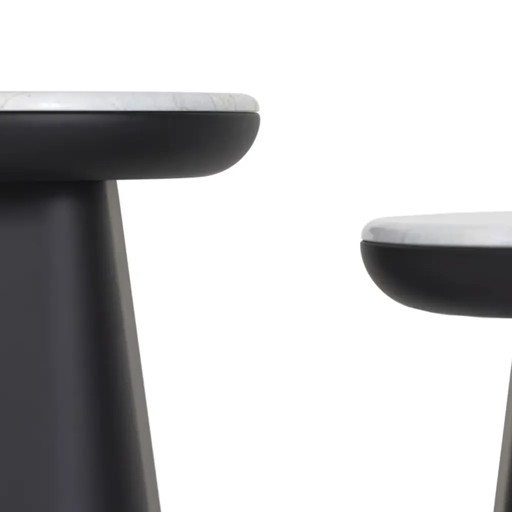 Gemini small table belongs to a collection of coffee tables featuring a statement basement of sculptural value in Carbone matt lacquer and white marble top.