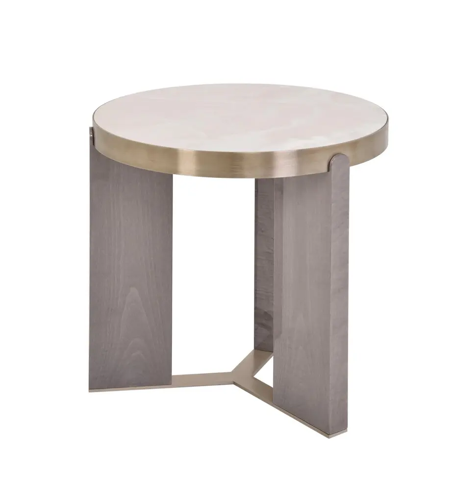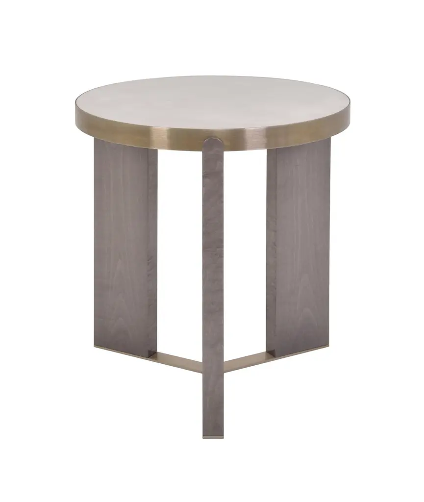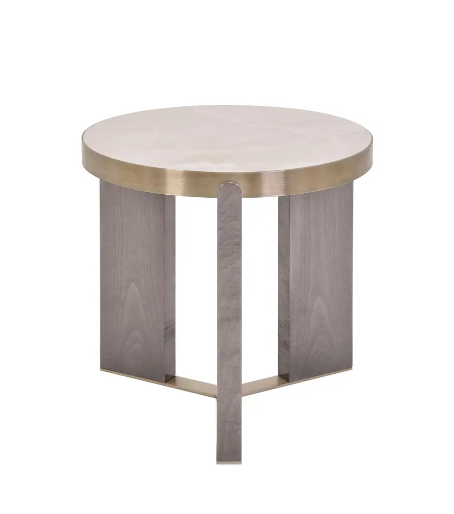 A study in balance and material contrast, this side table combines the warmth of oak with the subtle elegance of brushed brass. Its design is defined by three legs connected to each other, supporting a round top in Dekton material. The duality of light and dark tones creates a striking architectural presence, while discreet brass details at the base add a refined note of sophistication.