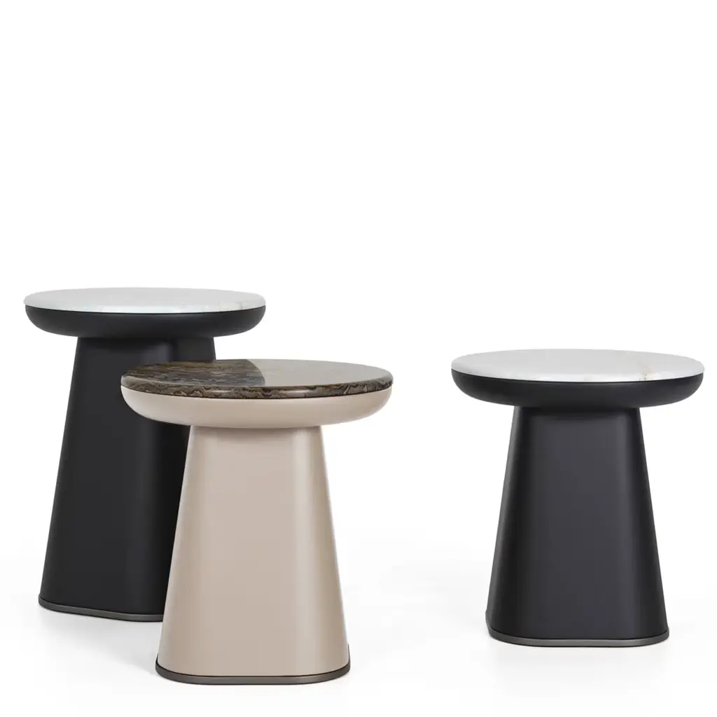 Gemini small table belongs to a collection of coffee tables featuring a statement basement of sculptural value. In Polvere matt lacquer and Stromatolite top. The Stromatolites are layered sedimentary formations created mainly by photosynthetic microorganisms that exhibit a variety of forms and structures and are a fossil record of the Precambrian era.