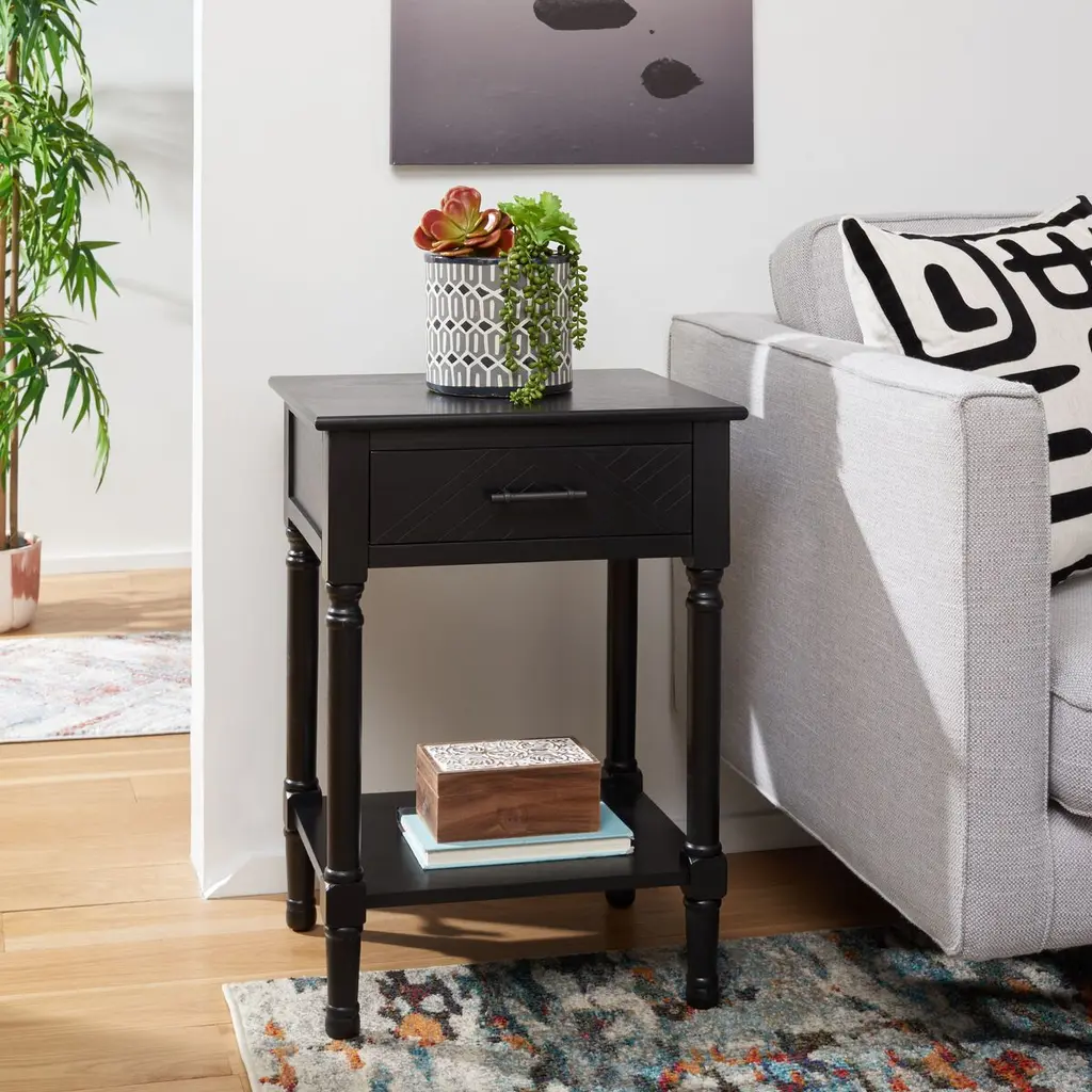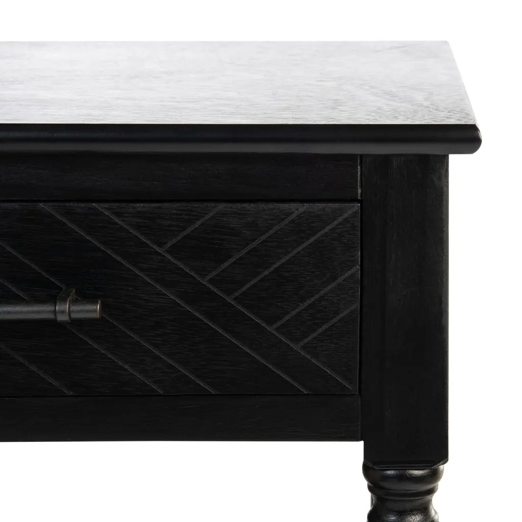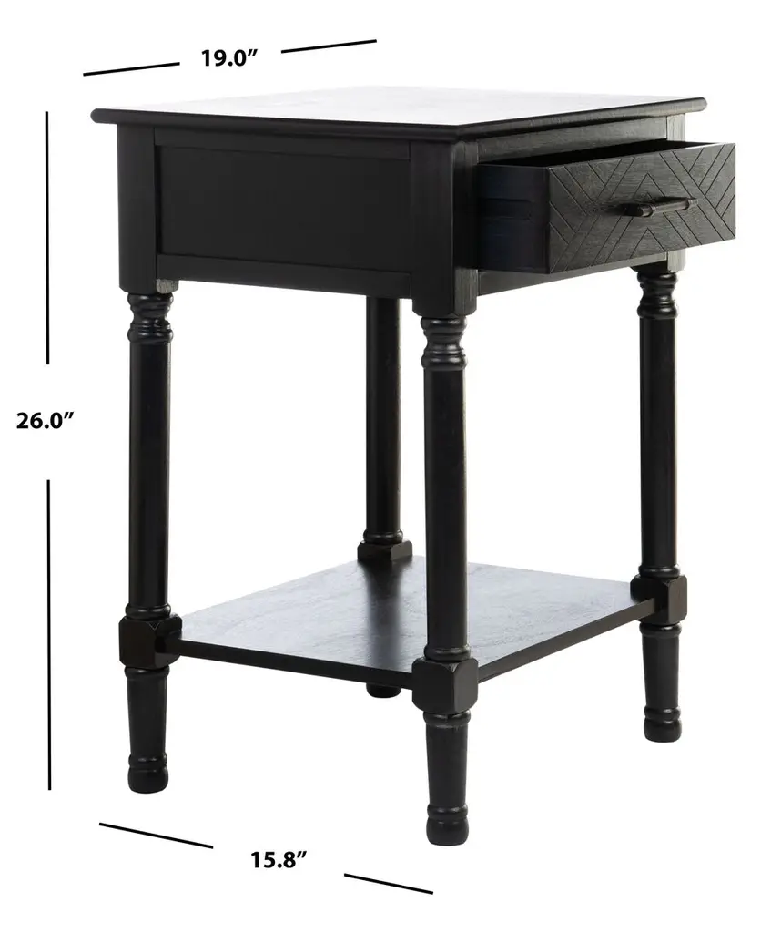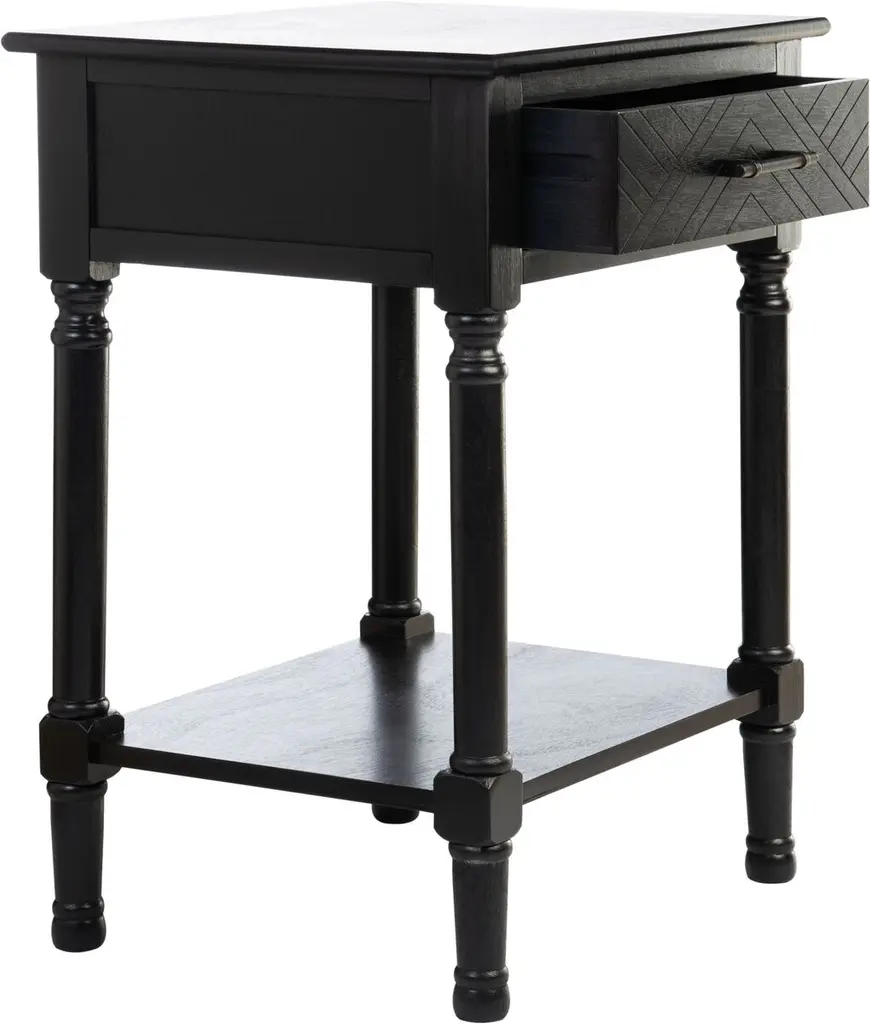 Turned legs and a chevron pattern on the drawer front give this accent table timeless elegance. The bottom shelf is ideal for stacking books or displaying a favorite object.