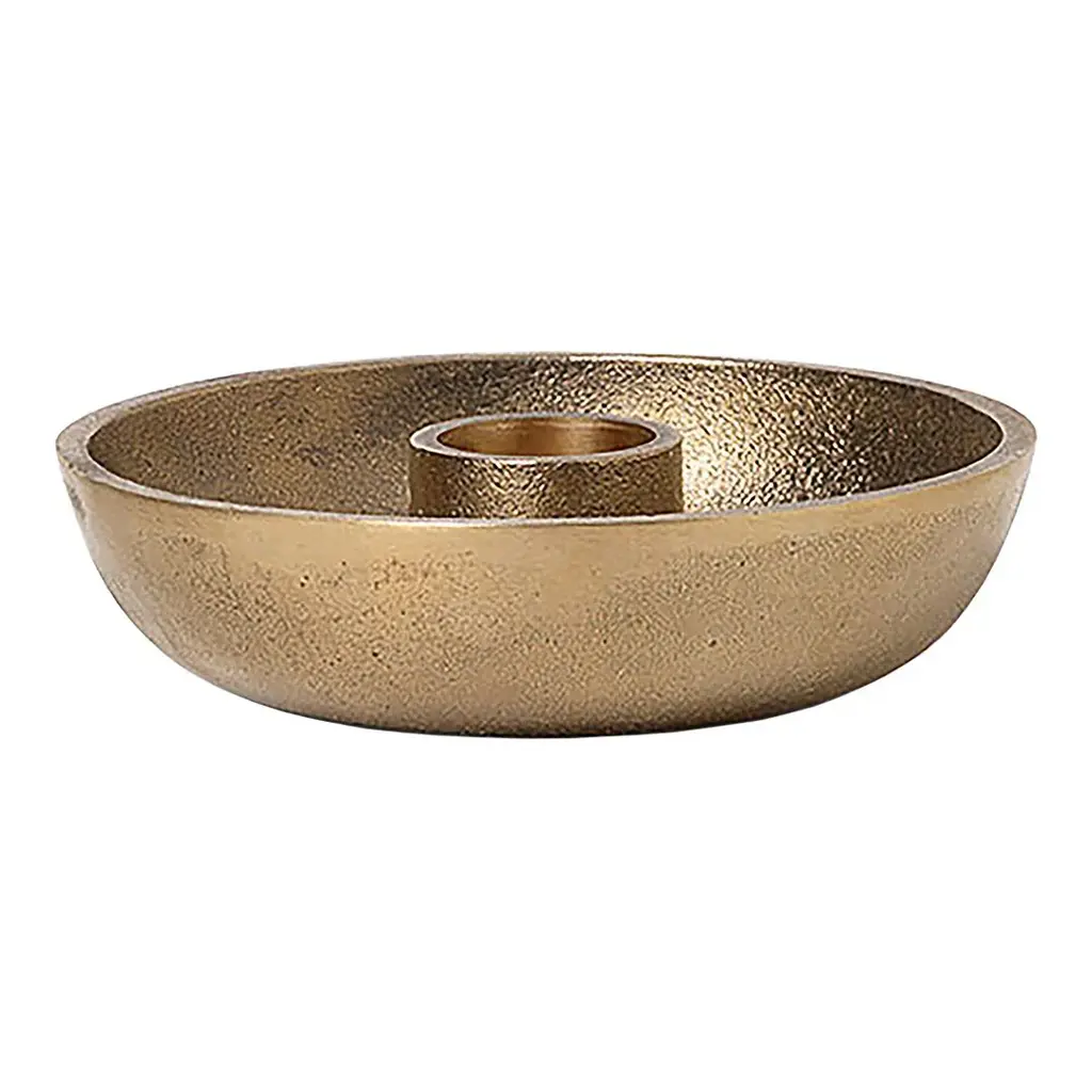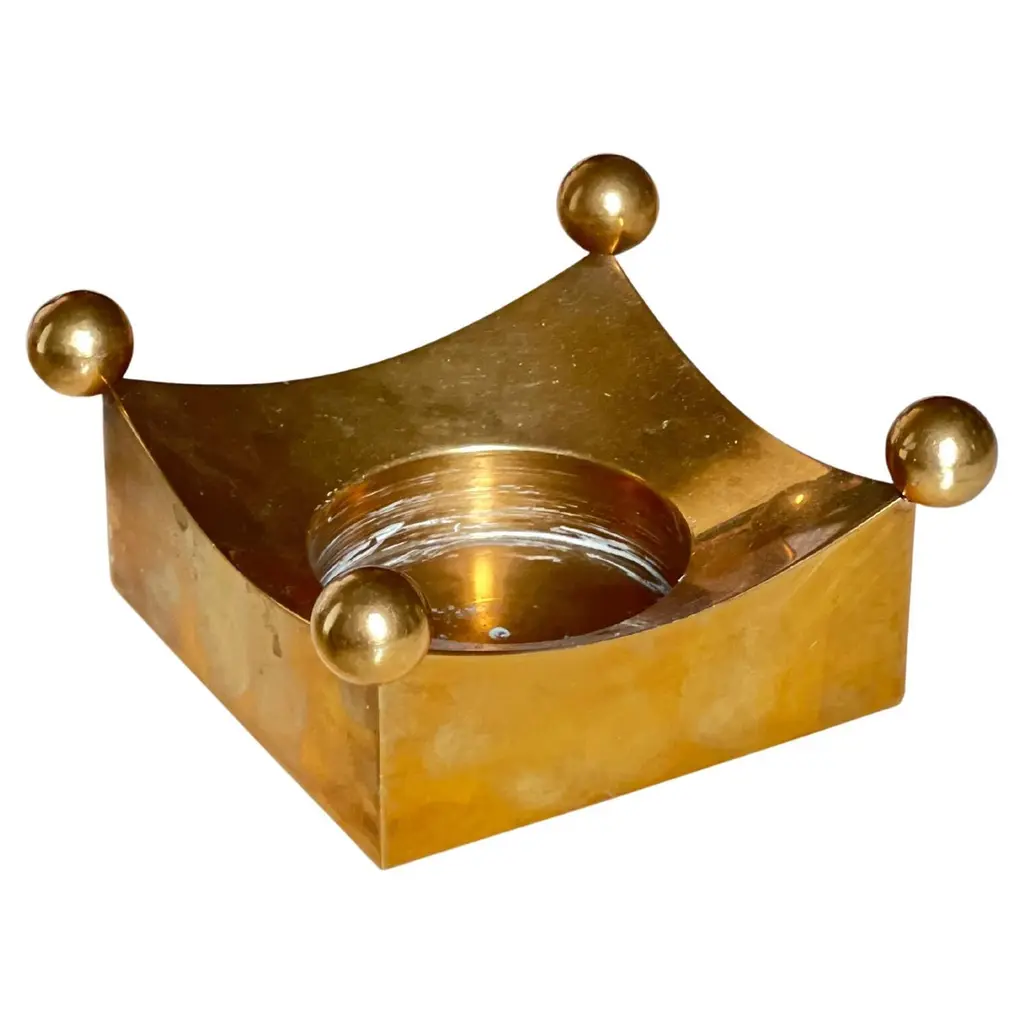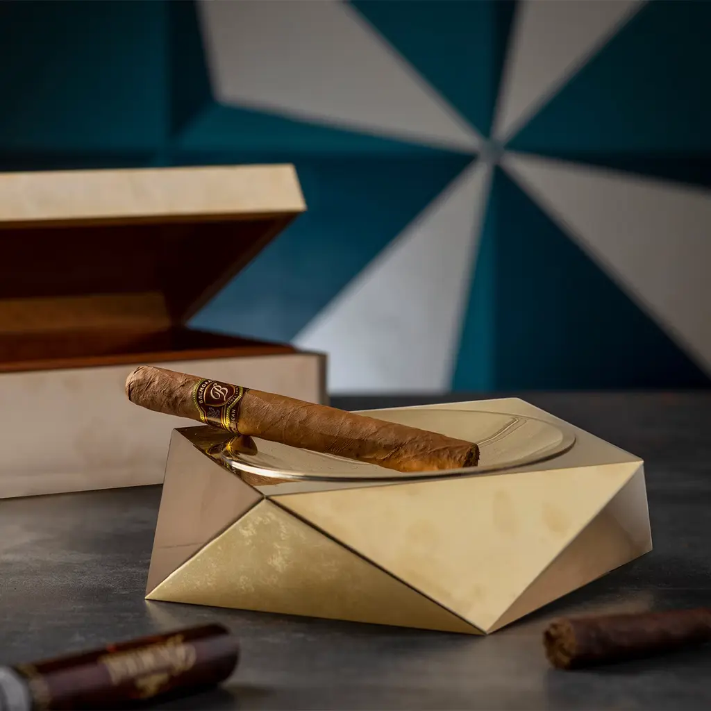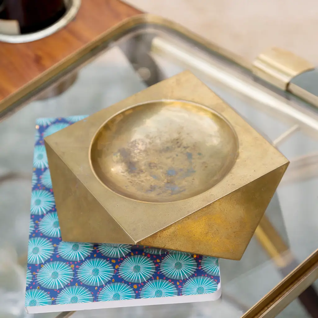 Distinguished by a striking visual texture and unconventional design, this ashtray will be an original and intriguing accent on a side table or coffee table in any modern or traditional decor. Showcasing an angular, geometric profile with a contrasting round bowl, it is entirely handcrafted of brass boasting an elegant natural finish.
