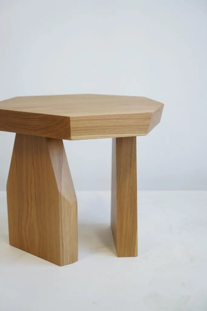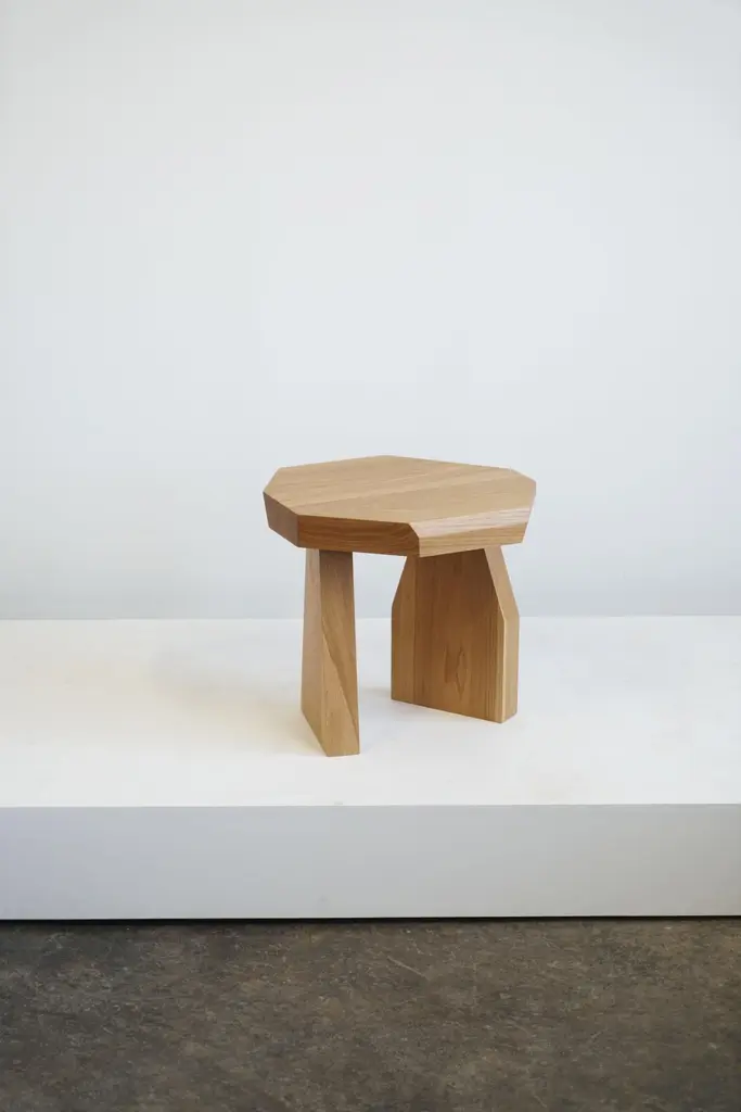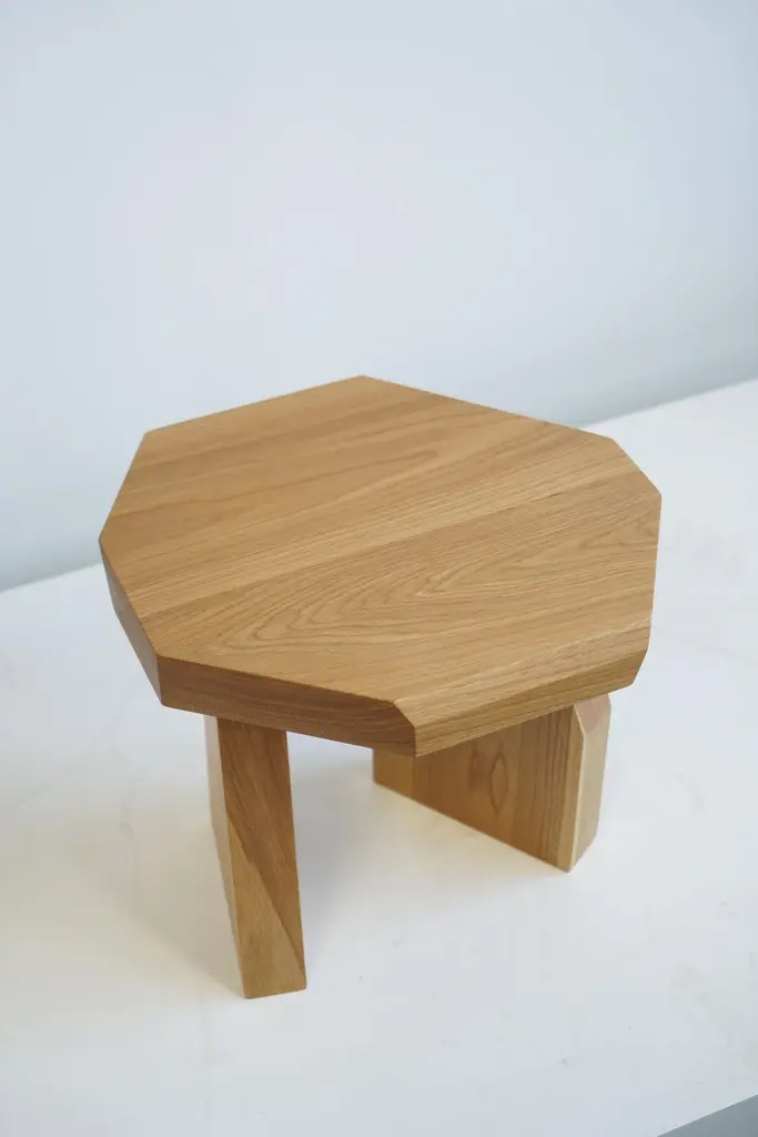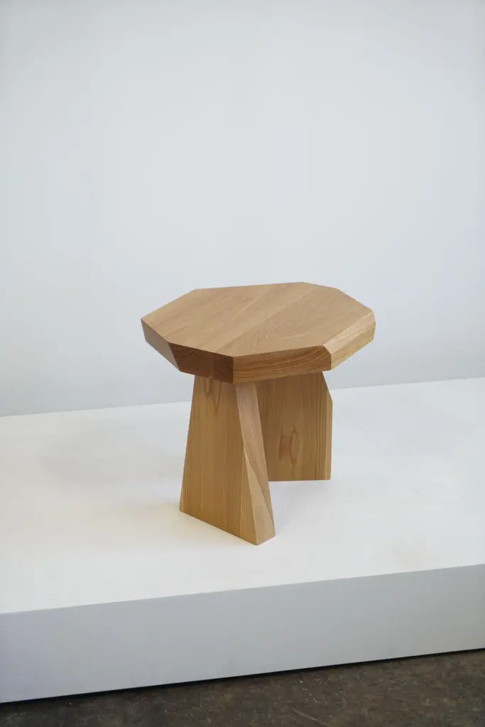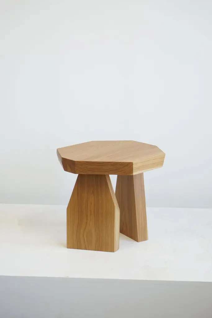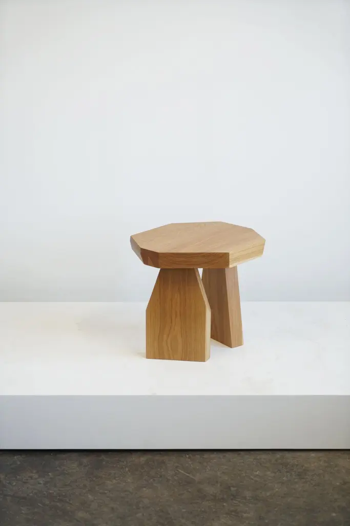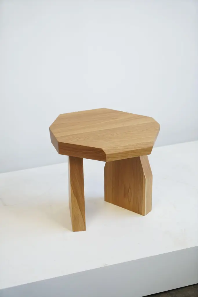 A recently made geometric organic modern style side table or stool.Made by Last Workshop, 2023White oak, natural satin oil finish.Measures: 18" x 16" x 17"HDesigned to look good and to be placed at any angle. Made from thick solid white oak.Custom sizes and dimensions are also available.