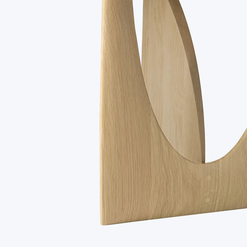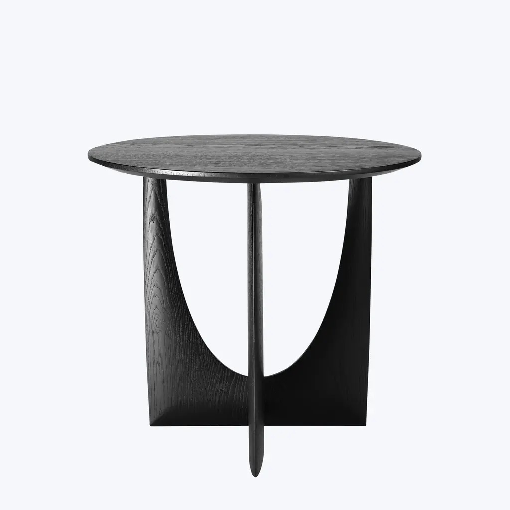 The Geometric Side Table by Ethnicraft is crafted from solid oak with a sleek varnish, bringing a strikingly modern presence to any space. With a 20.5" diameter and standing at 20" high, this 23-pound piece is both substantial and versatile, offering ample space for display or everyday use. Designed by Alain van Havre, its intersecting geometric shapes and oval-shaped cutouts give the piece a sculptural, dynamic form, shifting its appearance with every angle. The solid oak panels finished with a smooth varnish and a brushed texture, provide durability and sophistication while contributing to the table’s airy, open design. Whether placed in a living room or a contemporary workspace, the table becomes a conversation starter, its unique structure drawing the eye from every perspective. Made in Serbia, this table is both sustainable and ethically produced, crafted with responsibly sourced materials. Its minimalist yet impactful design ensures it complements a variety of decor styles, adding a touch of modern artistry to any room.