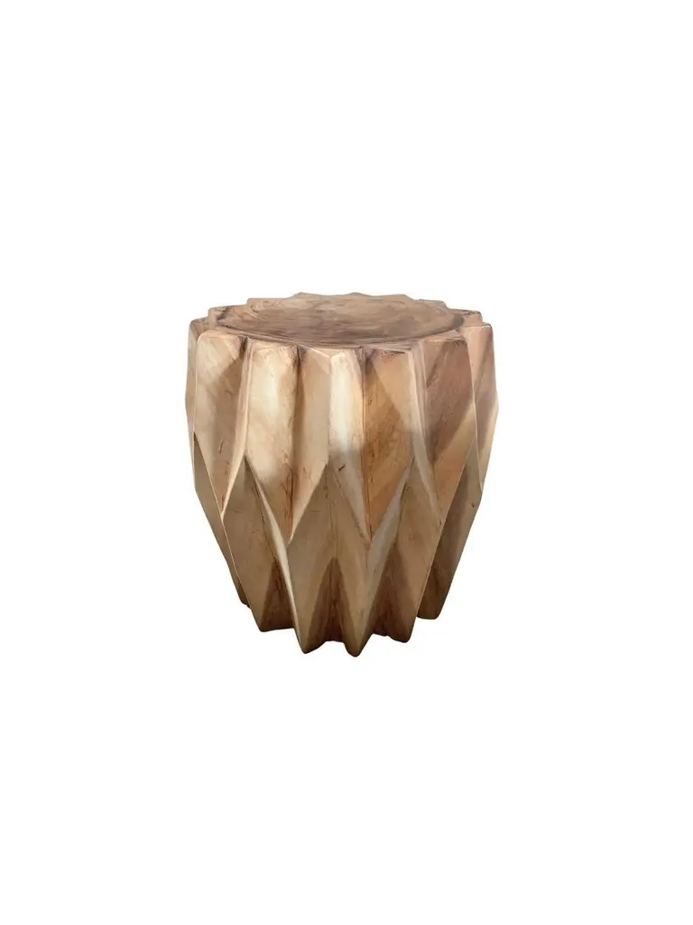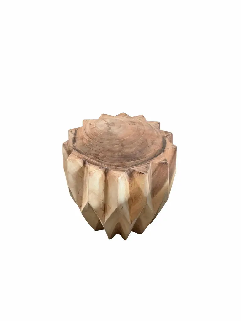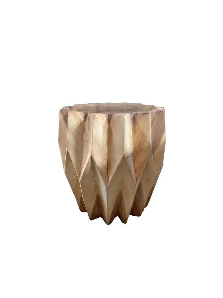 A wonderfully sculptural round side table. Its neutral pigment and subtle wood texture makes it perfect for any space. A uniquely sculptural and versatile piece. This table was crafted from mango wood and was crafted to resemble a work of origami. To achieve its smooth texture the table was meticulously sanded down and then finished with a clear coat. The mix of lines and angles amongst its carved edges add to its charm.