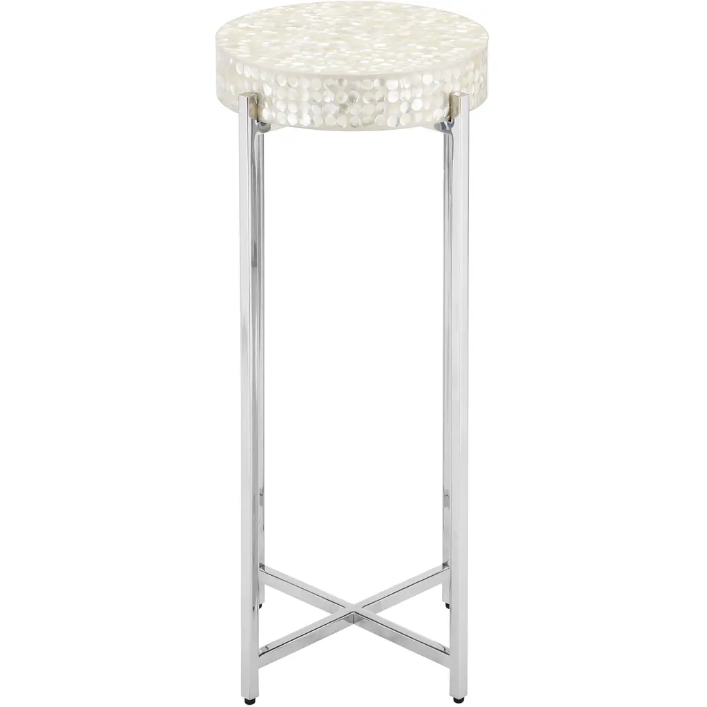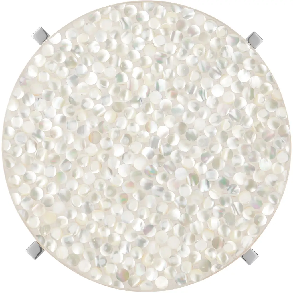The timeless elegance of mother-of-pearl make the Gerri Dot Mother of Pearl Drinks Table a stunning embodiment of masterful artisanship. Clad in the lustrous material, the disc top of the table is inset into the metal frame like prongs holding a gem. Four legs made of stainless steel in a polished nickel finish are connected by an ex-shaped stretcher. The petite table is perfect for spots where space is limited, though it will bring radiant charm to that spot even though its small.