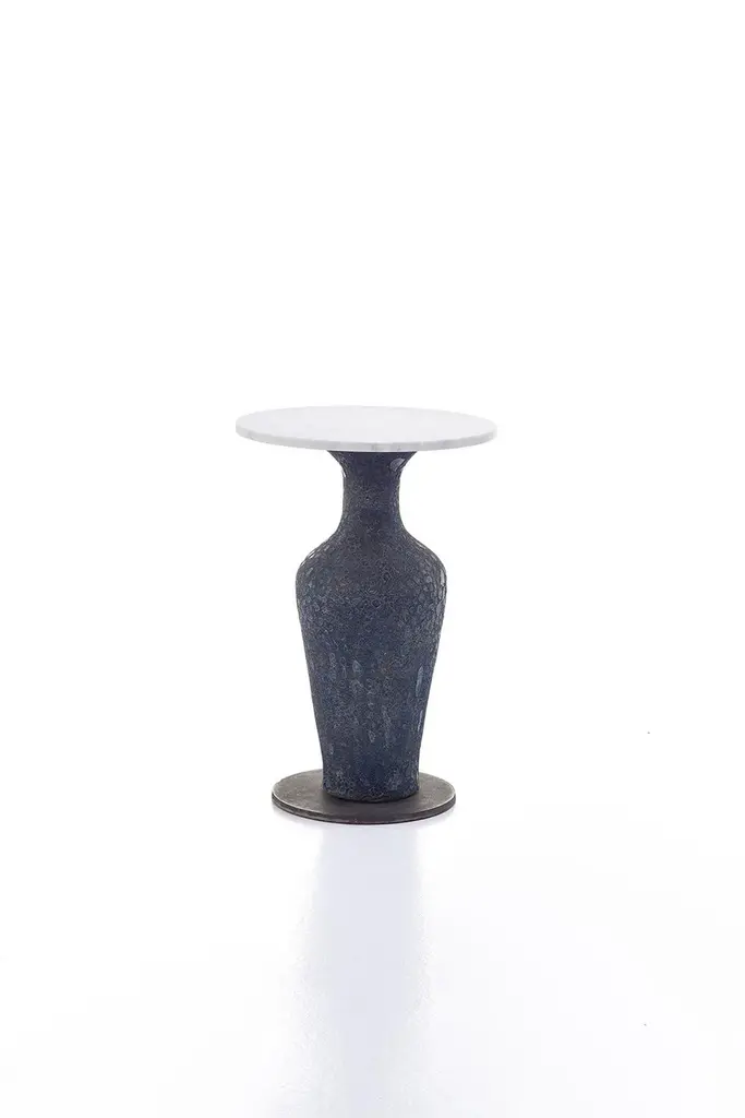 A bold combination of materials distinguishes the Moon 39/40/42 family of tables: available in different sizes, they have a blue ceramic base in the shape of an amphora, more or less elongated according to the height of the product, characterised by an irregular material surface obtained with a particular hand finish, which is combined with a circular top with different diameters, made of cast aluminium or white Carrara marble. Table, white Carrara marble top 20 mm. Column in blue ceramic, base in cast iron & with aluminium casting top 40 mmAdditional Information:Material: Marble, iron, ceramicFrame finish: Casting ironColumn finish: Blue ceramicTop finish: White carrara marbleDimension: Ø 50 x 73 H cmAvailable in other top finish options: Aluminium casting
