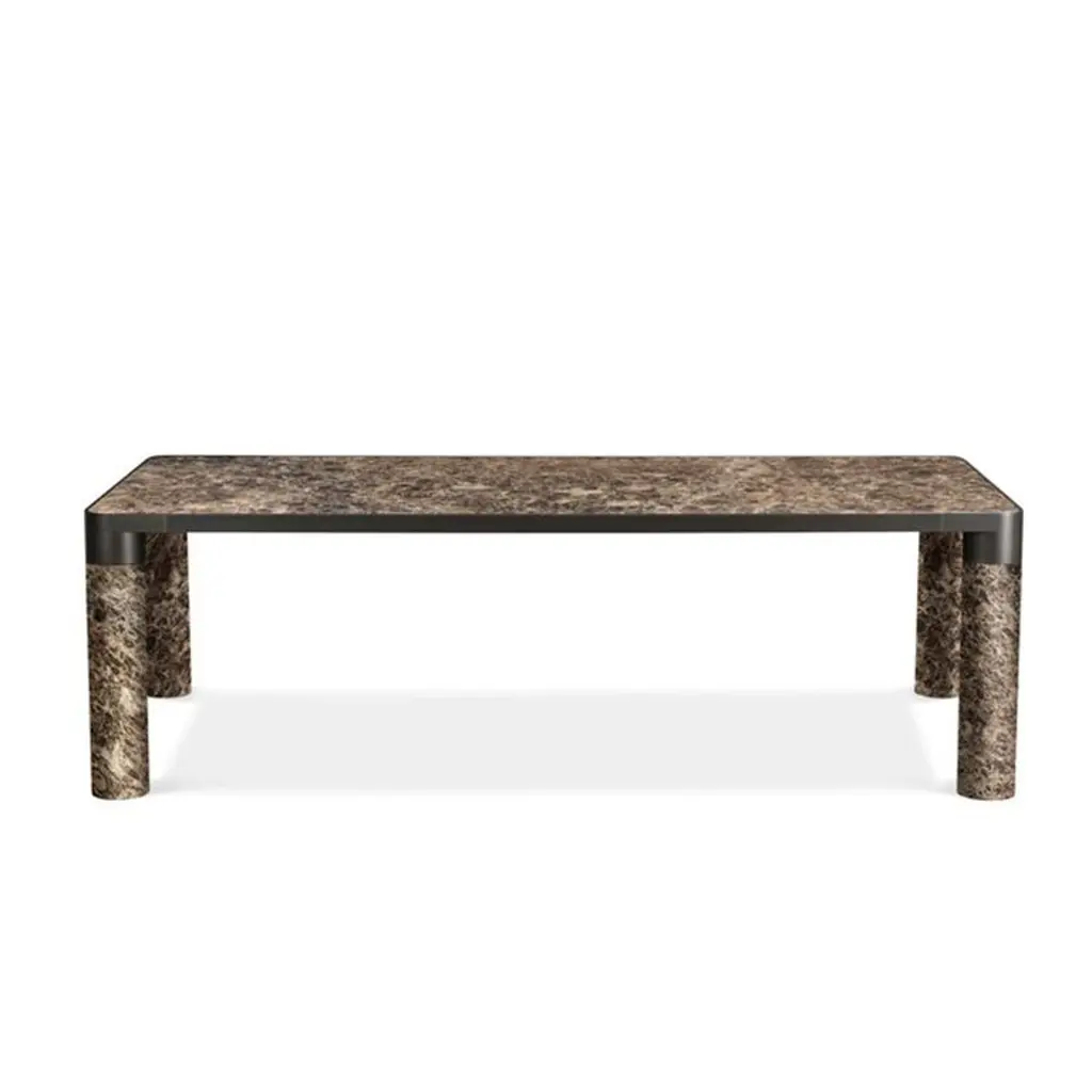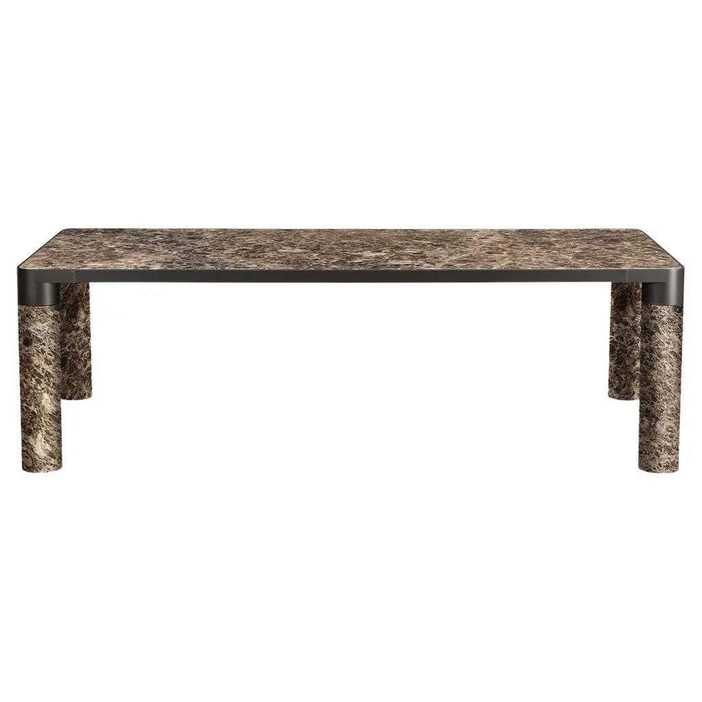 This family of products makes a bold statement with its generous cylindrical foot, connecting its structural perimeter while delimiting the objects that compose it. The distinctive metal rim that supports the seats, the tables, the cabinets, graphically encompasses the material with which they are made. This is beautifully portrayed in the tables, where the marble tabletop matches with the legs in turned marble, or with the armchairs featuring leather seats and legs of the same color. With the massive dimensions and the softness of the fittings, the materials are enhanced in their characteristics creating a sculptural effect and giving a distinct personality to each element of the collection.Additional Information:Materials: Brass, Emperador dark marbleDimensions: W 200 x D 120 x H 75 cmAvailable in other top options: Calacatta gold, sahara noir, carrara white, eramosa brown, woodAvailavle in other size option: Medium and LargeAvailable in other finish options: Polished brass, satin brass, light burnished brass, brown burnished brass, dark burnished brass.