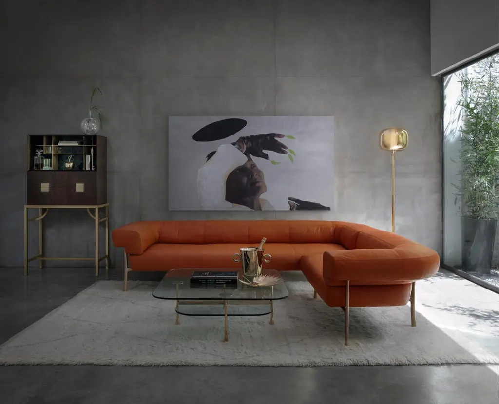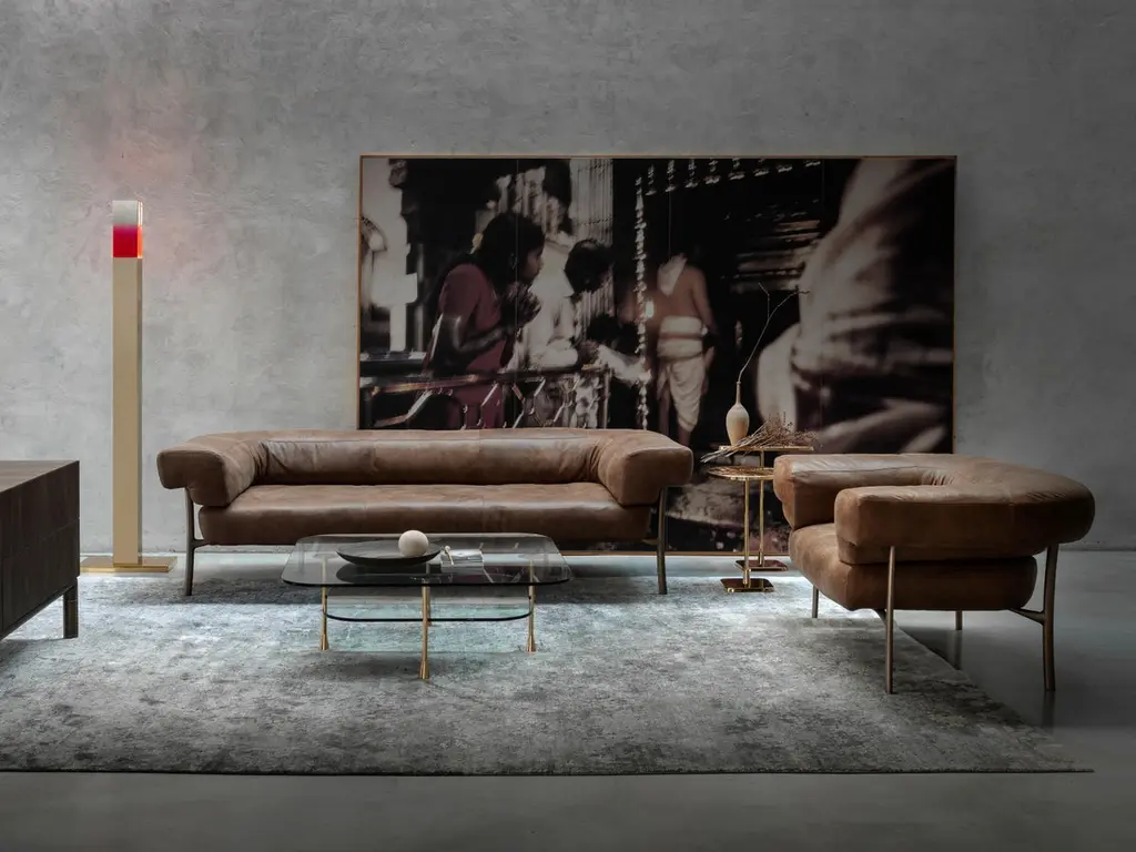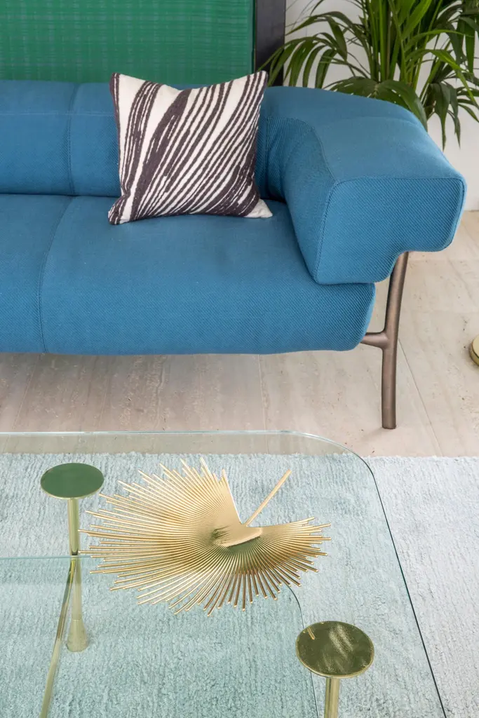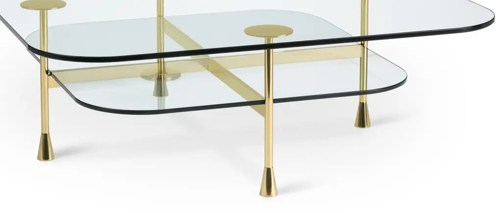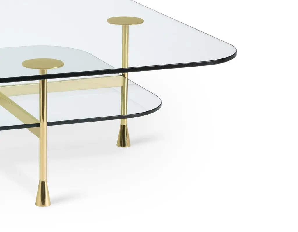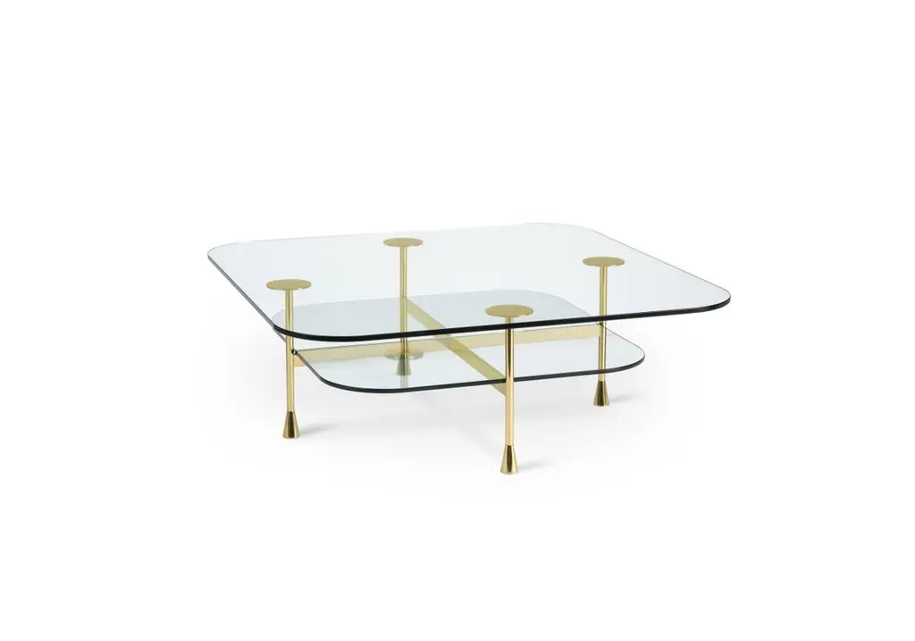 Side table in crystal and brassThe Vitruvian man and the idea of the human body perfection: this is how the designer sees this central coffee table shaped perfectly with the squared and round shape. The glass, in the double overlapping layer, reveals and hides at the same time the precious supporting structure in brass.Material:Brass and crystal.