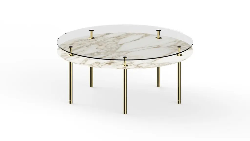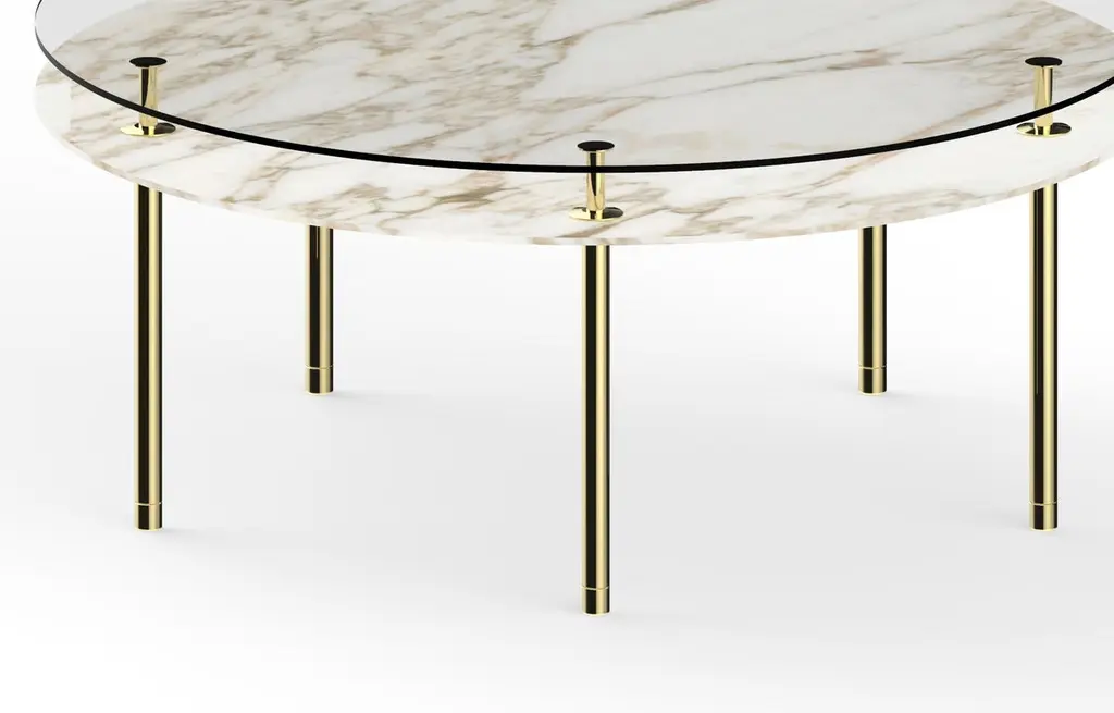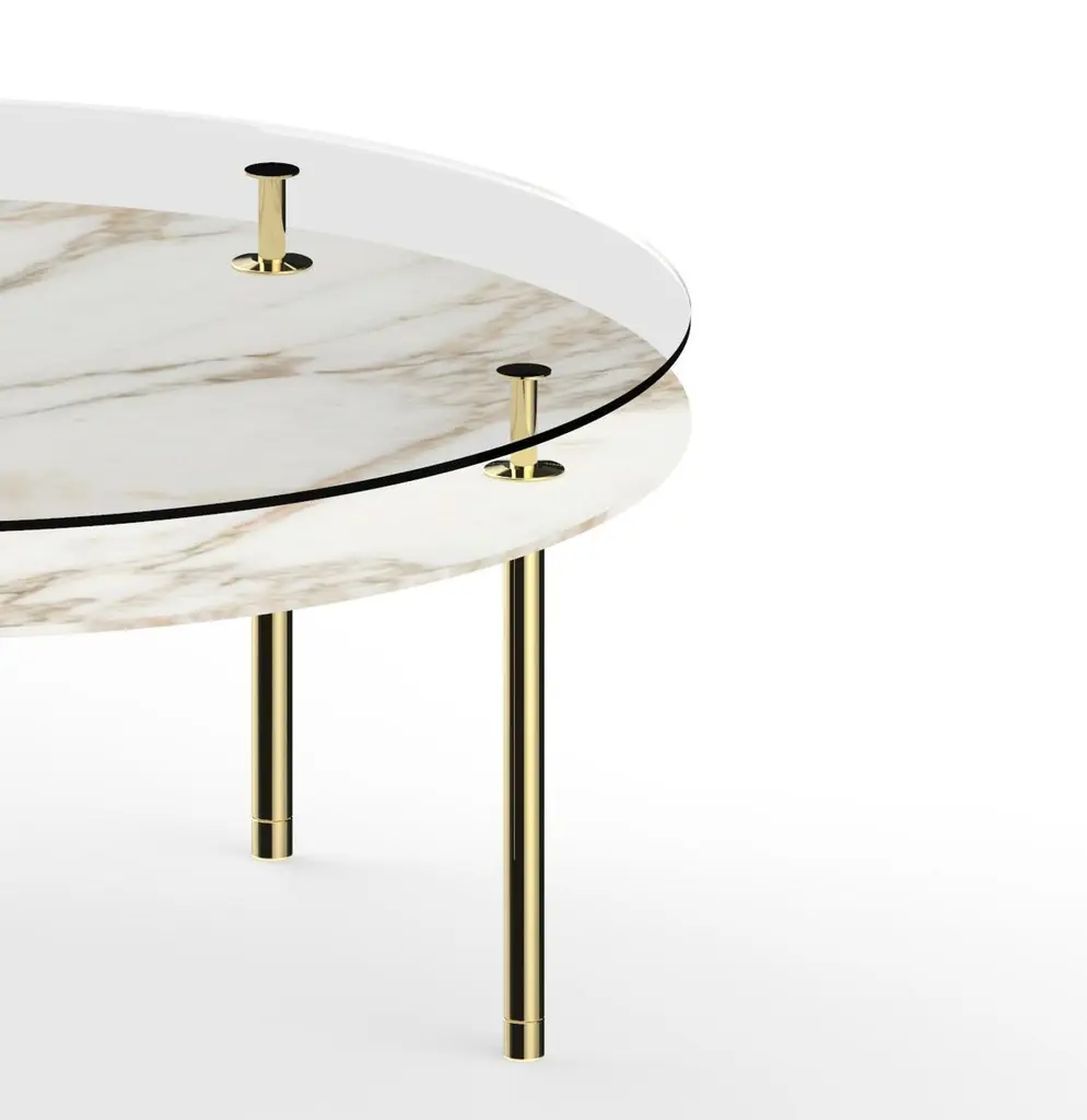Round table in crystal and brass. The designer imagines a turning point in the use of such a precious finishes such as polished brass: from the idea of almost a unique object in its perfect craftsmanship, to the system to be built starting from the base. A column made of brass whose different diameters define base and capital, just as the columns of Classic architecture. The column multiplies to infinity, is interrupted and then resumed to hold glass tops, wood or marble and configure even angular shelves, tables, small tables, displays and consoles. A landscape of almost infinite possibilities that designers and end users can chose from to organize the space both in domestic and contract situations, maintaining aesthetic uniformity in the name of a more refined elegance.Materials:Calacatta gold, brass and crystal.