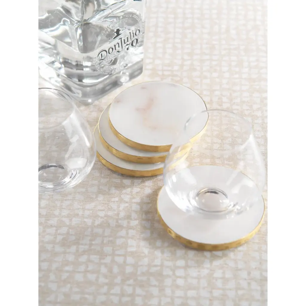 Protect your tabletops and table linens with these stylish marble coasters. These natural, white marble coasters are finished with a painted gold edge. Exuding casual elegance, these coasters offer refined beauty to your space.