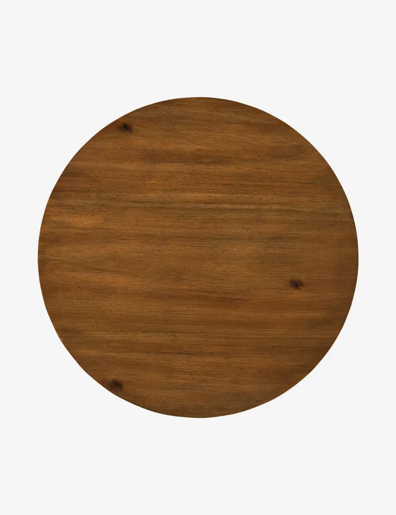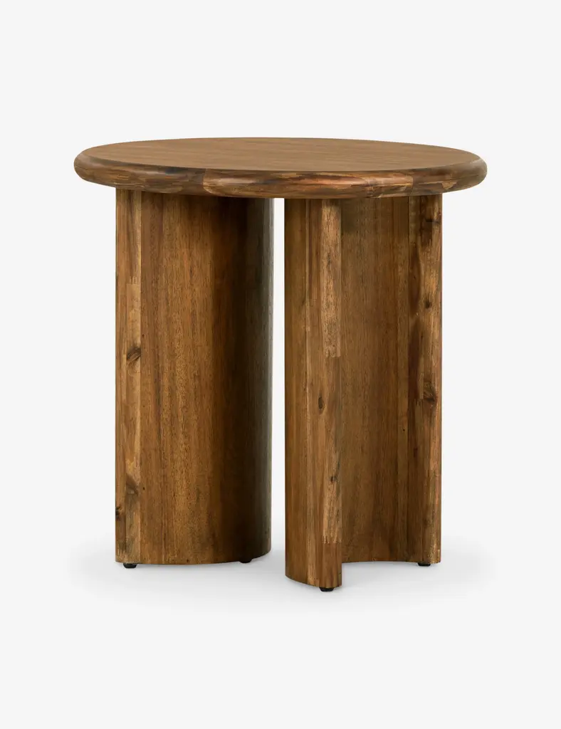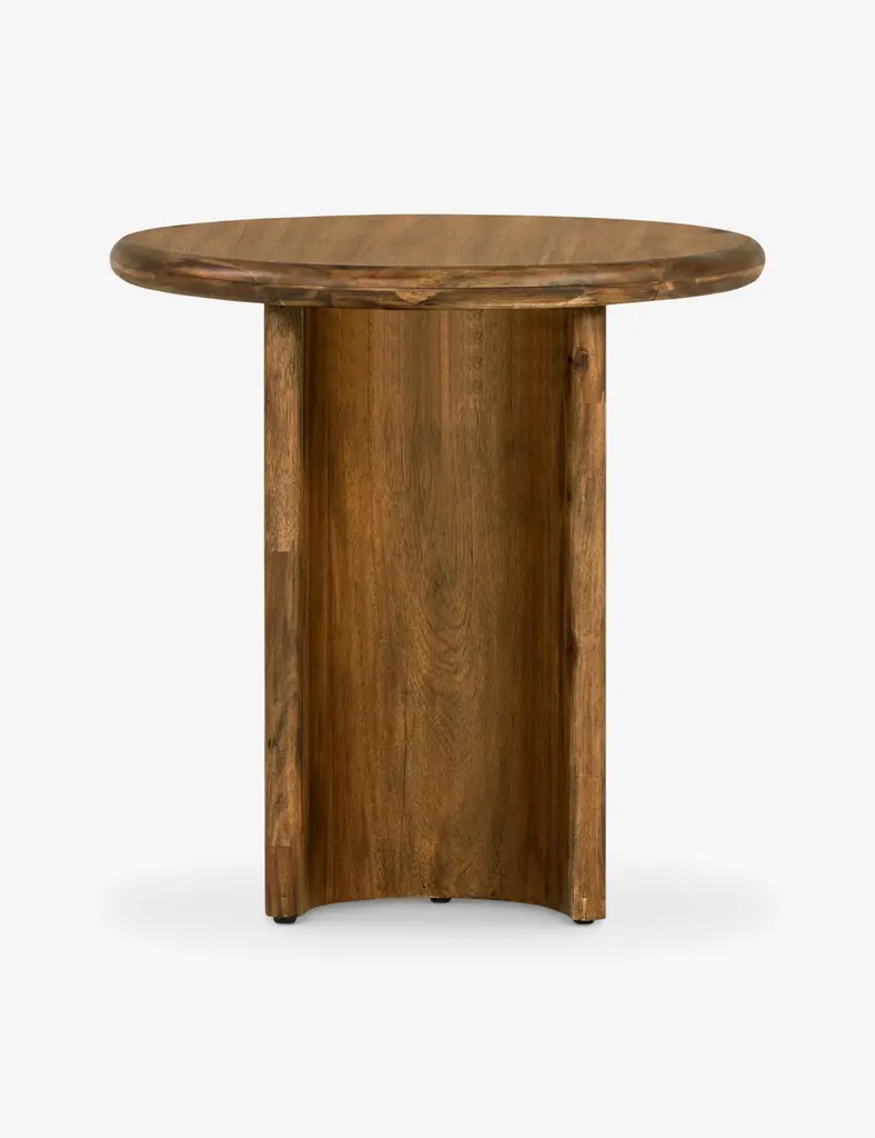 Clad in a thick acacia veneer, the delicate lines of this round side table are reflected in the curved legs to offer a sturdy design with a softer, rounded profile. We love this end table styled next to a clean-lined sofa or chair for a refining touch.