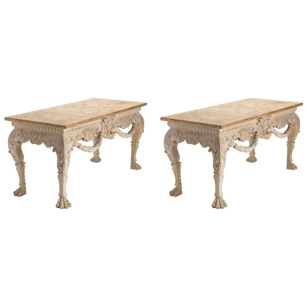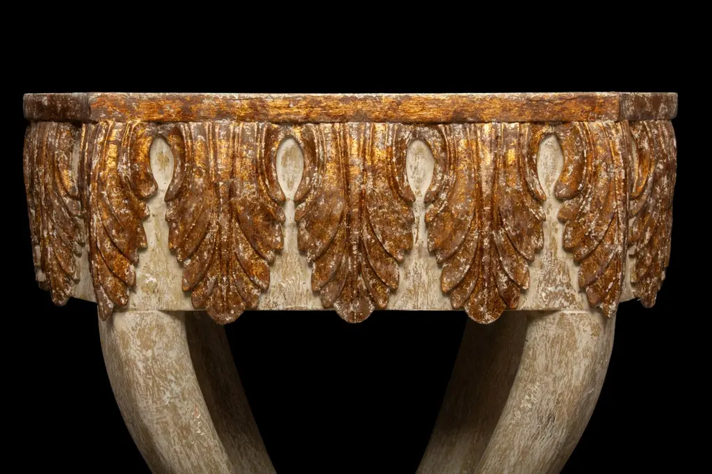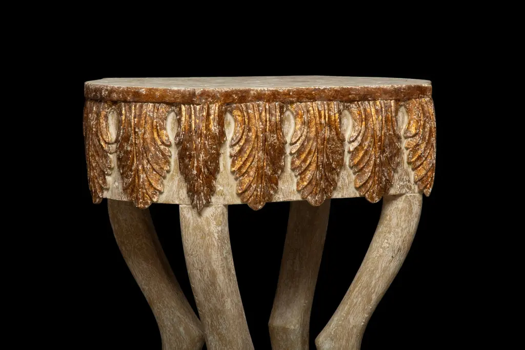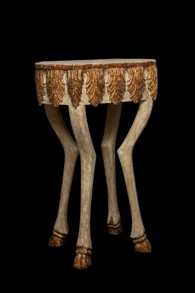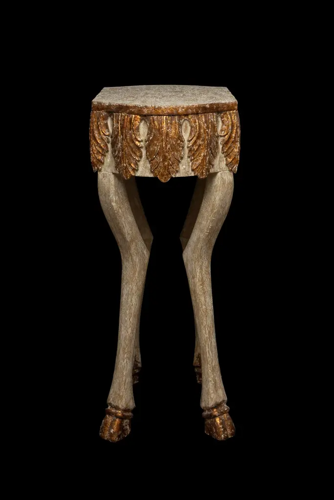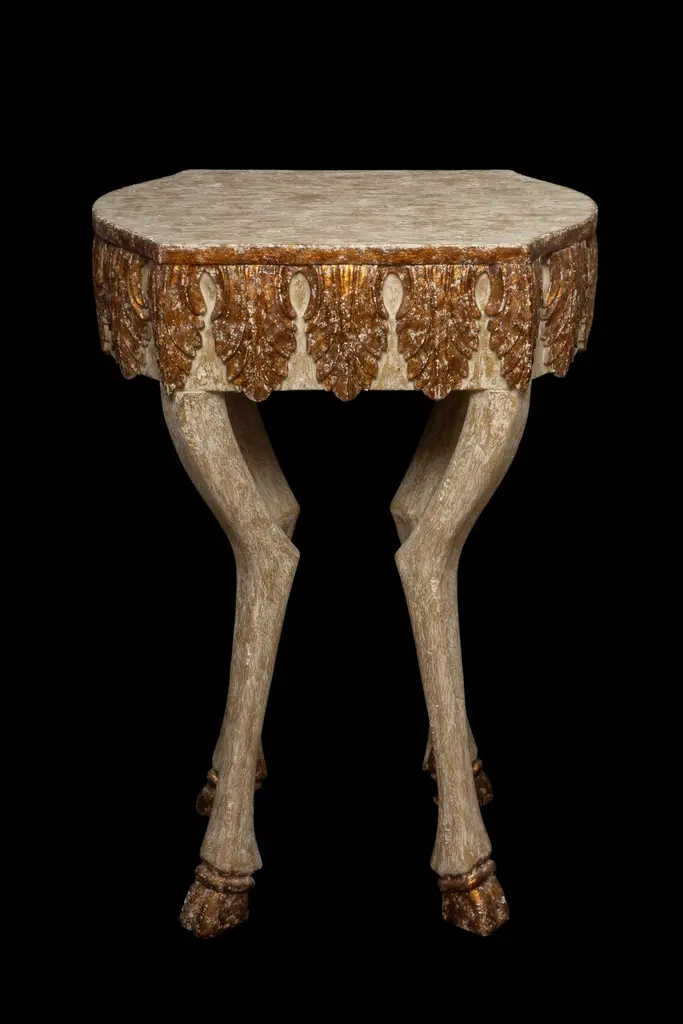 Exquisite Carved Wood Side Table featuring a stunning white-washed finish adorned with delicate gilded accents, all supported by intricately carved hoof legs. Crafted with meticulous attention to detail, this charming side table from the renowned Creel and Gow is sure to evoke a sense of delight and sophistication in your living space. Its expertly carved woodwork and whimsical design make it a unique and eye-catching addition to any room, adding both functional elegance and a touch of whimsy to your home. Embrace the fusion of artistry and functionality with this piece that's bound to bring joy to your everyday life while showcasing your impeccable taste in decor.Large - 19 1/2" x 12" x 30" HAlso available in a smaller size:Small - 15" x 10 1/2" x 21 1/2" Hend tableside table