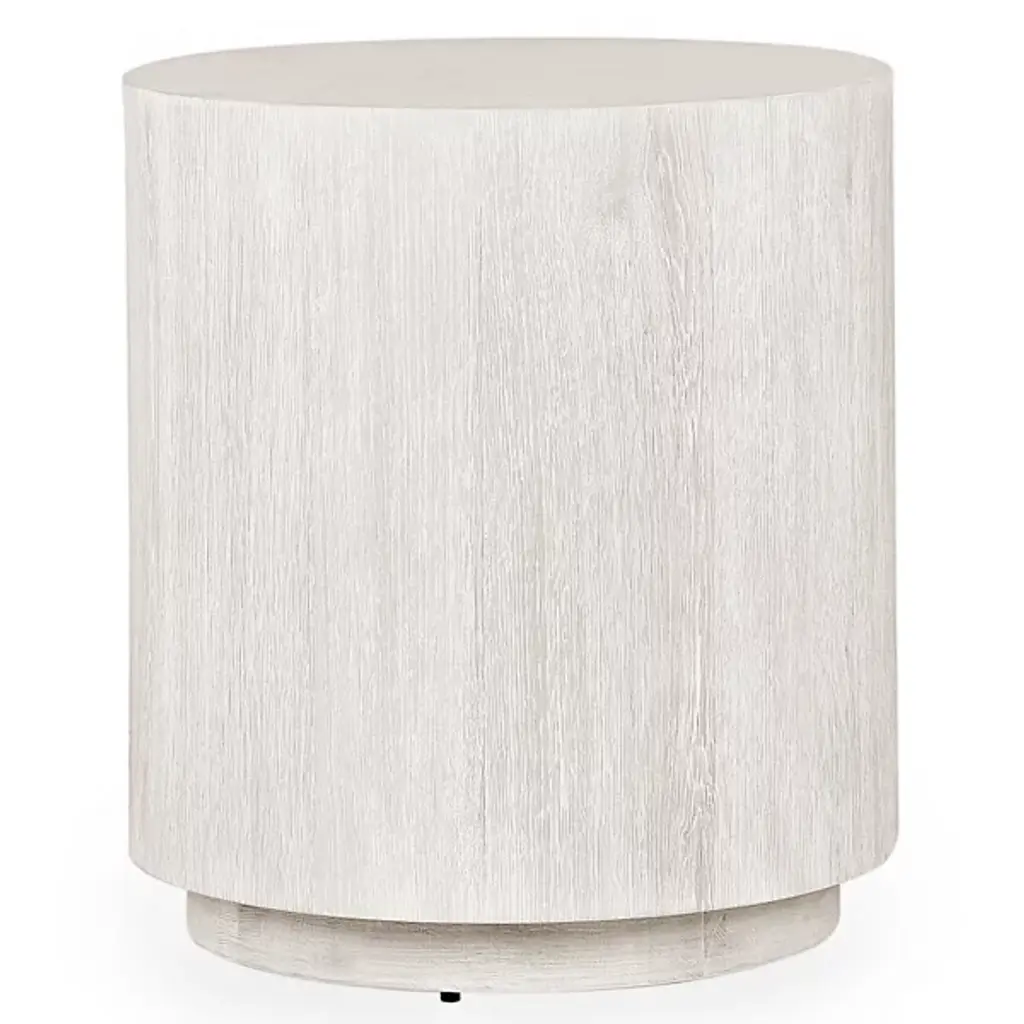 Brighten and refresh your space with our Ginny accent table. A multi-step, white-washed finish gives this piece its muted shine while a fixed shelf and a sleek barrel shape complete the look. This accent table is also crafted with high quality mango solids and veneers.