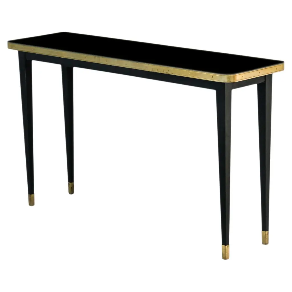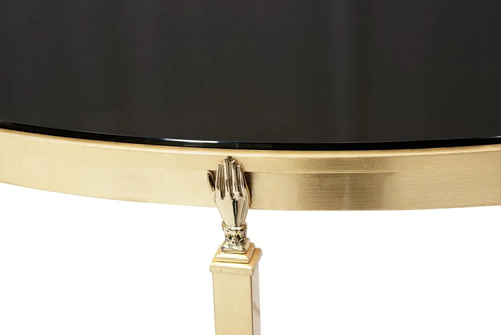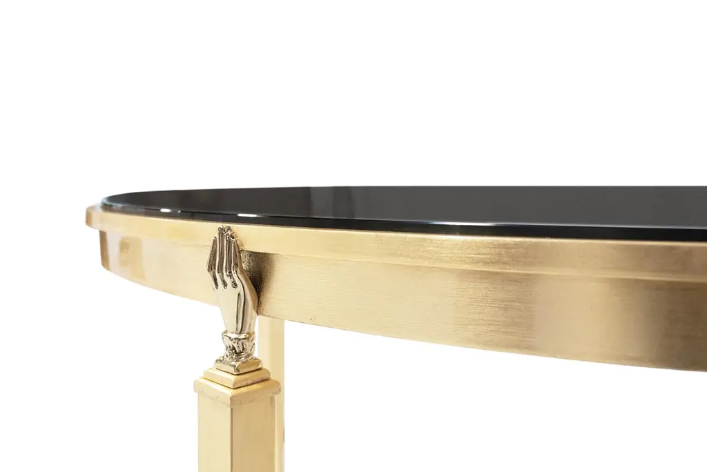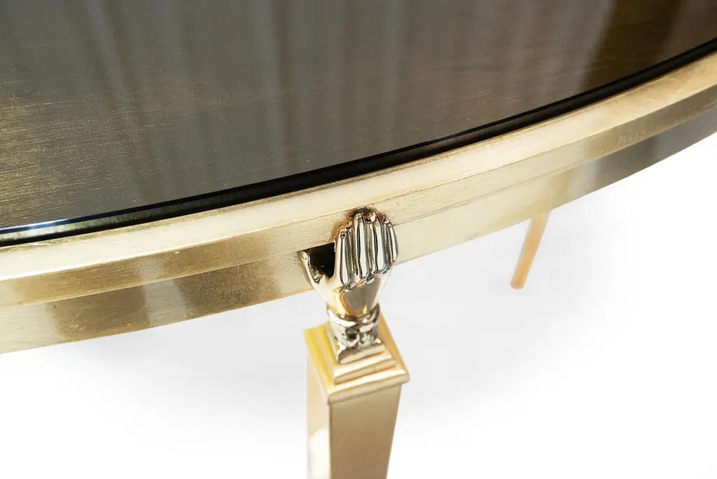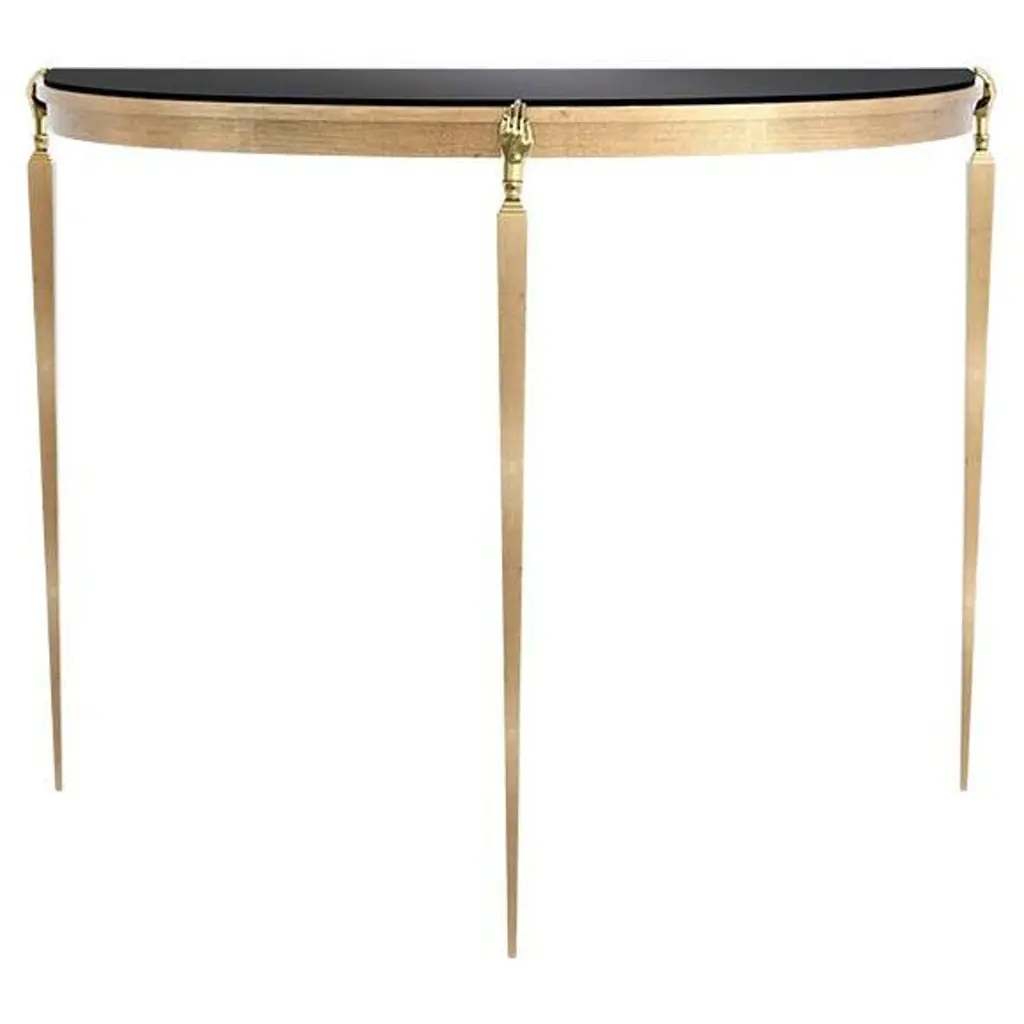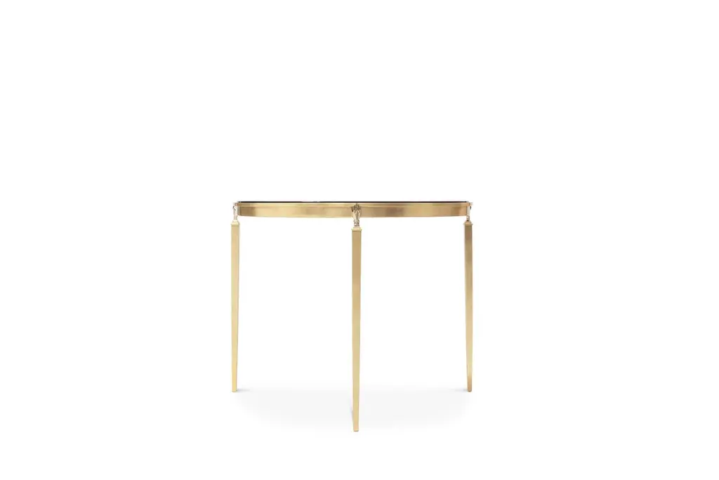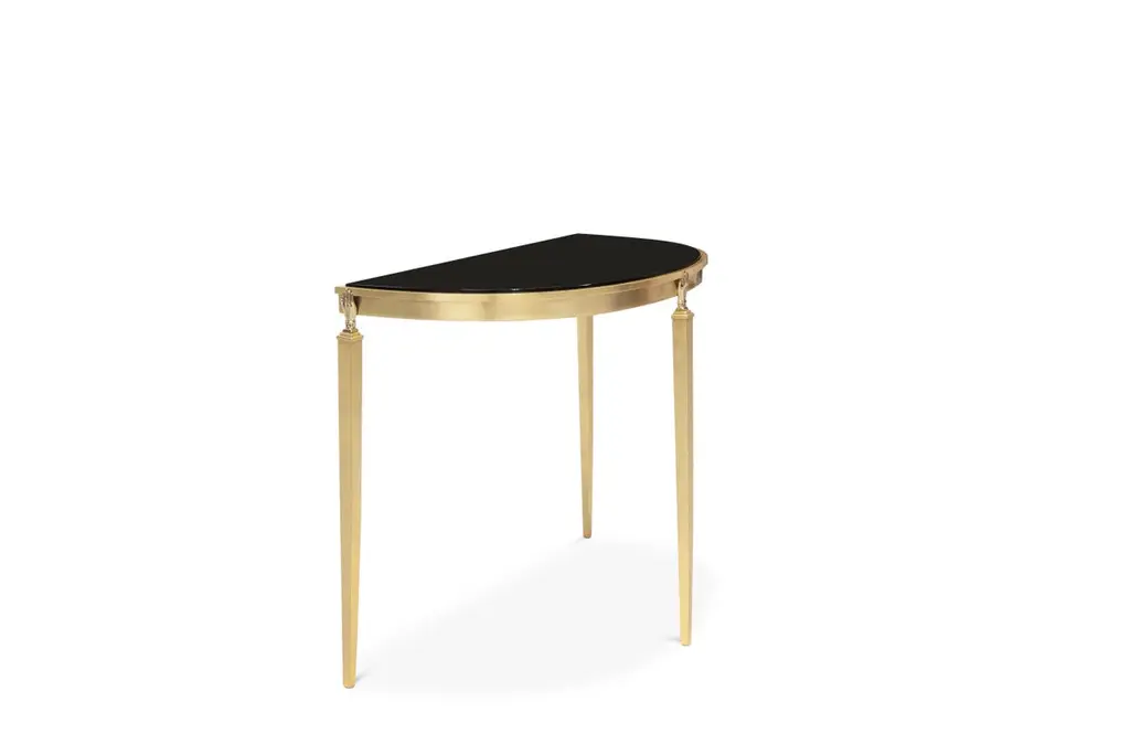 Slender elegance radiates from the Gisele Demi-Lune Console. Delicate brass hands set upon three perfectly appointed legs hold up the piece’s crescent-shaped top. Offering a perfect entry statement, hallway accent or living room side table, Giselle’s grace will delight any space she resides.