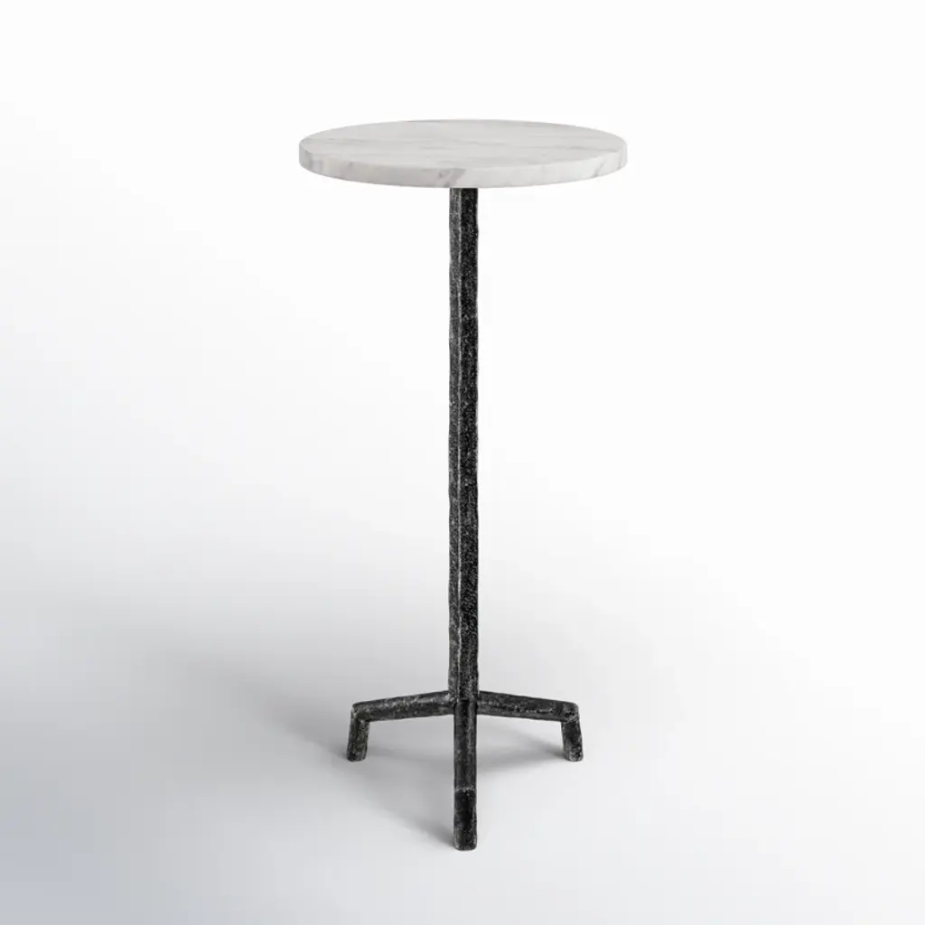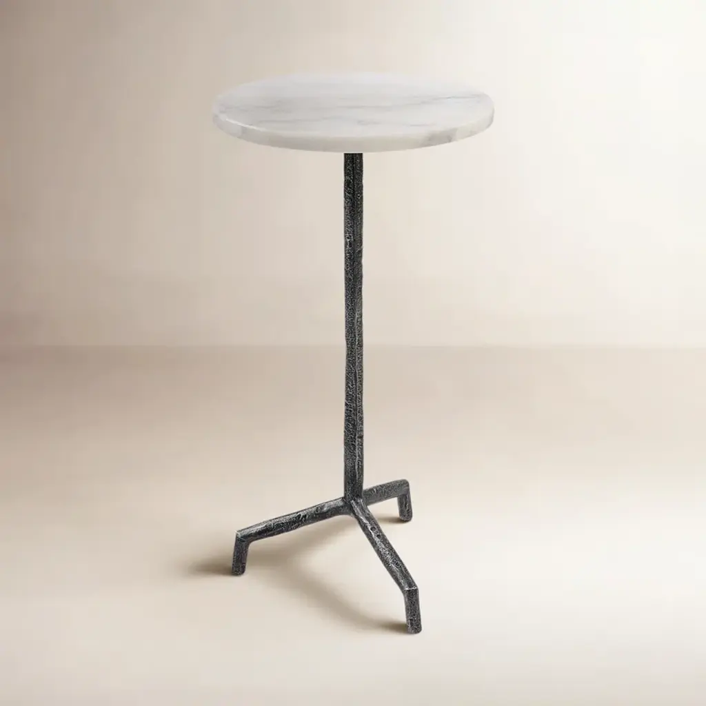 This Giza drink table is the perfect resting place for your beverage or favorite novel. The heavily textured iron base is finished in a rustic aged black and topped with naturally veined white marble.