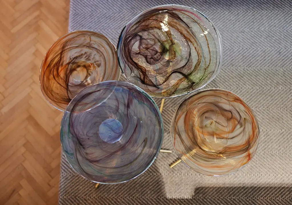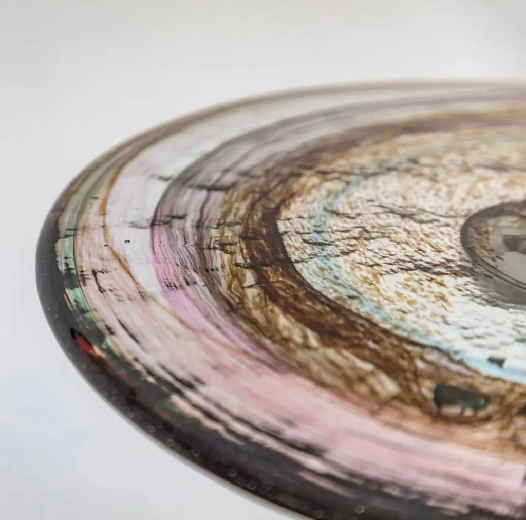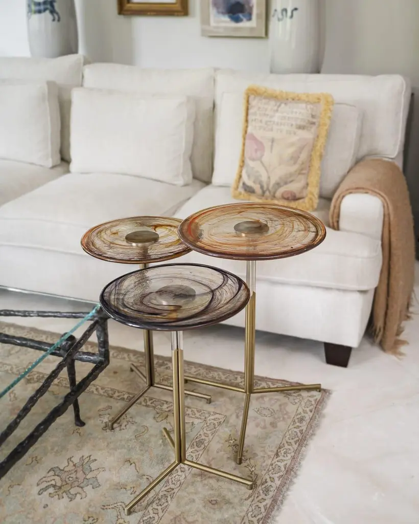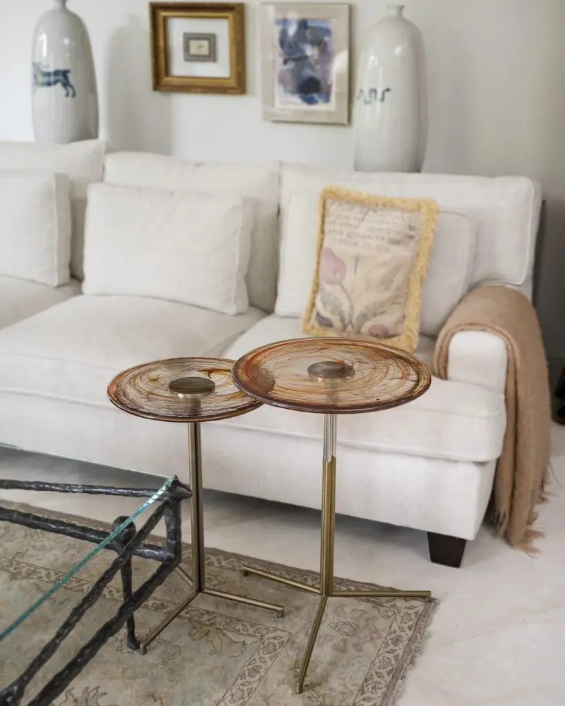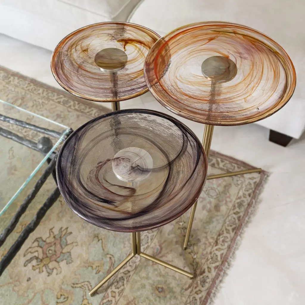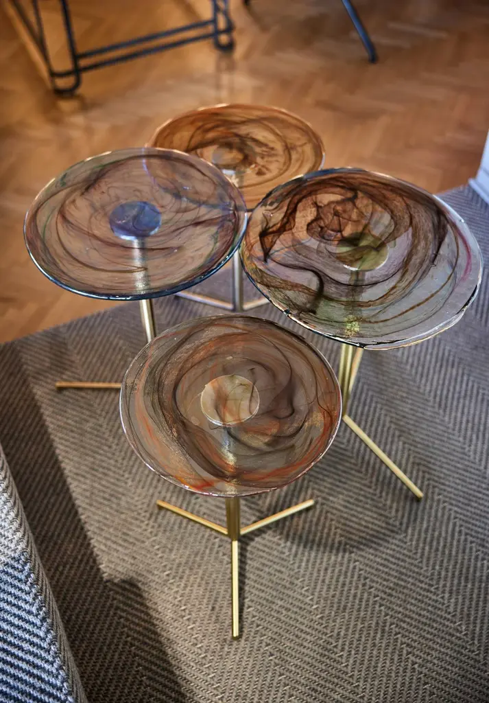Flat Glass is the prefect unity of artisanal hand work and machine work. Glass part is produced by sculptor Tina Varon. Due to artisanal hand work of glass, each flat side table is one-of-a-kind. There may be slight differences in the dimensions due to the production technique.Material & Finish Top: Handmade rolled glassBase: Antique plated metal or Gold pvd titanium plated stainless steelAvailable in different colours.