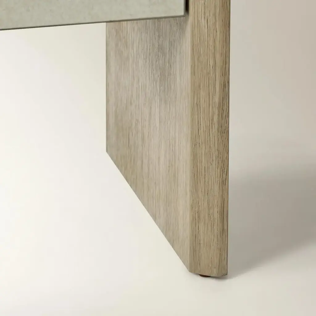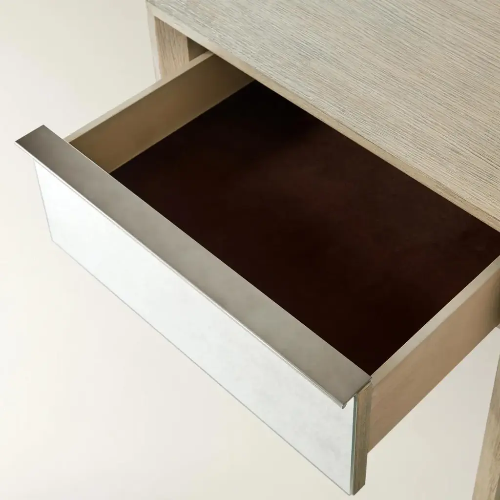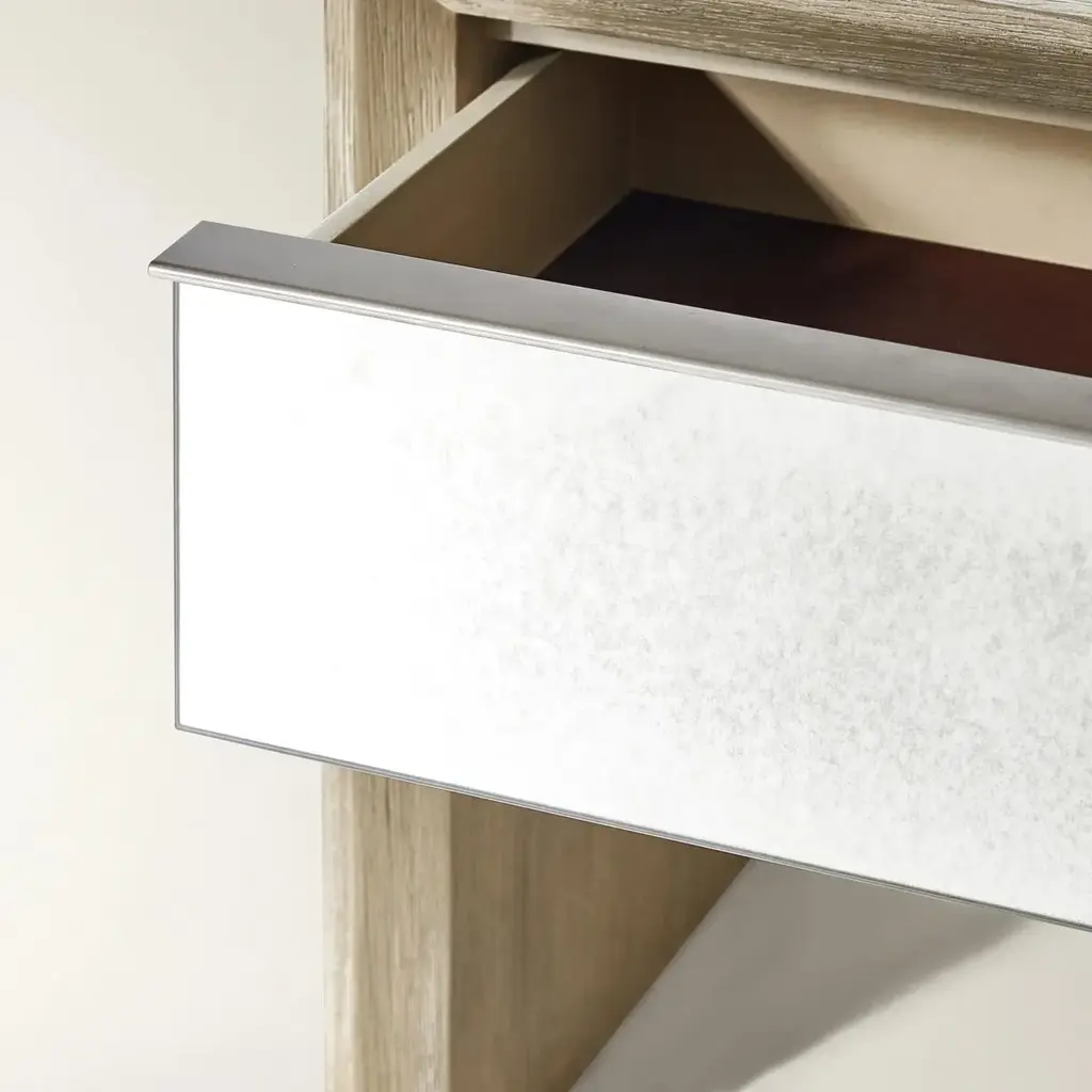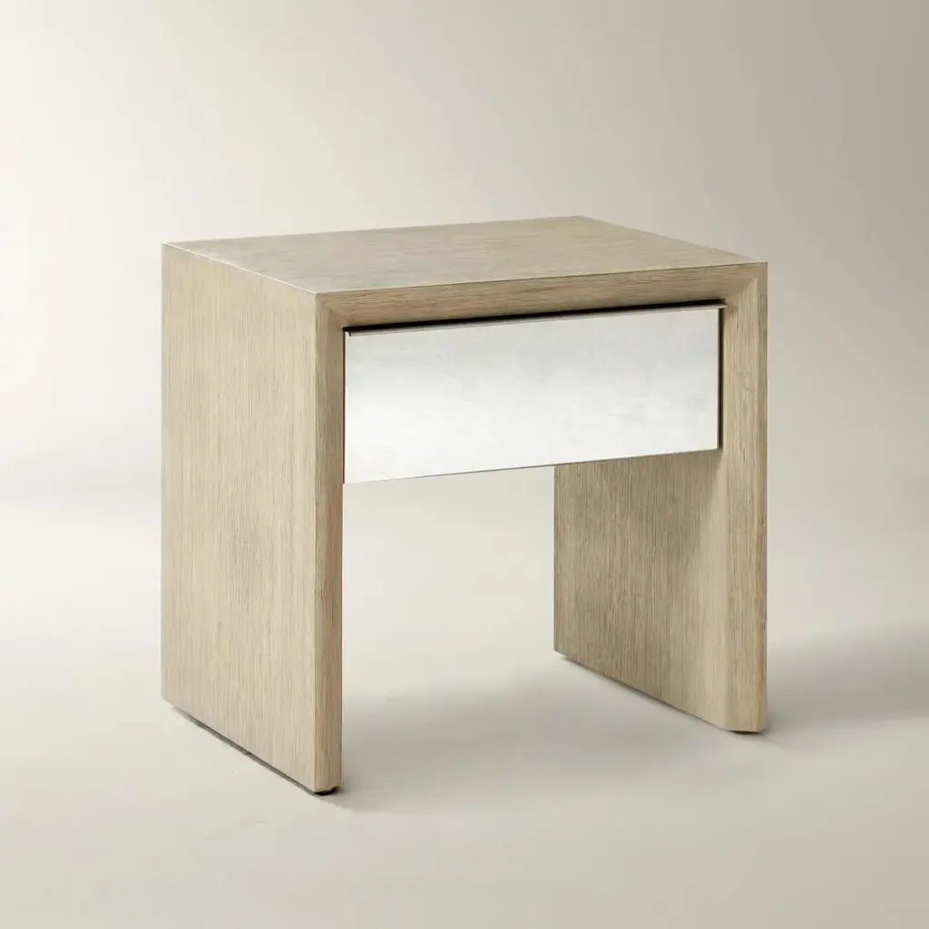 The Glimmer Nightstand adds a refined shimmer to your bedroom with its thoughtful blend of materials and timeless silhouette. A warm oak veneer frame brings natural texture, while the antique mirror-faced drawer front introduces a soft, reflective glow. The result is a glam bedside table that feels both elevated and effortlessly livable. A soft-close drawer glides smoothly to reveal storage for books, nighttime essentials, or small treasures, keeping your space serene and clutter-free. Whether styled in a classic, transitional, or modern interior, this oak and mirror nightstand offers a subtle statement of sophistication.ZG Exclusive