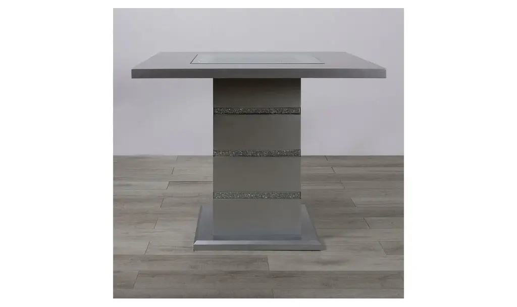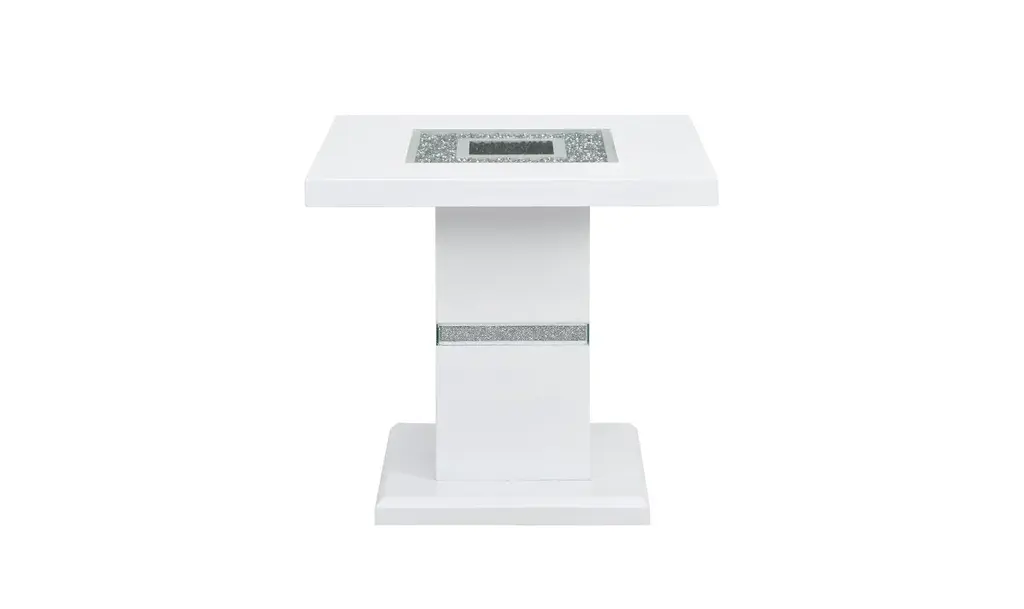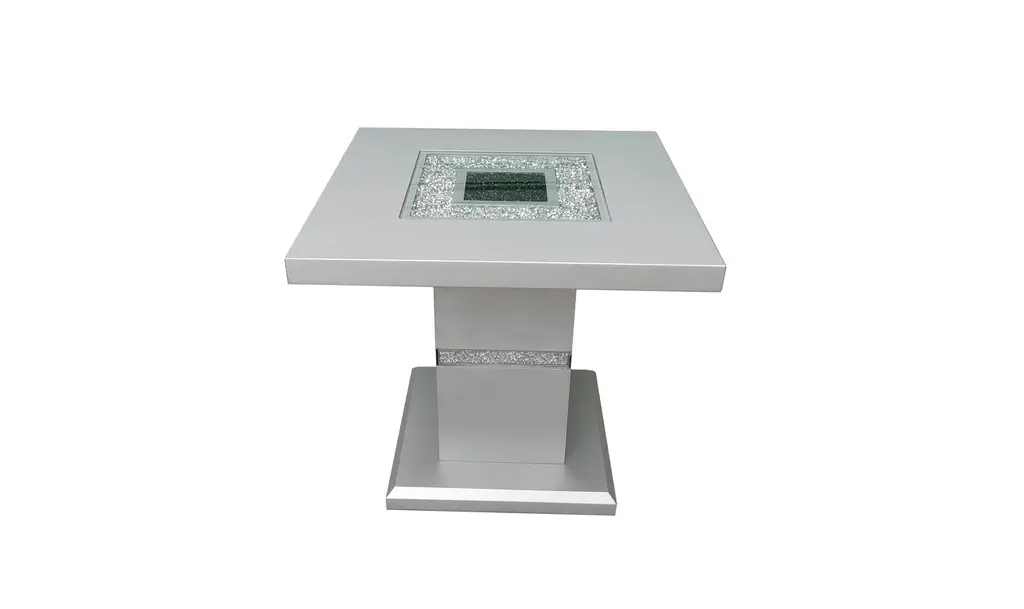 [Specifications] Dimensions (in) W: 26" x D: 26" x H: 24" Series Chronos Color Silver, White and Glitter Style Contemporary Material MDF, Glass and Acrylic Type Table Top Material Glass Shape Square Base Type Pedestal Drawers Included No Number of Shelves None Lift Top No Hand Crafted No Tray Top No Number of Boxes 2 Box1 Shipping Dimensions (in) W: 29" x D: 30" x H: 7" Box2 Shipping Dimensions (in) W: 13" x D: 13" x H: 23" [endSpecifications] [Features] Durable construction Glass inlay Tempered glass Embelished crystal detail [endFeatures]