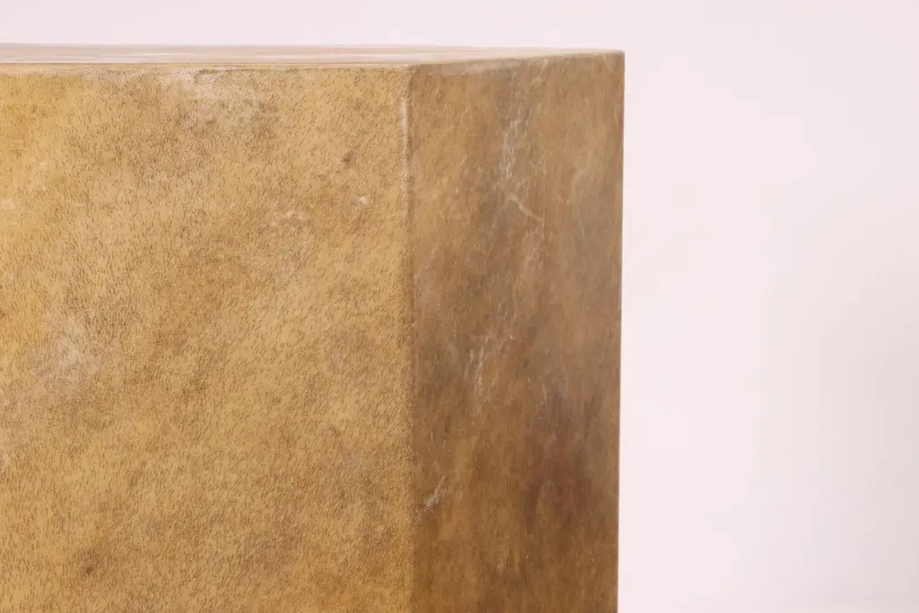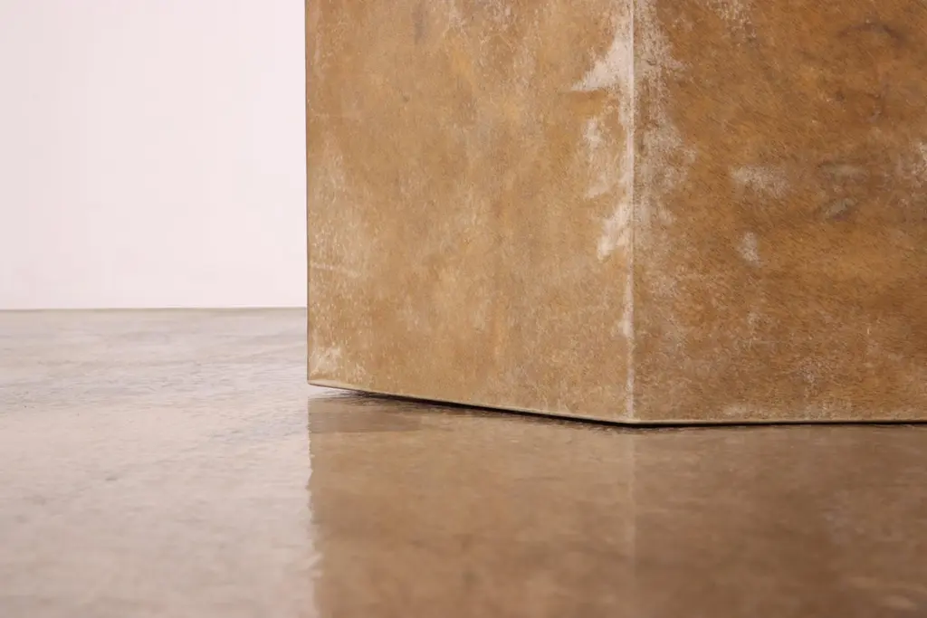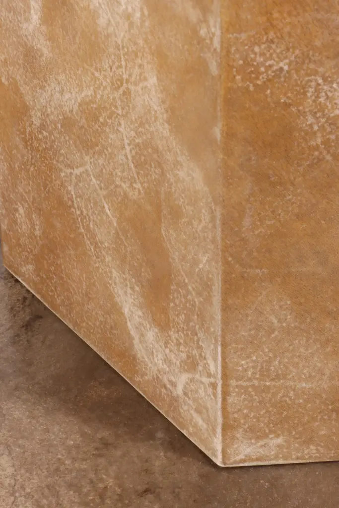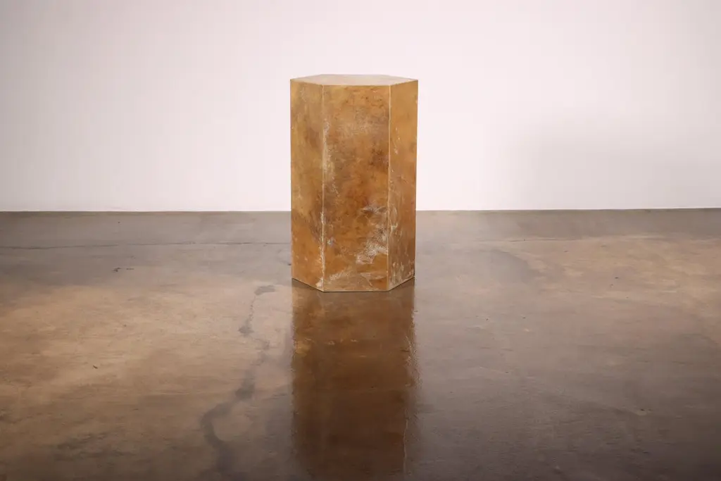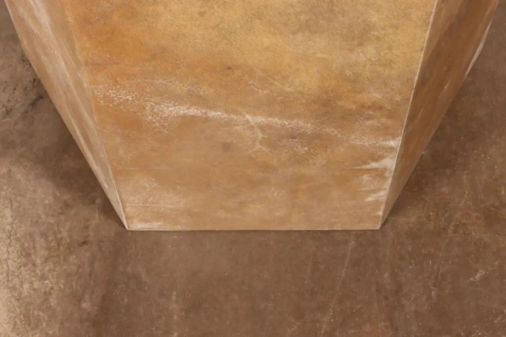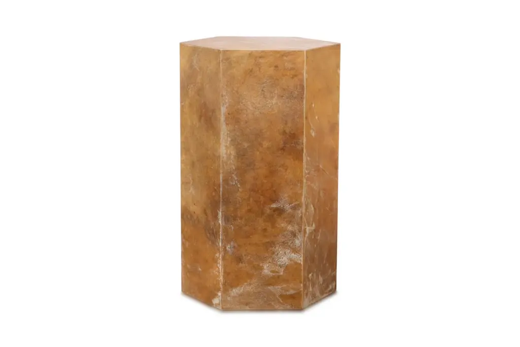 Pergamino Hex Caramel Goatskin Modern Side Table by Costantini Design15" x 15" x 22" H as shown. Custom sizes and shapes available.Our line of hex tables are understated geometric form that can be used aloned or grouped together to form larger modular pieces. The Pergamino Hex employs sustainably sourced goatskin from Argentina whose natural coloration and texture complement the piece's minimal form. Available in either natural or caramel color. Shown here in caramel color.Other materials available are Argentine Rosewood, Oak, Maple, Cherry, Beech, Elm, Okume, Teak, African Teak, Bird’s Eye Maple, Black Maple, Bubinga, Cerused Oak, Cerused Gray Oak, Gray Oak, Ebony, Macassar Ebony, Striped Macassar Ebony, Walnut Burl, Sycamore, Walnut and Zebrawood. Available in matte, semi-gloss, high gloss finish or lacquered.About Costantini DesignCostantini has been a trusted source for custom furniture, objects and lighting for a global client base since 2002. Its founder and owner, William Stuart, is a designer and artist who began his career as a multimedia artist and sculptor, practices which continue to inform the work. With a studio showroom in New York and a team of artisans at their own workshop in Buenos Aires, the Costantini team is able to connect artisans and artists with acclaimed clientele around the world. Its artisans work across many disparate materials such as bronze, solid wood, fiberglass, steel, plaster, goatskin, leather, rush, iron, marble, sheepskin and more. Visit their New York or Buenos Aires locations by appointment.