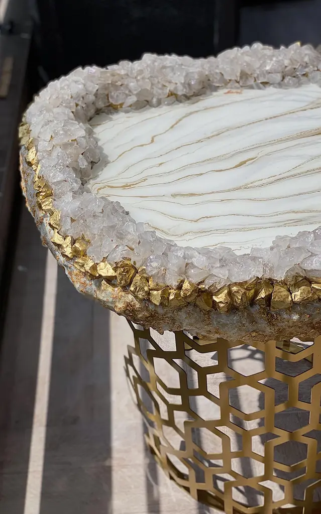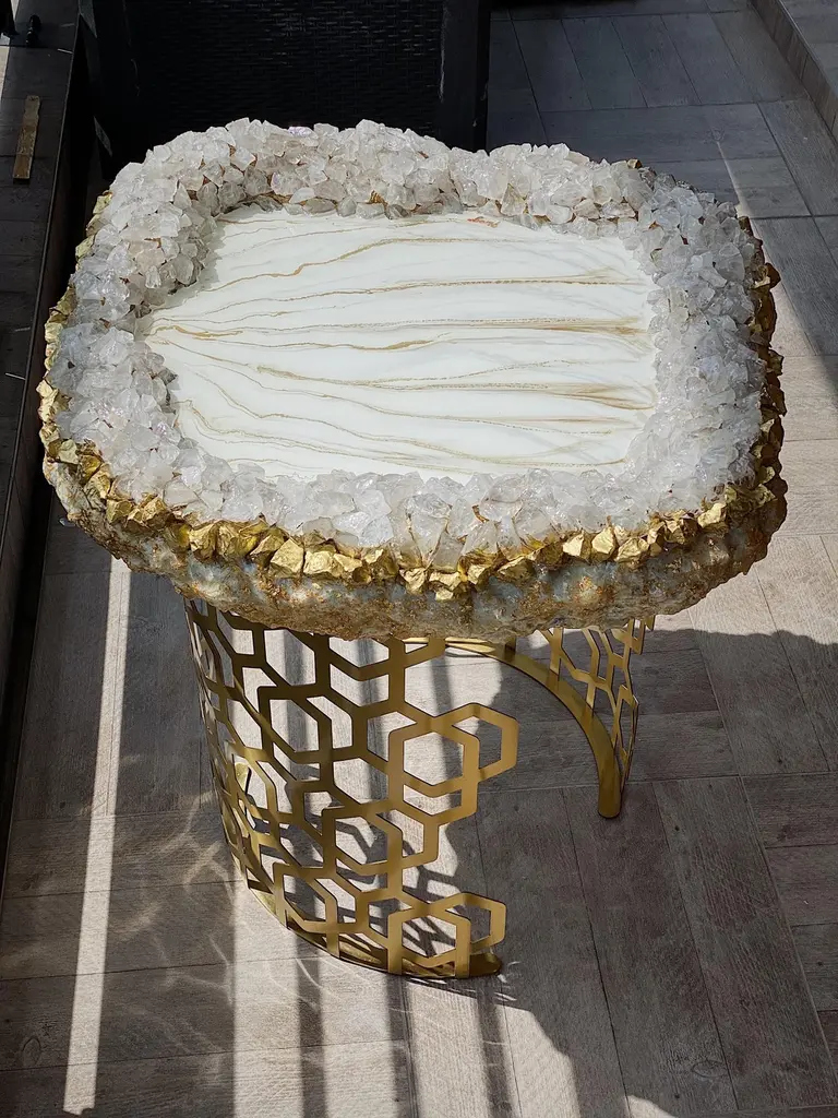Beautiful geode inspired table with natural quartz and marble effect made with resin. This table is generously dusted with natural Quartz, a gemstone revered for its potent energy amplifying properties. Each piece bouncing off light, every pattern telling its own story, and through it all, Quartz sends forth its peaceful vibrations, harmonizing your home. Witness the miracle of nature meet the finesse of design in this distinct piece of furniture. this table comes with stainless steel gold base. Be prepared for its captivating beauty to become a conversation starter