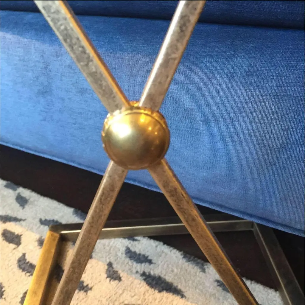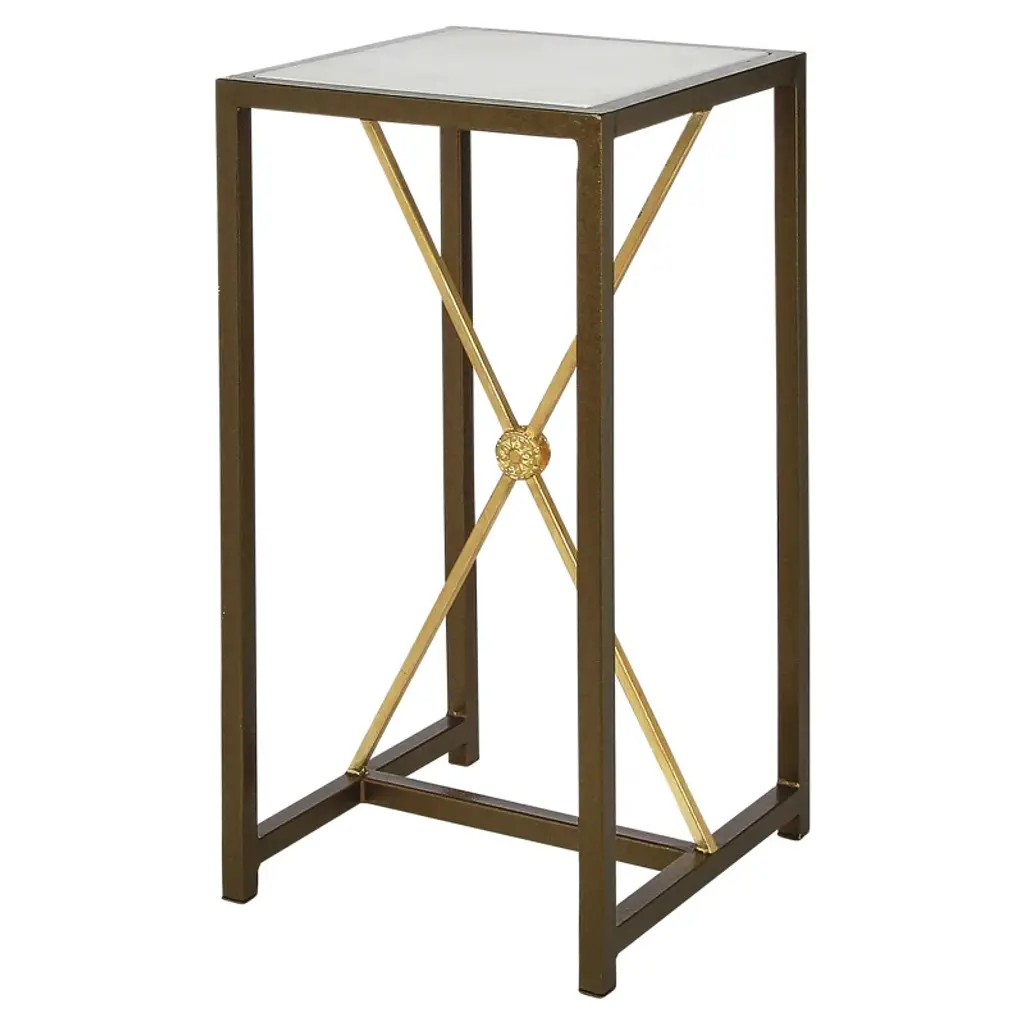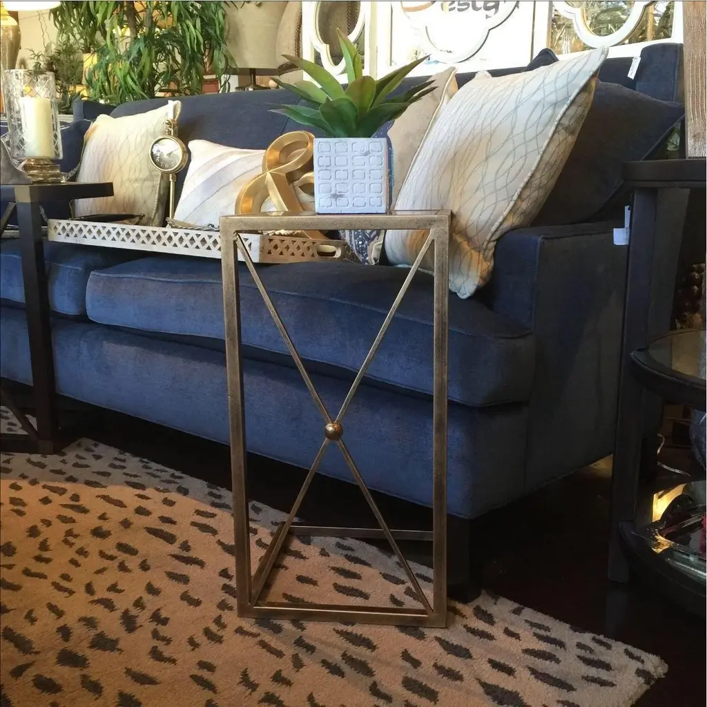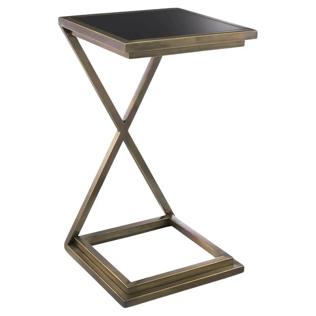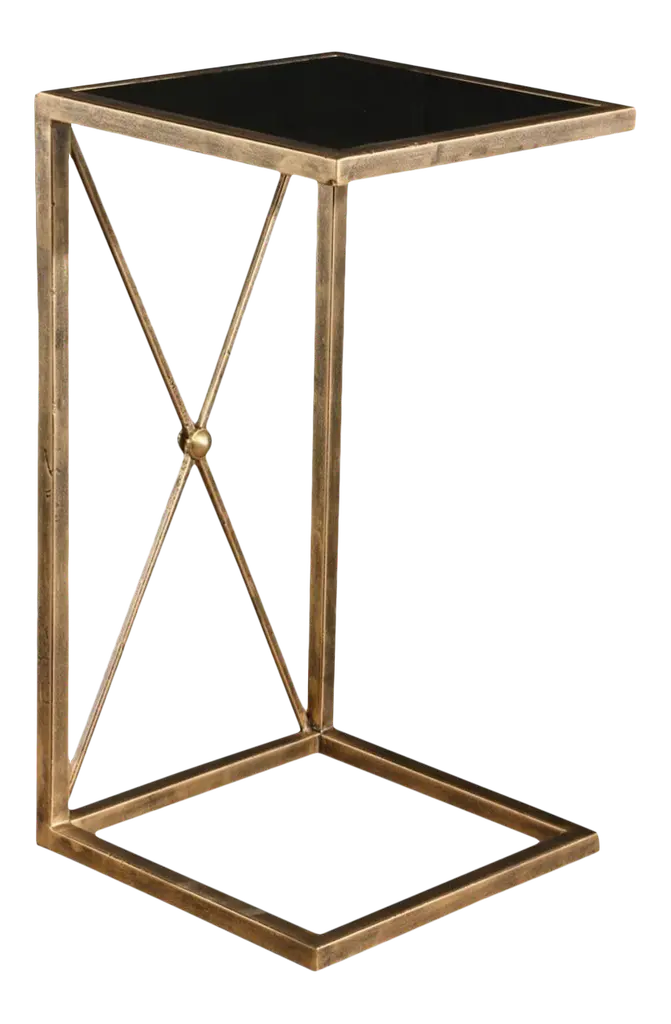This cool little table slides under your chair or sofa so you can have everything at your fingertips (phone, lap top, cocktail)! Made of beautiful antique gold finish over metal structure with black gloss glass top. Now that's style! New in box. Regency Campaign Transitional Federalist