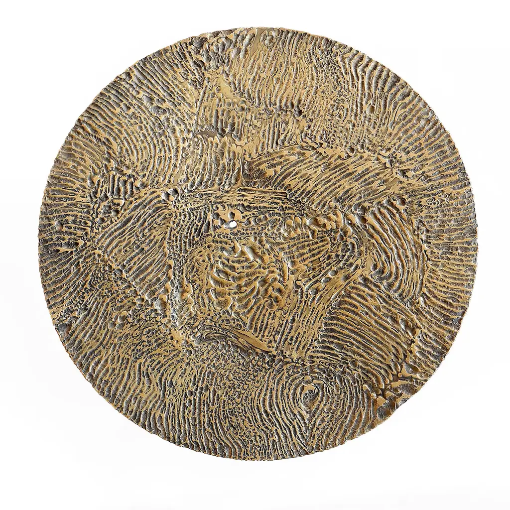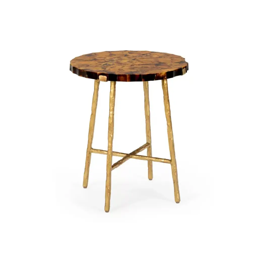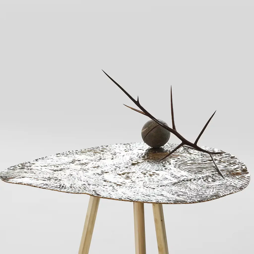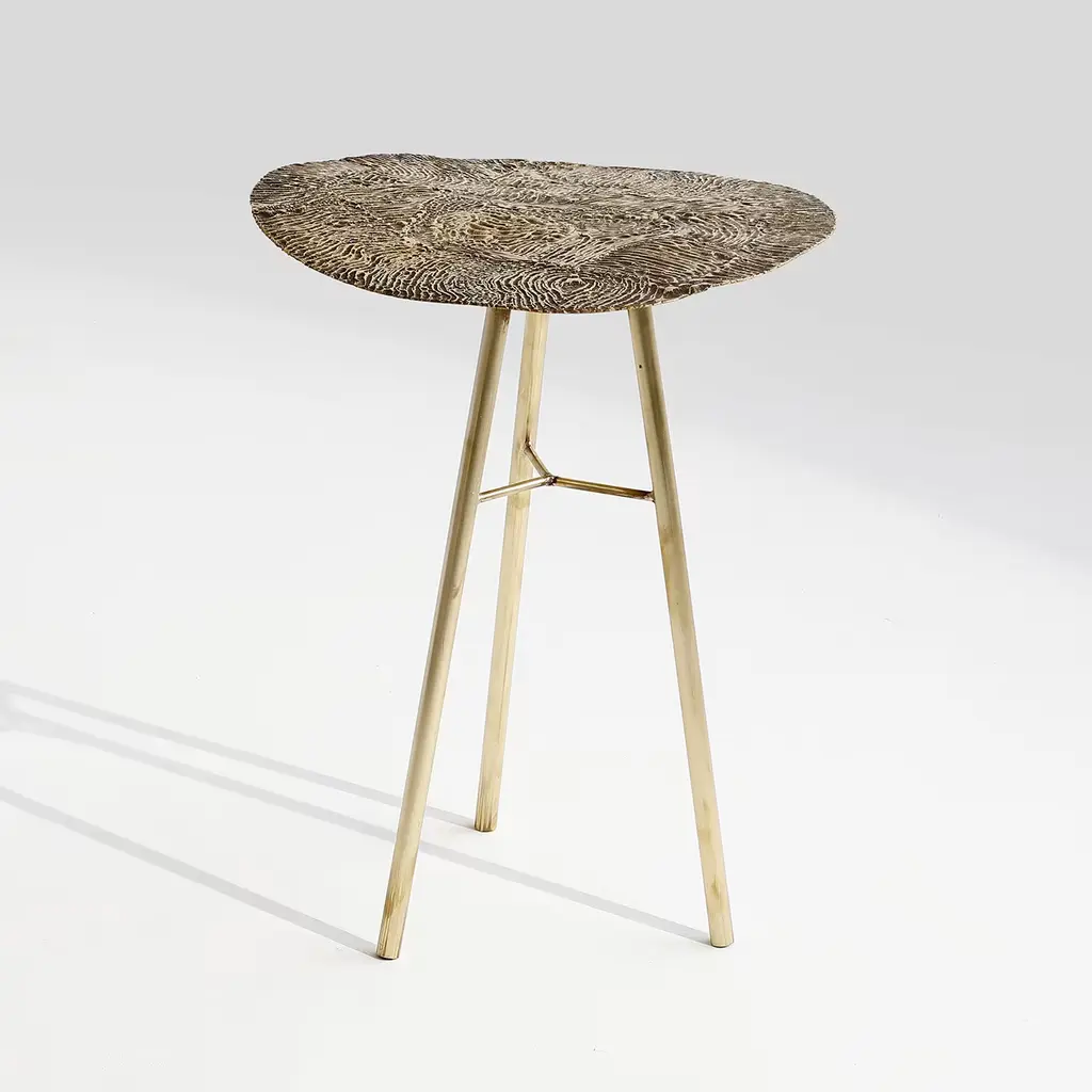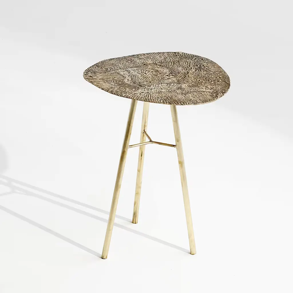 Entirely crafted of brass worked on the flame, this striking side table exudes an organic allure that suggests how time shapes nature. The three-legged structure with a burnished finish supports a top with irregular edges boasting textural waves reminiscent of the rings within a tree's trunk.