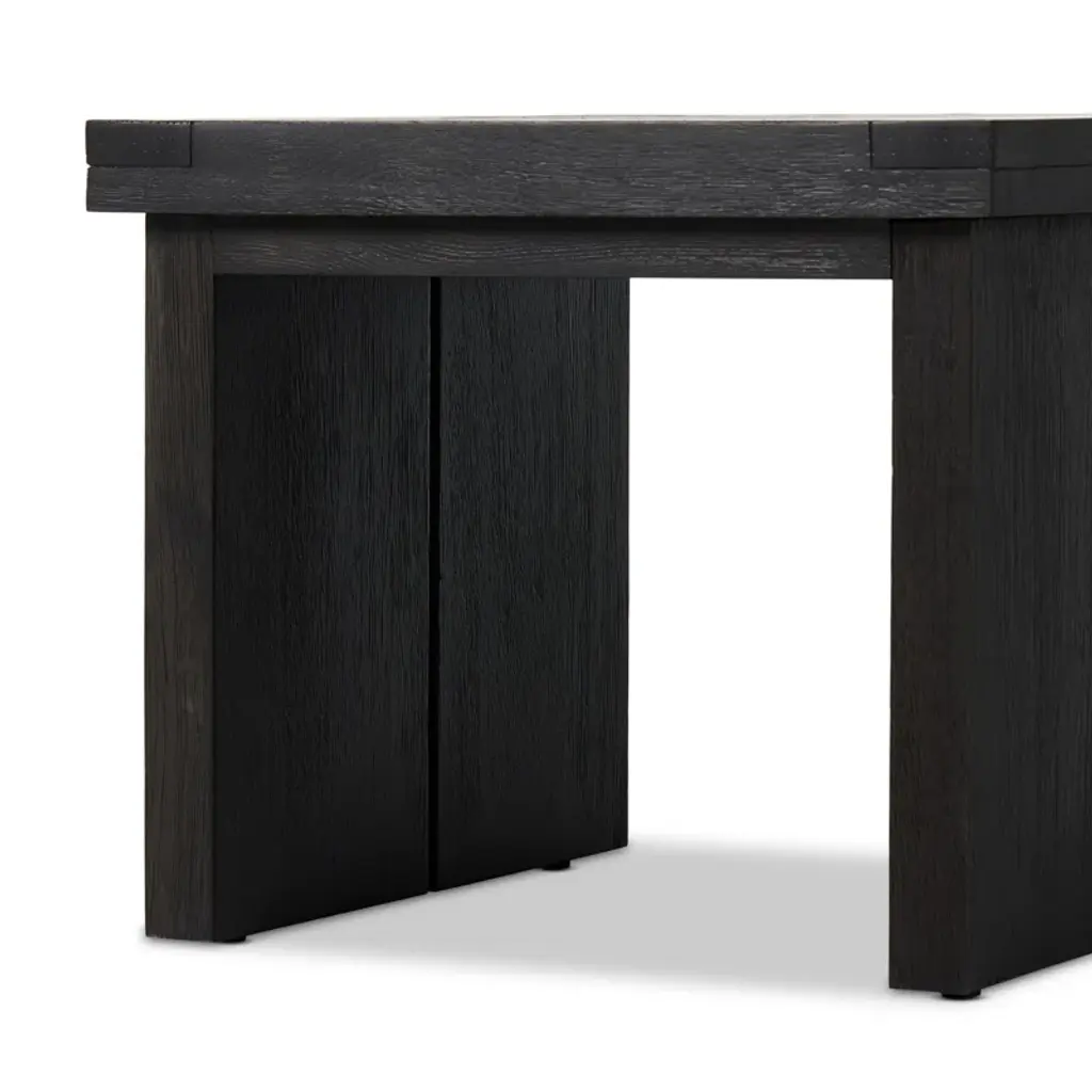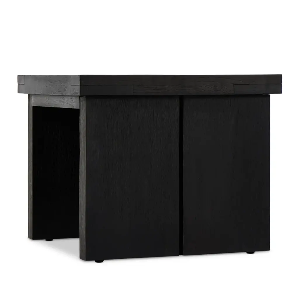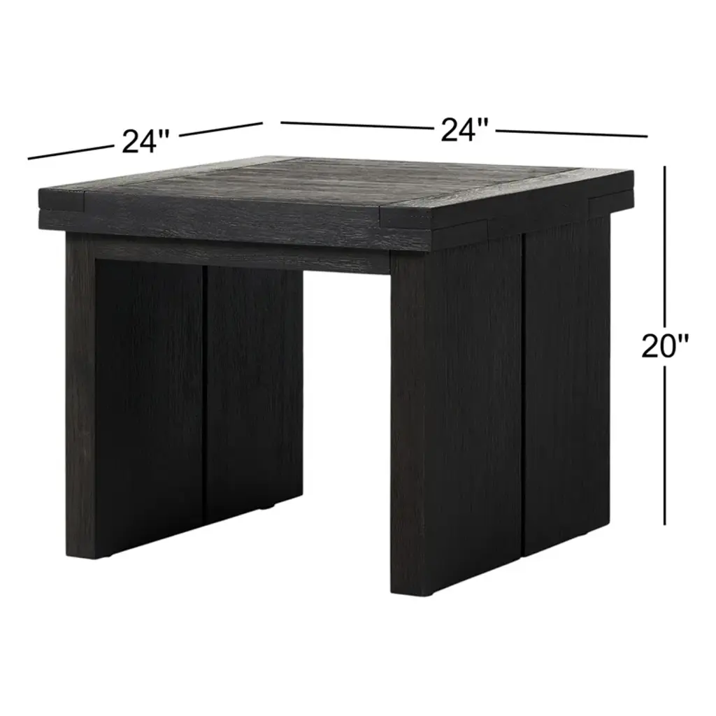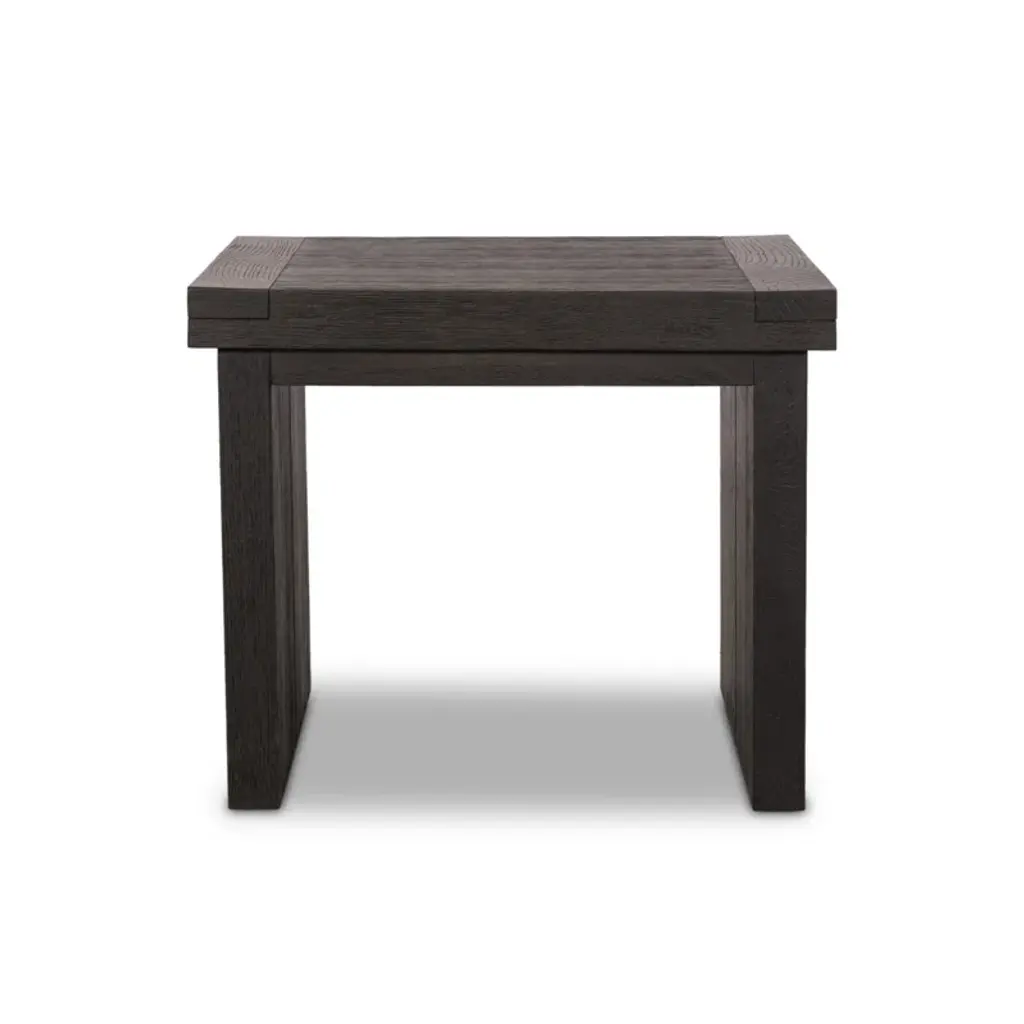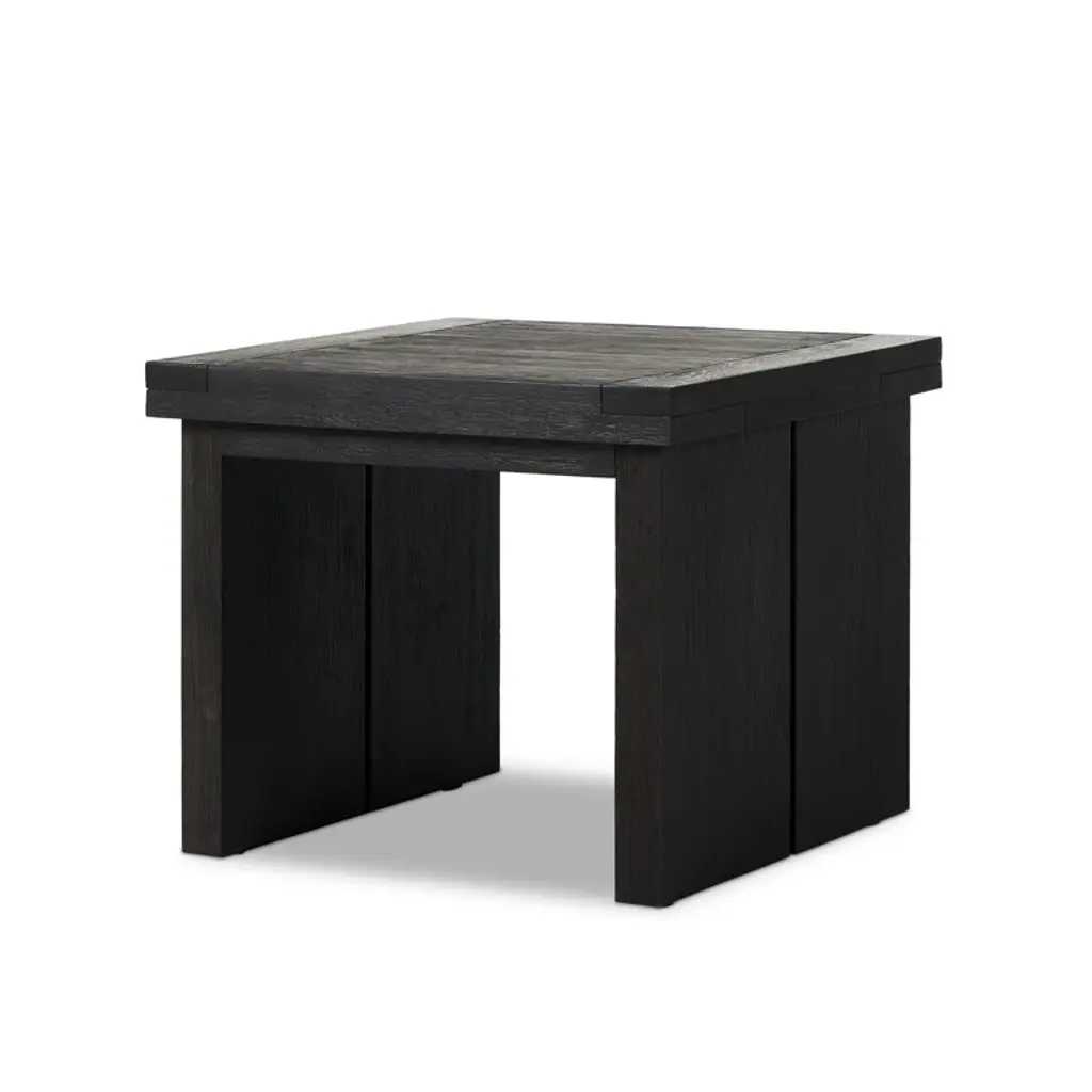 Hardworking industrial furniture inspired the hefty proportions of this solid wood end table. Structured, clean lines with exposed metal hardware add warm contrast.