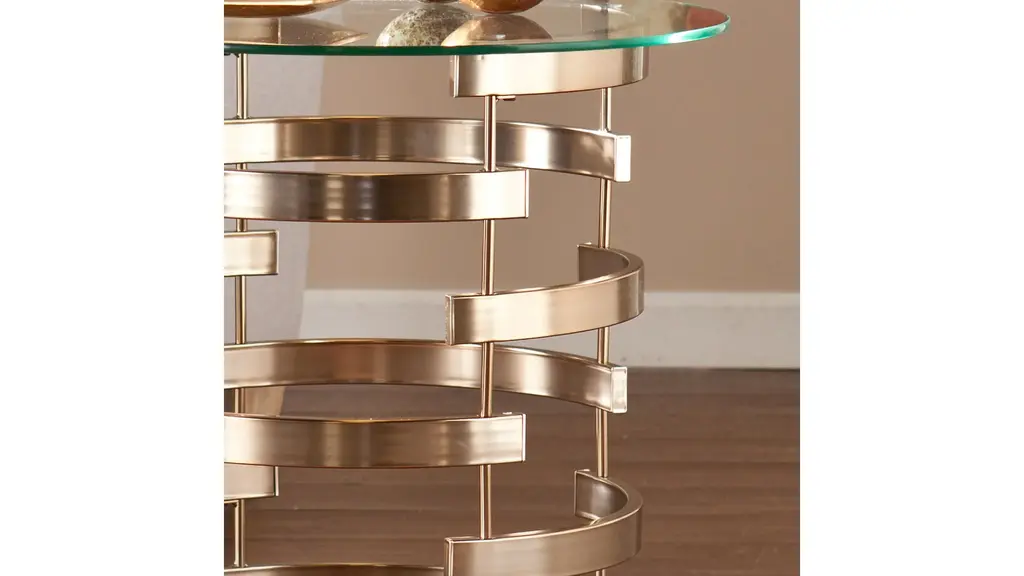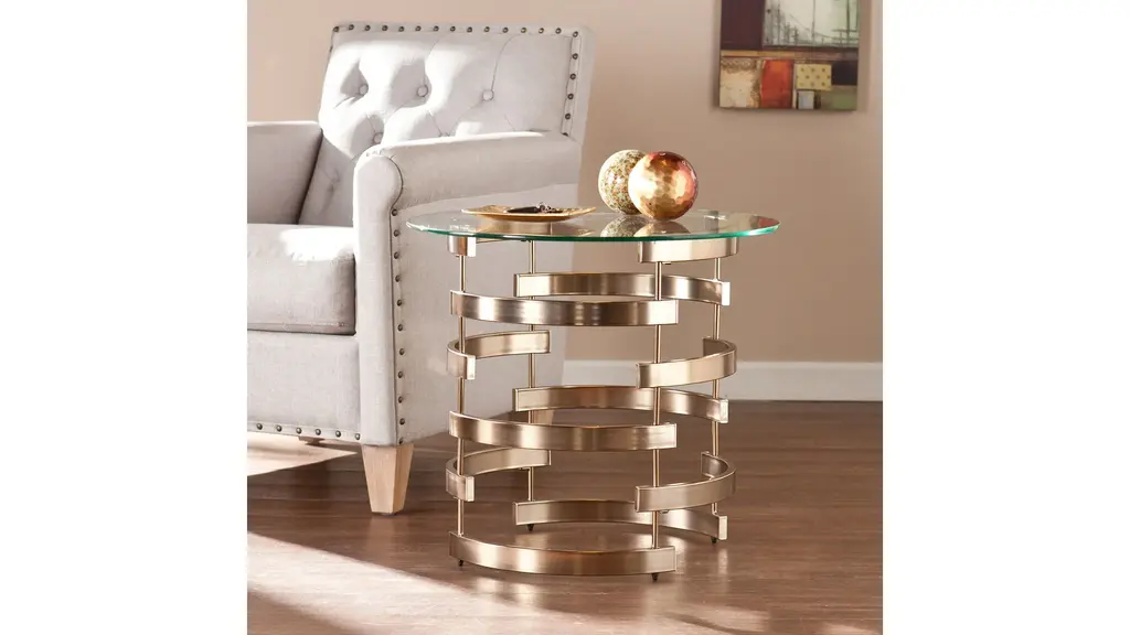 Enhance the look of your contemporary living room with this divine Gosport End Table. Shiny champagne base has an open, interlocking design full of airy negative space. Tempered glass top blends with decor, plus open frame makes it great for smaller living areas. The round shape and abstract style of this end table evoke Art Deco appeal.